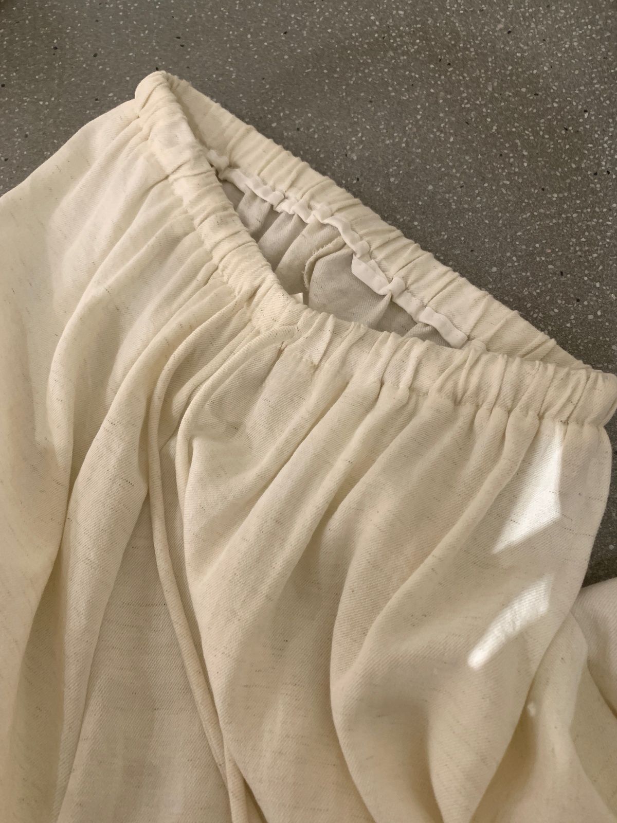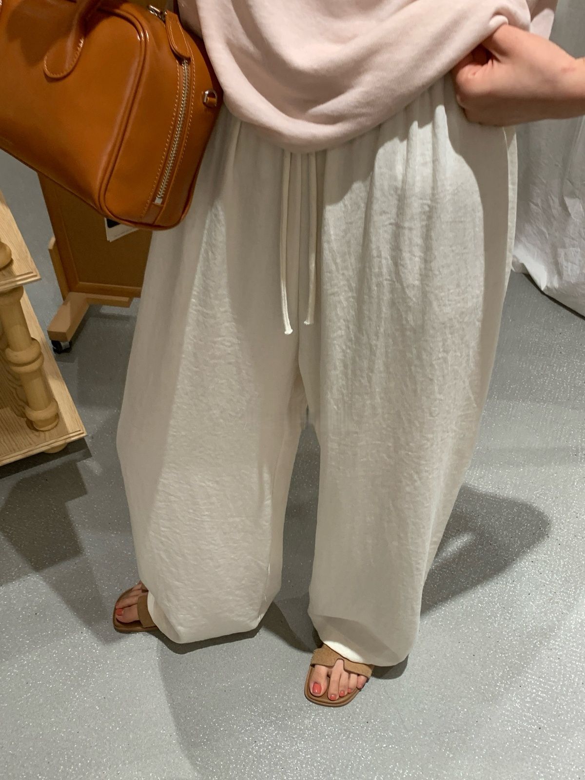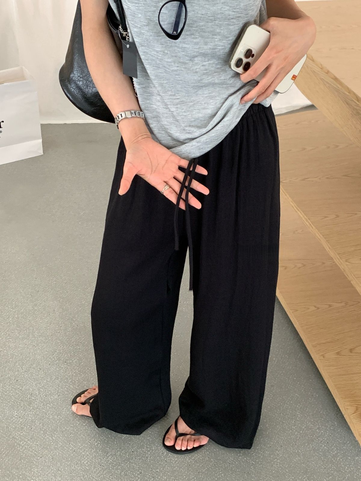 【C73819】品牌 透氣素面直筒褲-抽繩鬆緊腰寬褲管渡假落地長褲