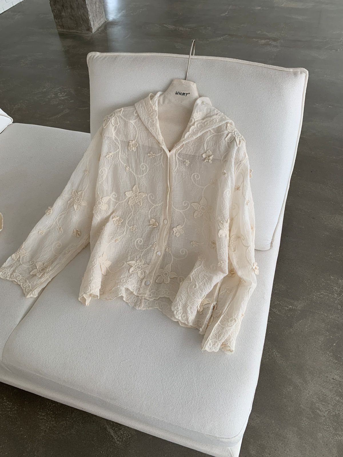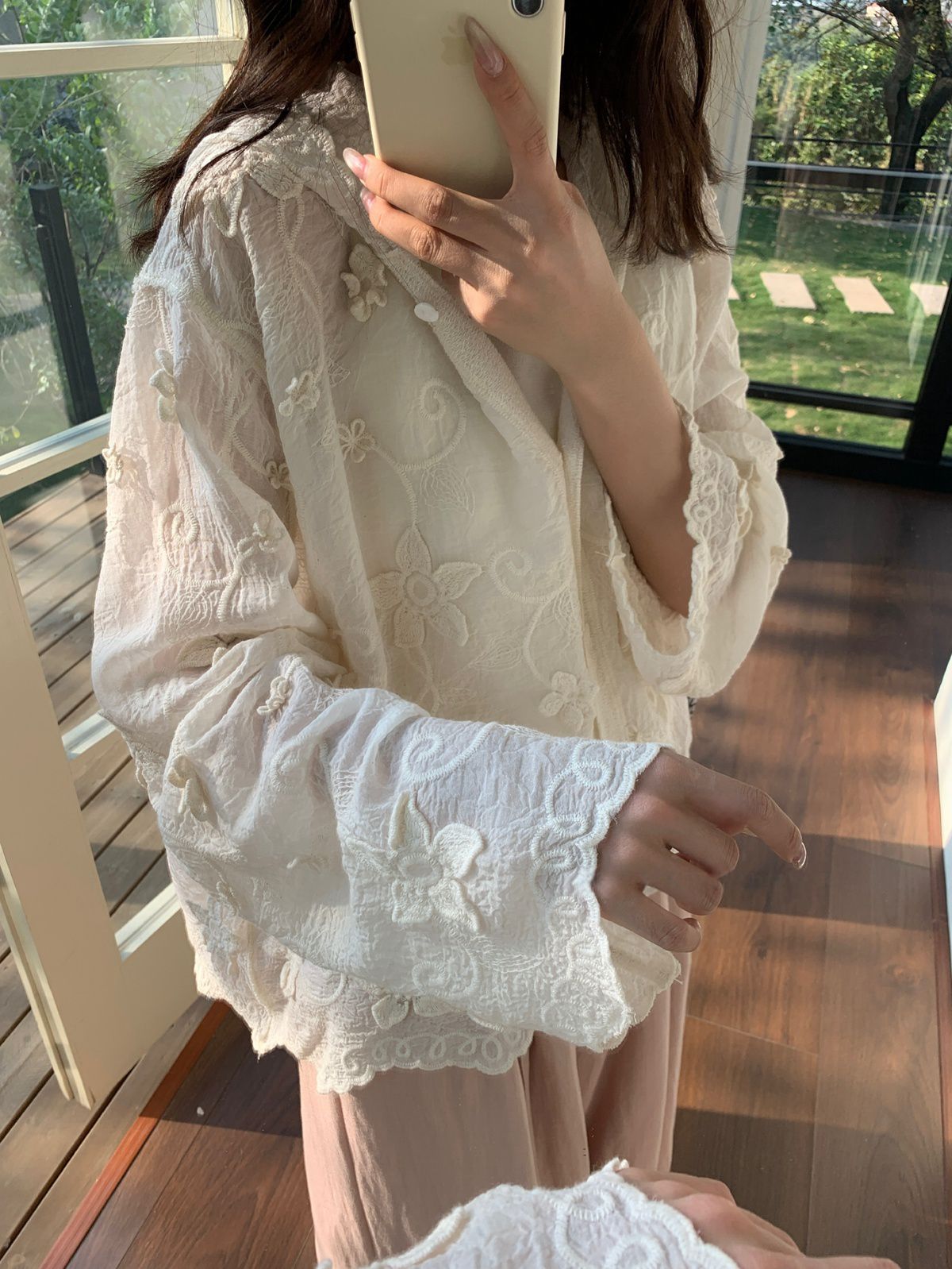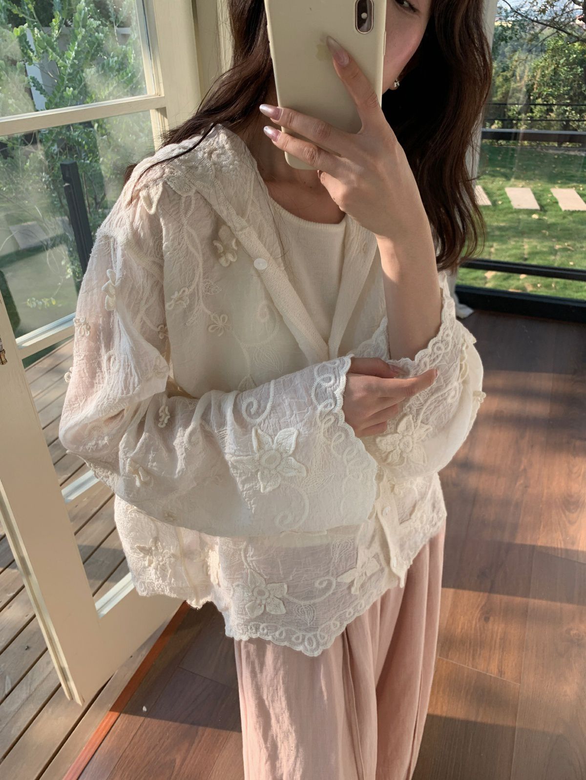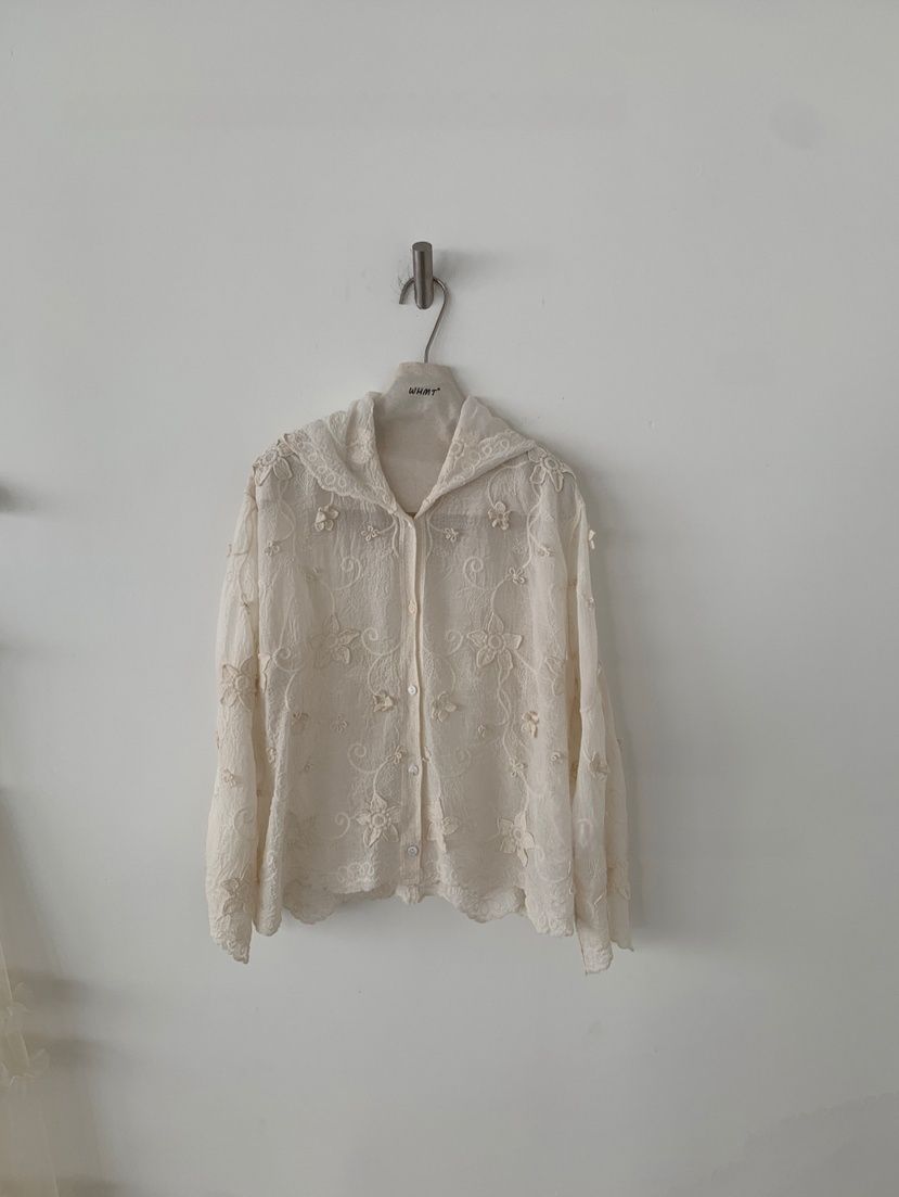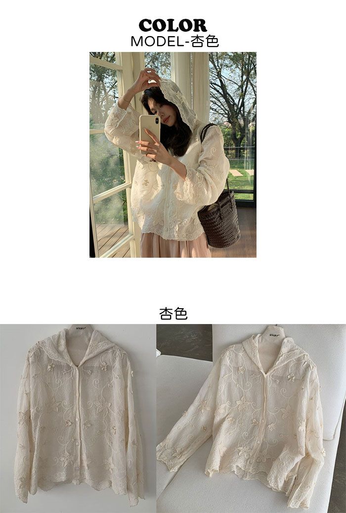 復古色系/立體蕾絲雕花/波浪花邊/連帽/開襟排釦 - 休閒居家簡約百搭素面渡假復古蕾絲襯衫上衣襯衫外套長袖上衣長袖外套連帽上衣連帽外套杏色