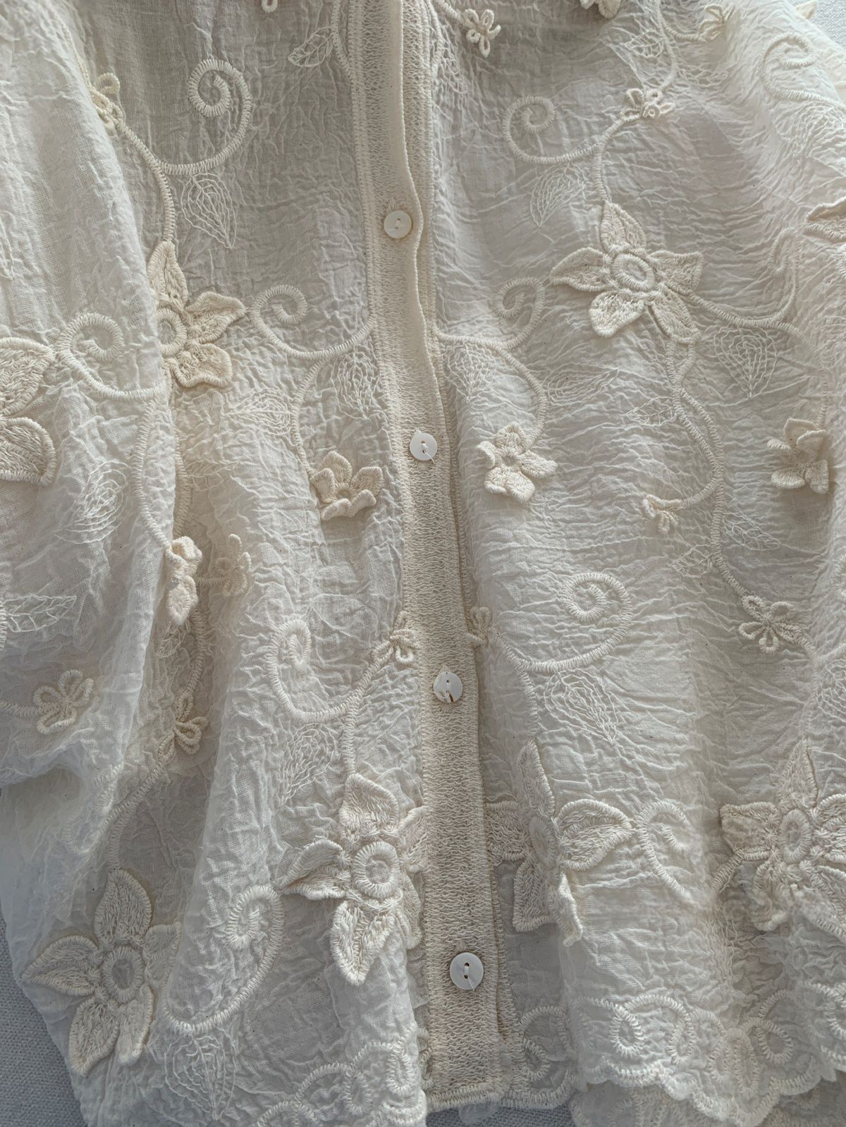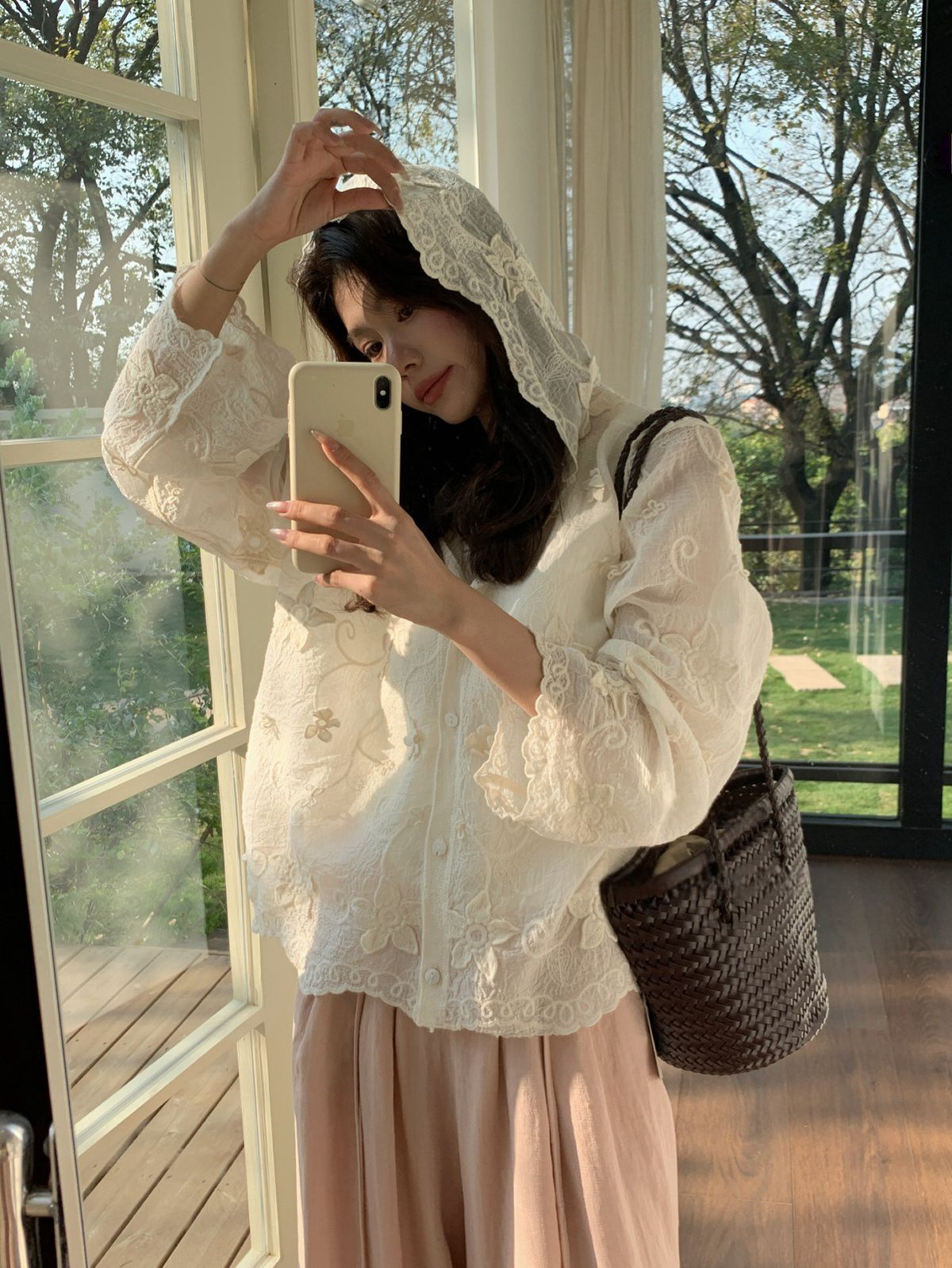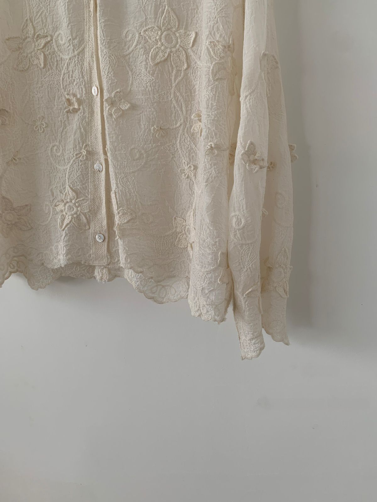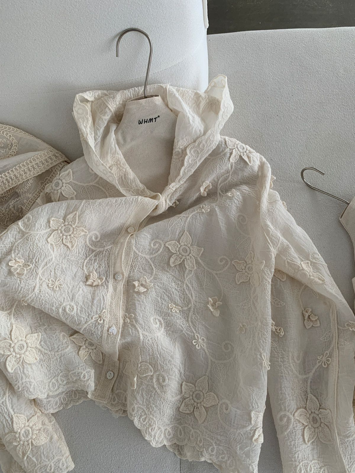 復古色系/立體蕾絲雕花/波浪花邊/連帽/開襟排釦 - 休閒居家簡約百搭素面渡假復古蕾絲襯衫上衣襯衫外套長袖上衣長袖外套連帽上衣連帽外套杏色