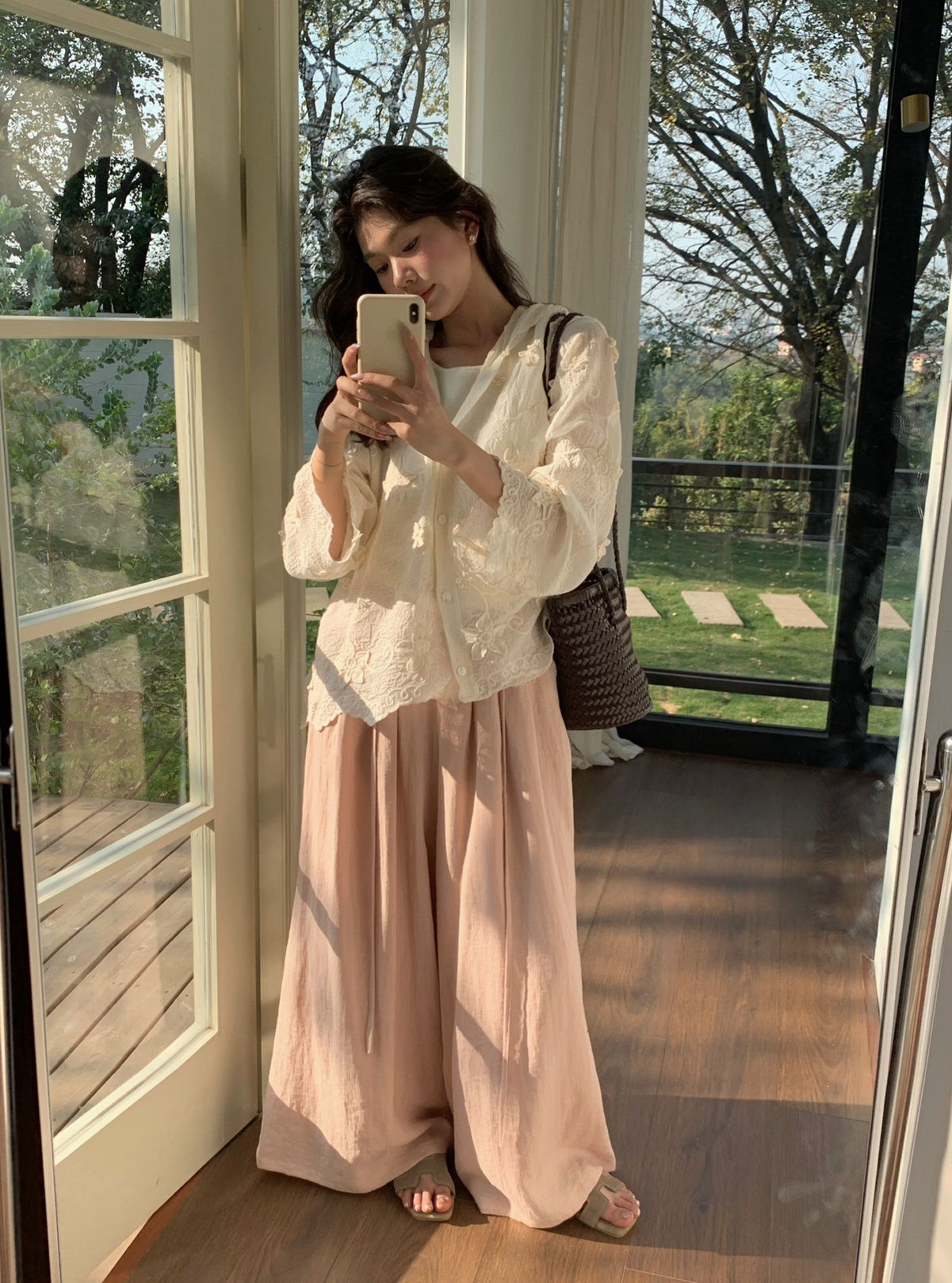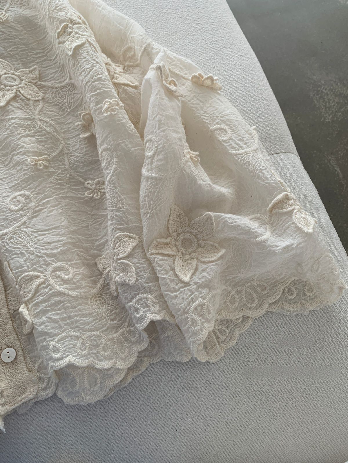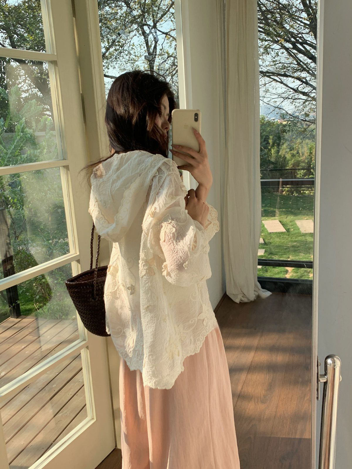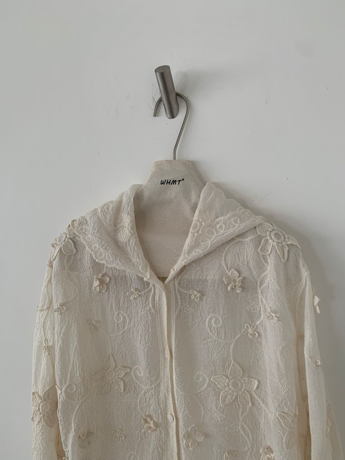 復古色系/立體蕾絲雕花/波浪花邊/連帽/開襟排釦 - 休閒居家簡約百搭素面渡假復古蕾絲襯衫上衣襯衫外套長袖上衣長袖外套連帽上衣連帽外套杏色