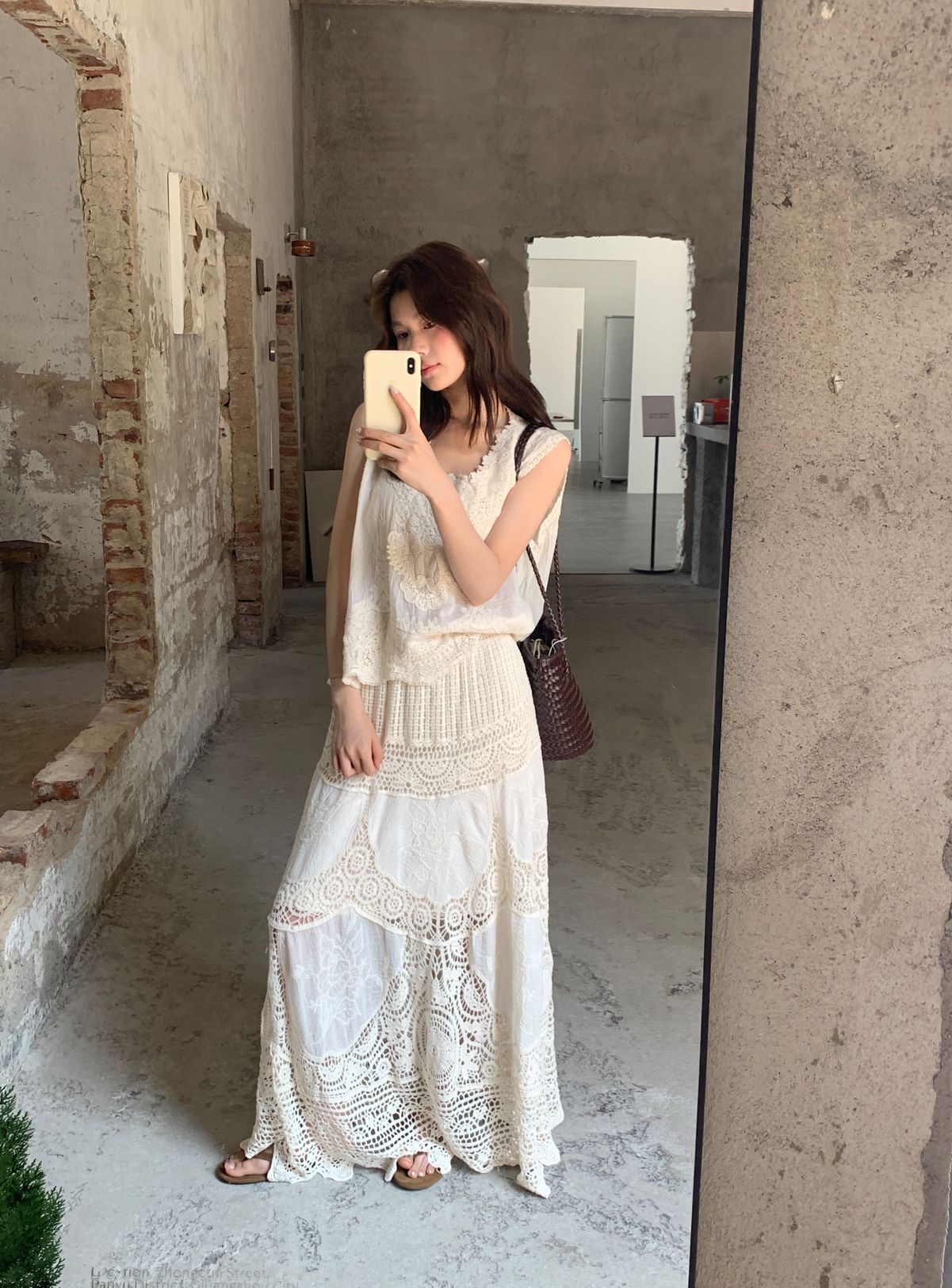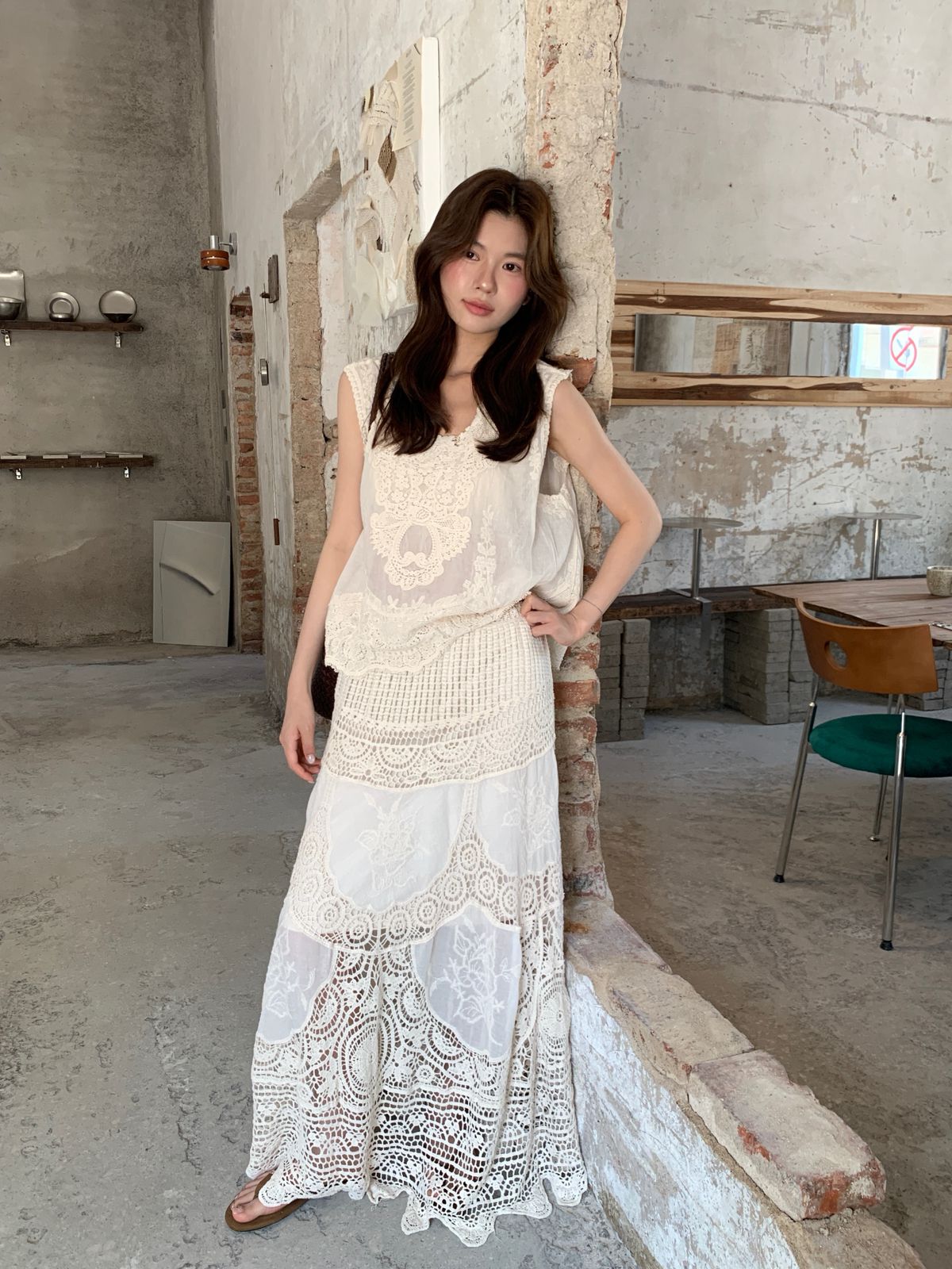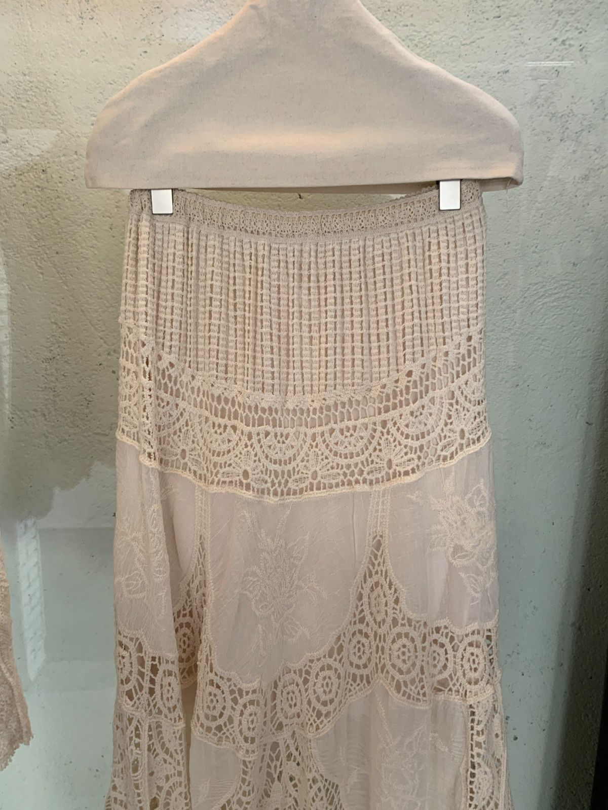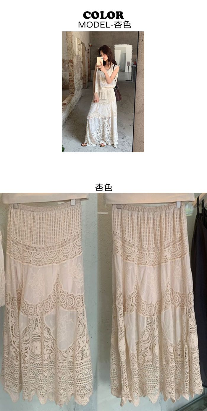 復古色系/立體蕾絲雕花/波浪花邊/縷空雕花/A字傘狀長裙/全腰鬆緊 - 休閒居家渡假婚禮簡約百搭素面縷空雕花長裙傘狀長裙杏色