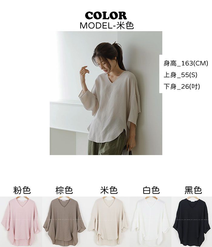 立體剪裁/弧形下襬/寬鬆長版/前短後長/側開衩/落肩寬袖/七分袖/飛鼠袖/V領/好氣色 - 休閒居家簡約百搭素面圓弧飛鼠袖上衣寬鬆大尺碼上衣七分袖上衣粉色白色米色棕色黑色
