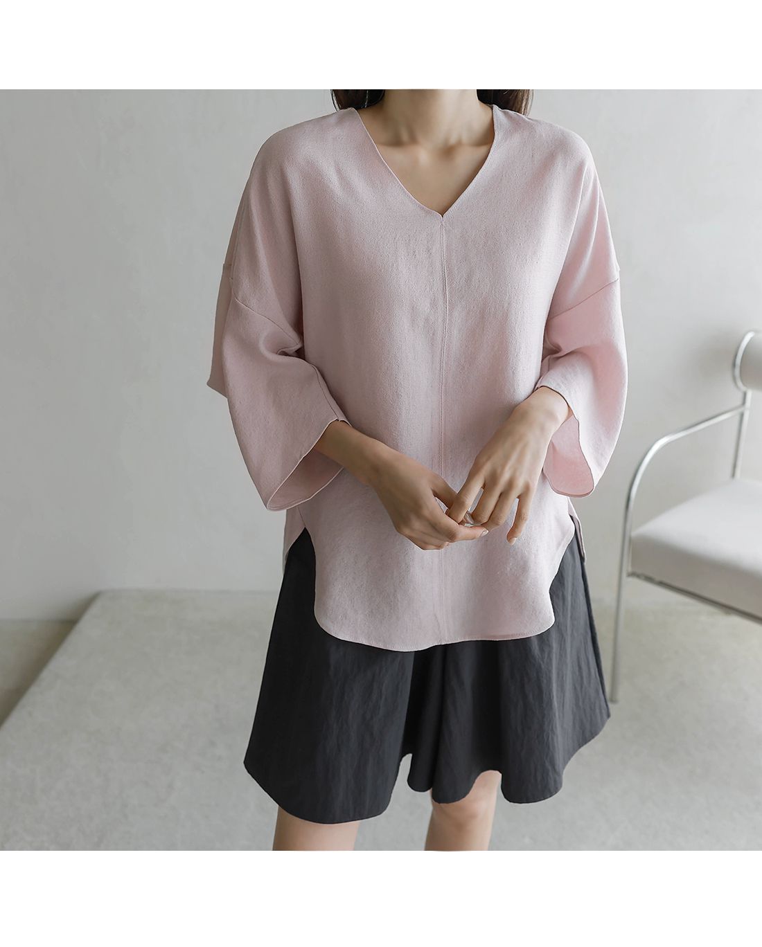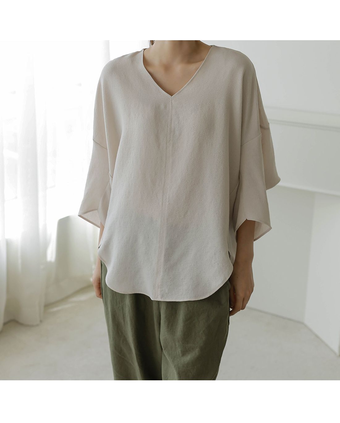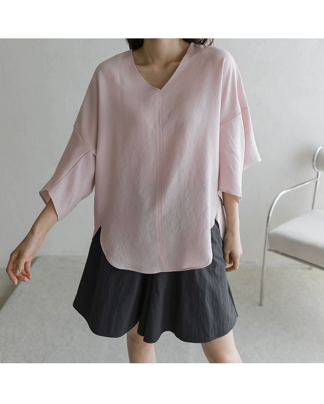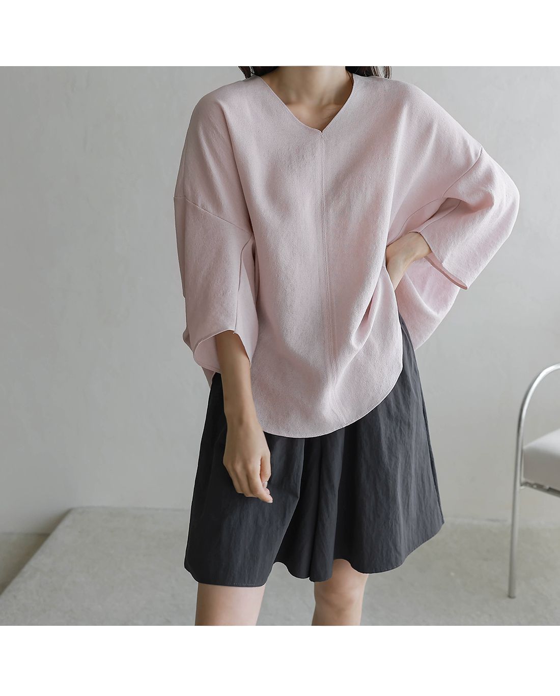 【C54890】韓國BLG 圓弧飛鼠袖上衣-寬鬆長版素面好氣色V領七分寬袖
