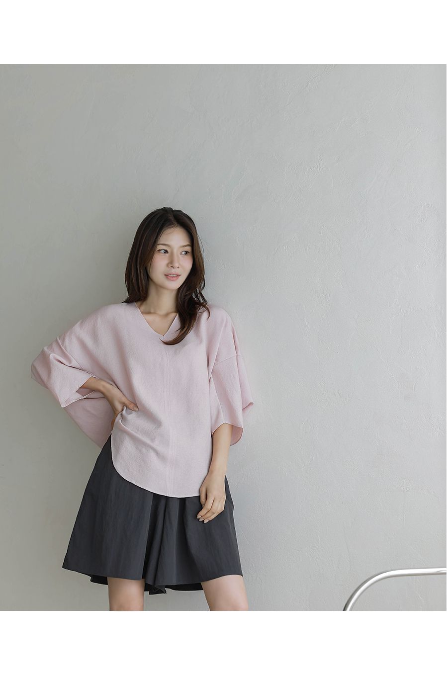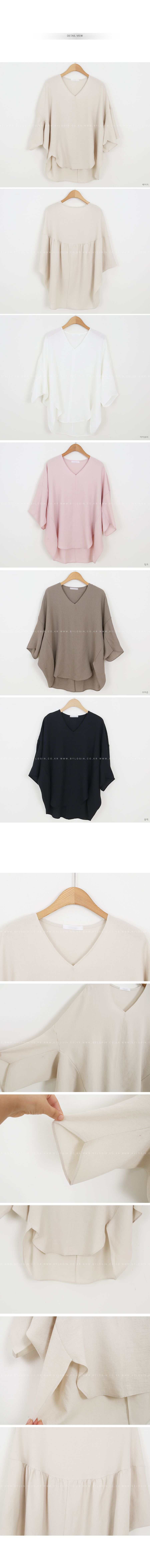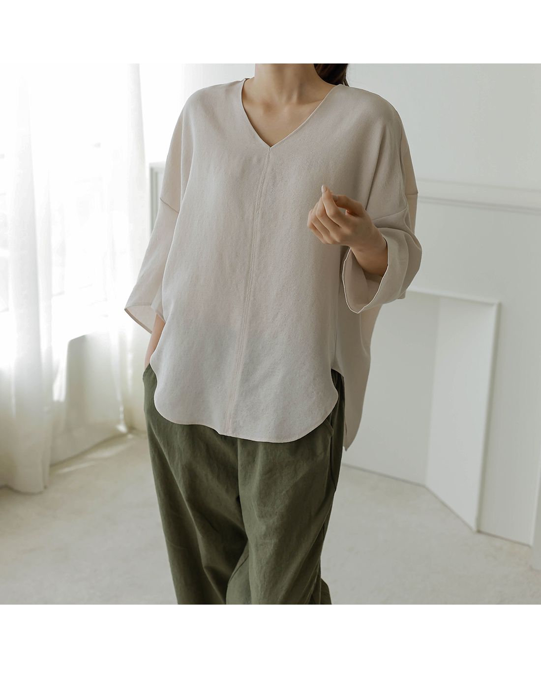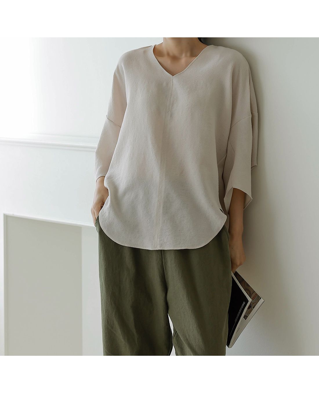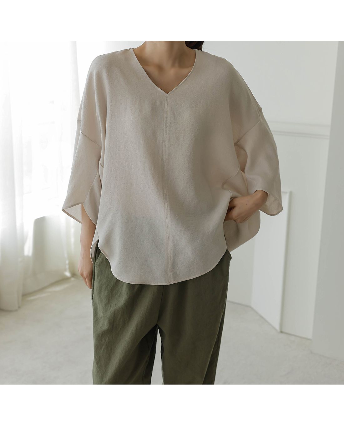 【C54890】韓國BLG 圓弧飛鼠袖上衣-寬鬆長版素面好氣色V領七分寬袖