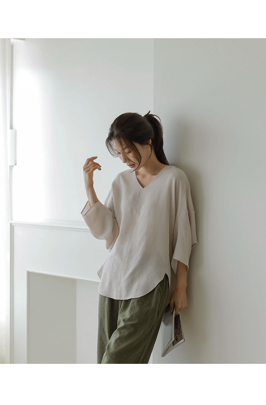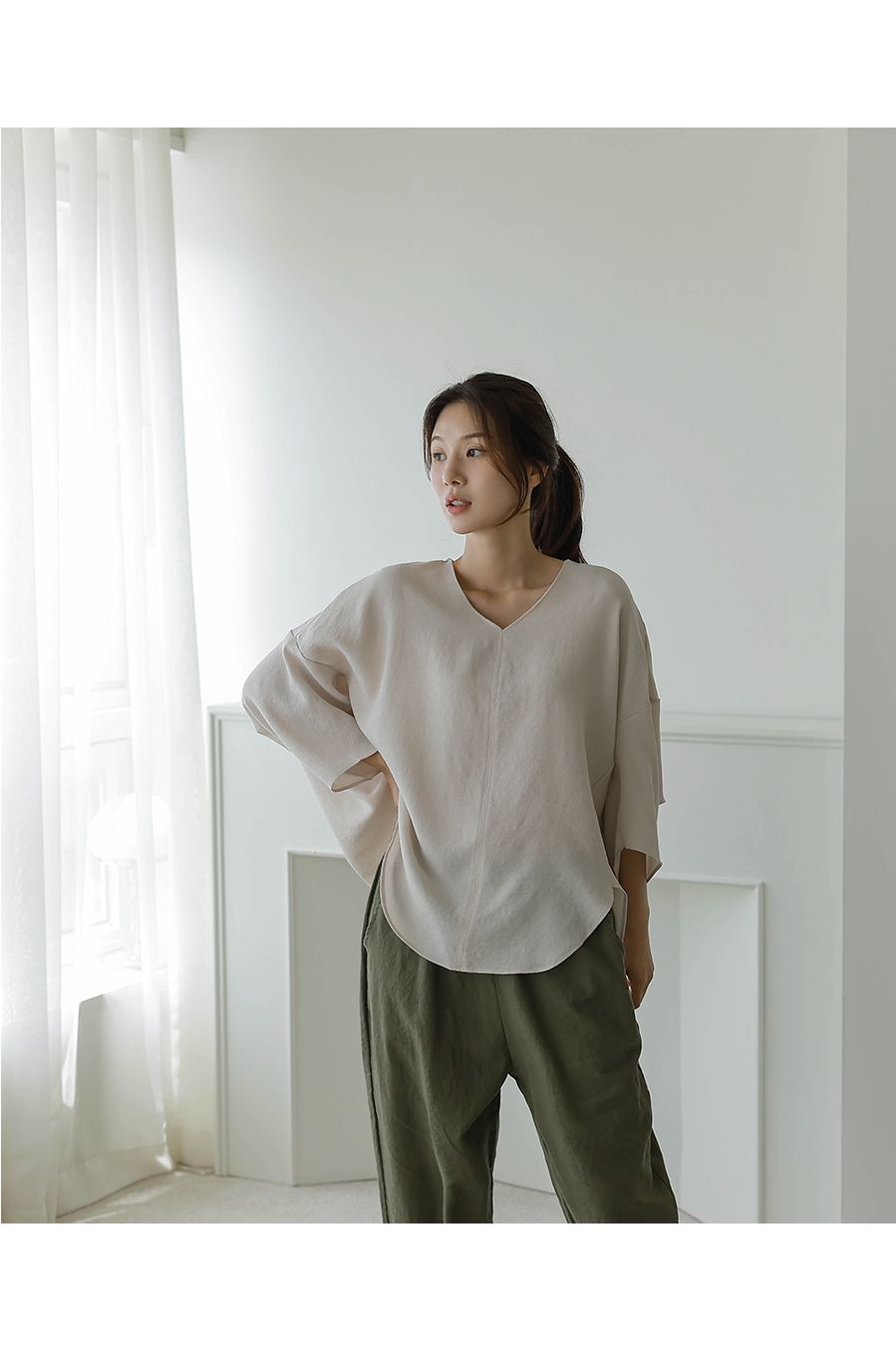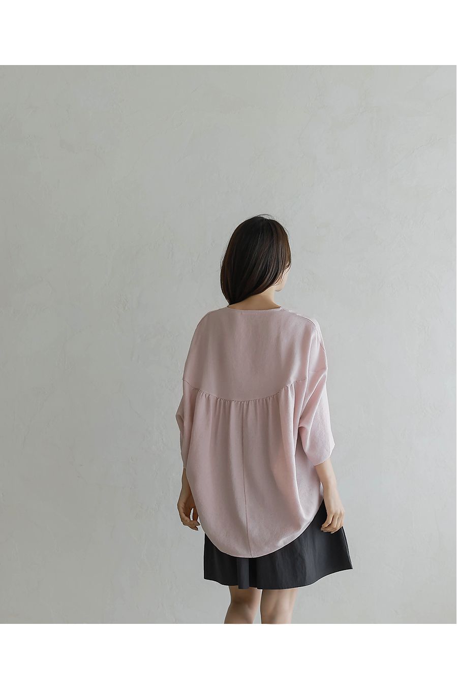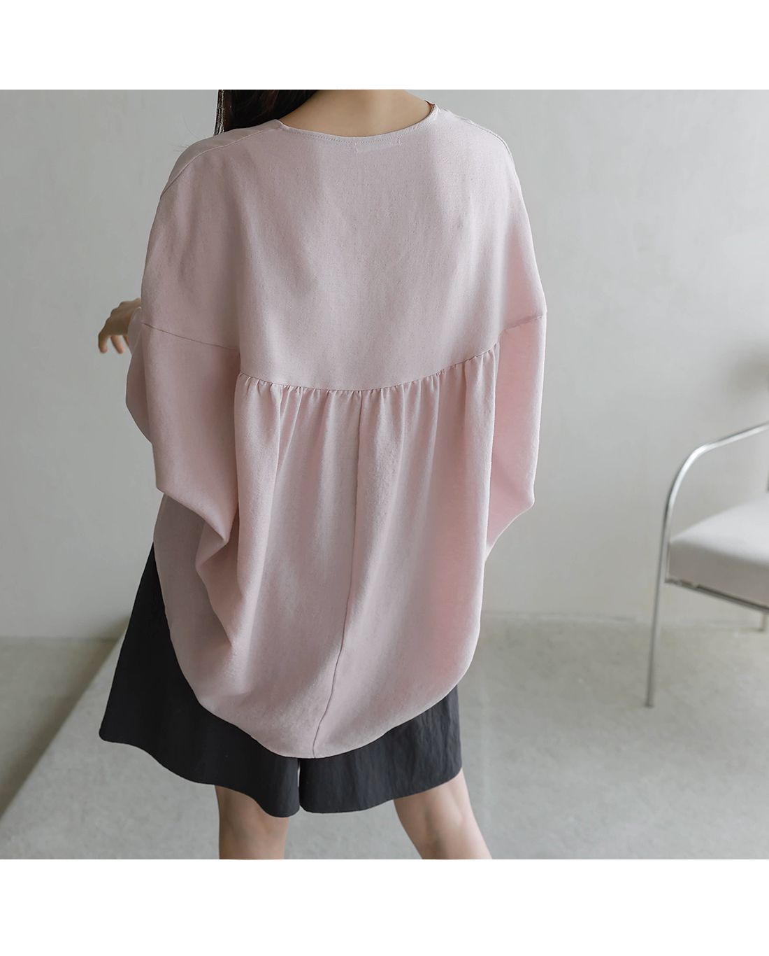 【C54890】韓國BLG 圓弧飛鼠袖上衣-寬鬆長版素面好氣色V領七分寬袖