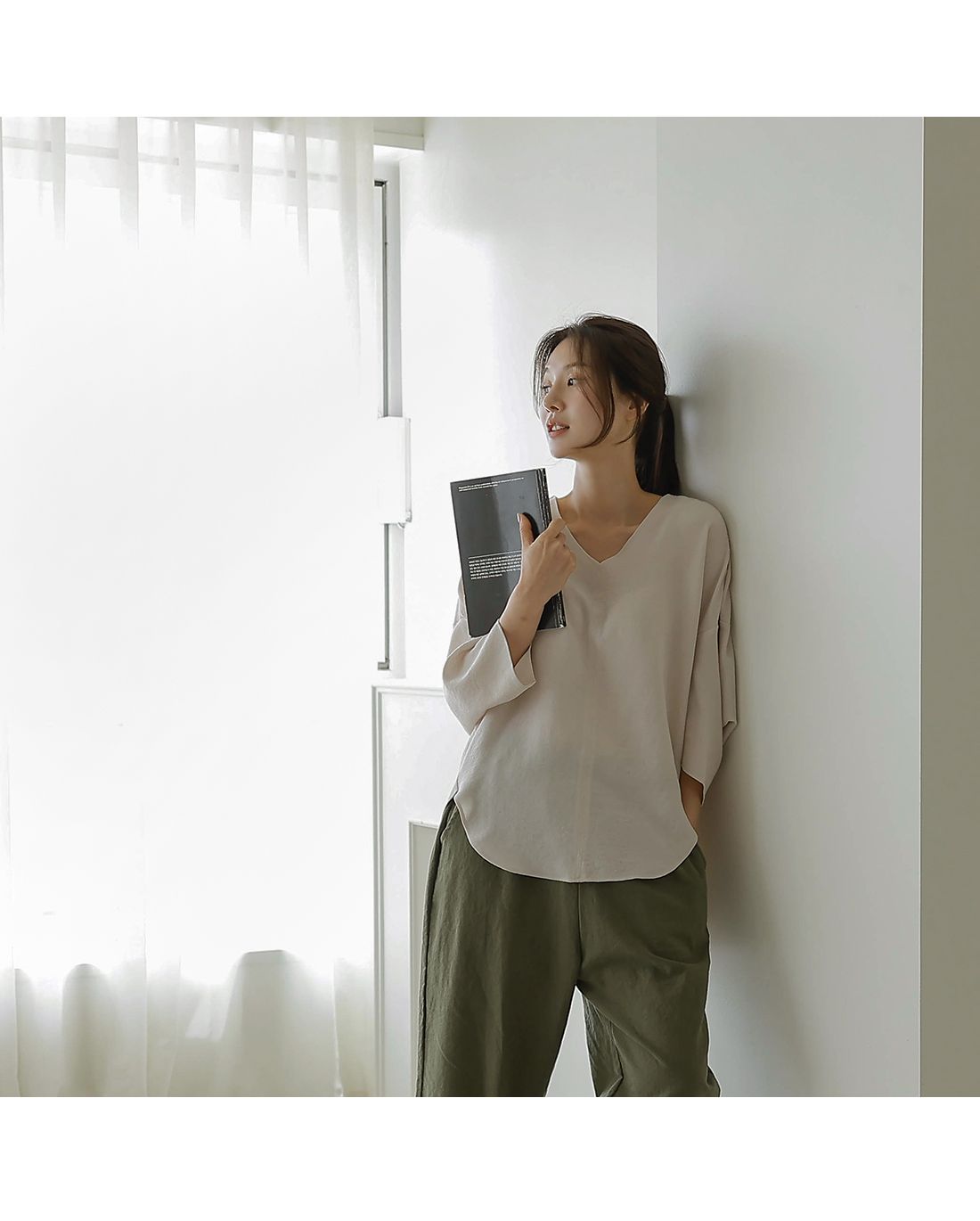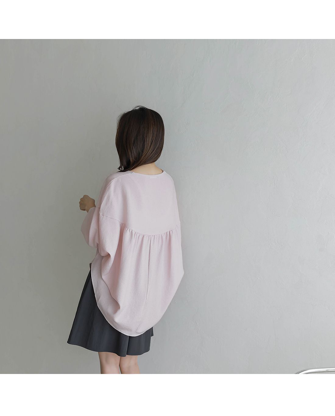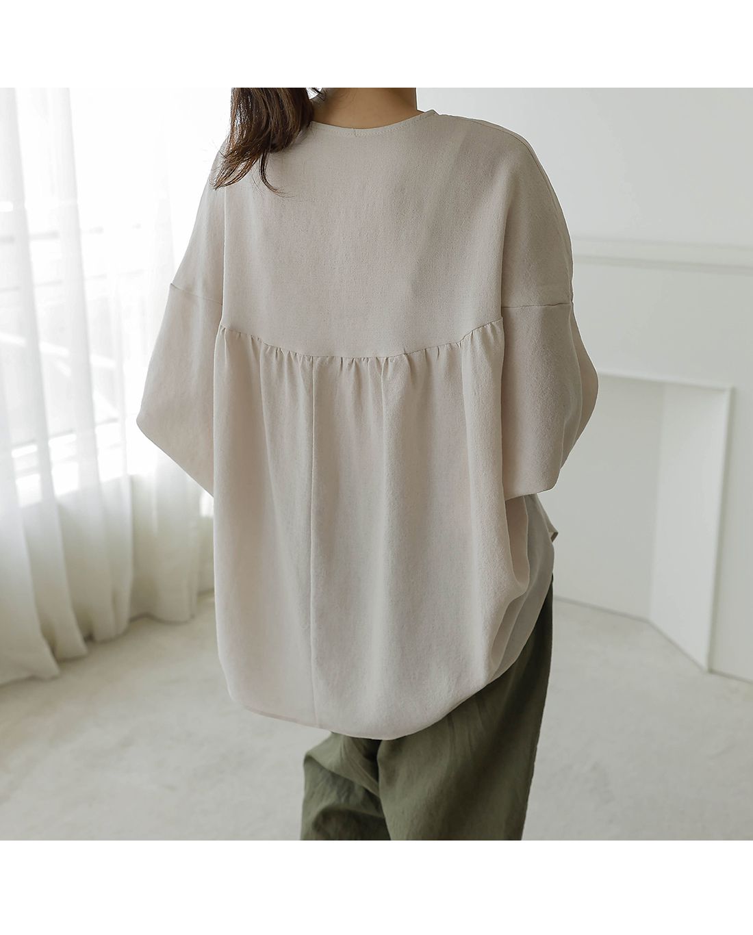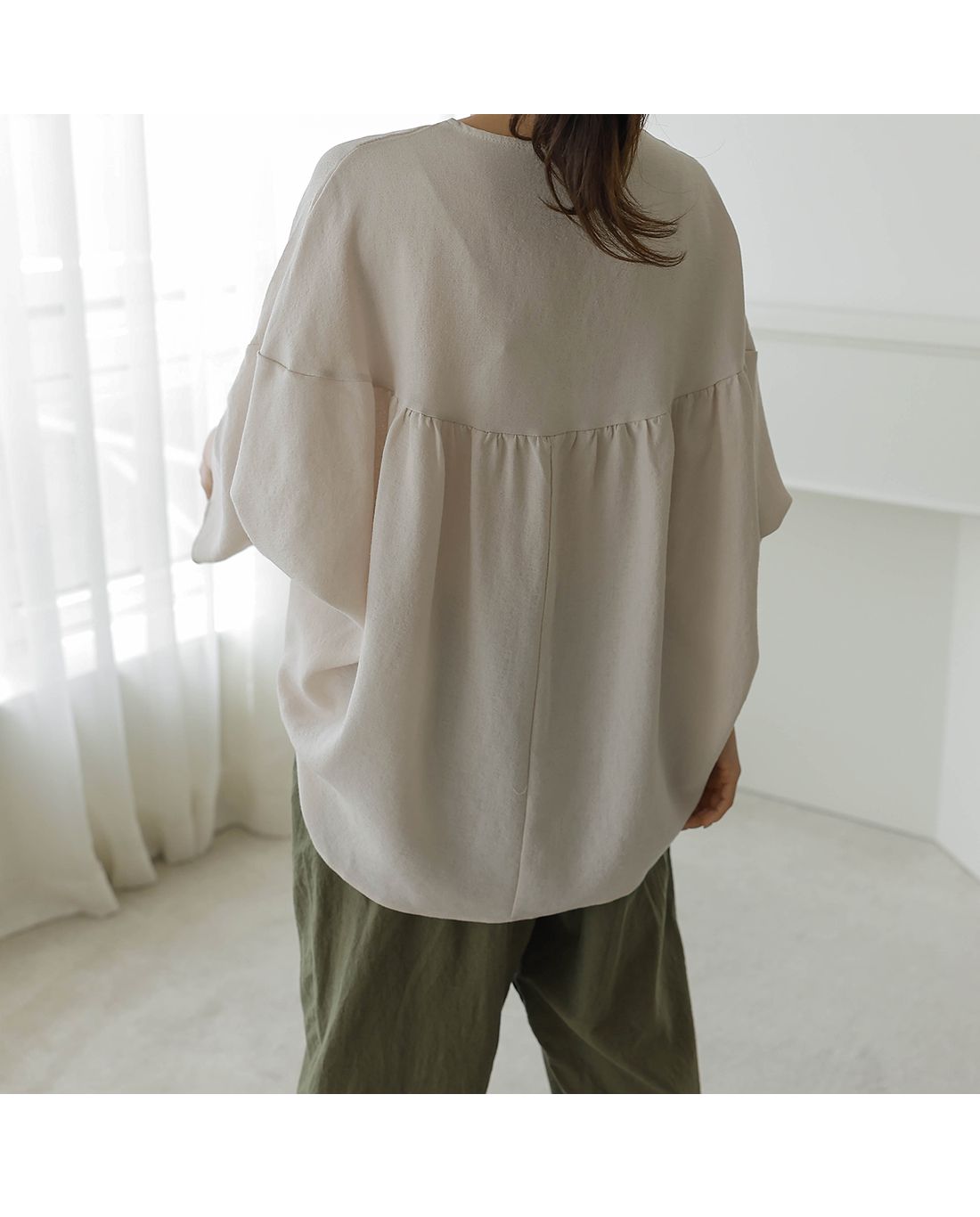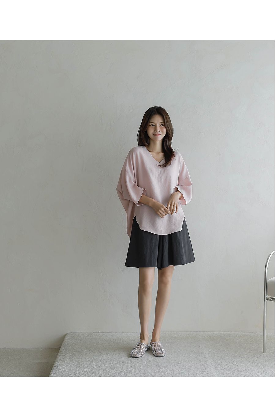 【C54890】韓國BLG 圓弧飛鼠袖上衣-寬鬆長版素面好氣色V領七分寬袖