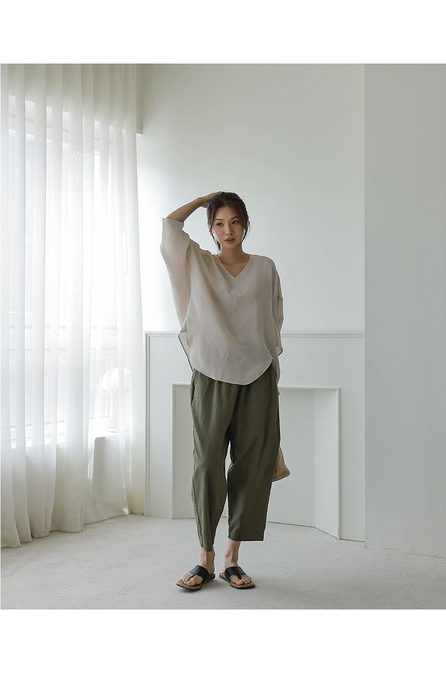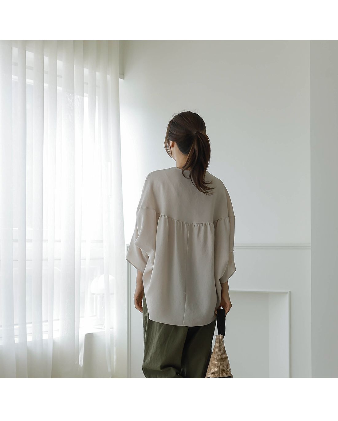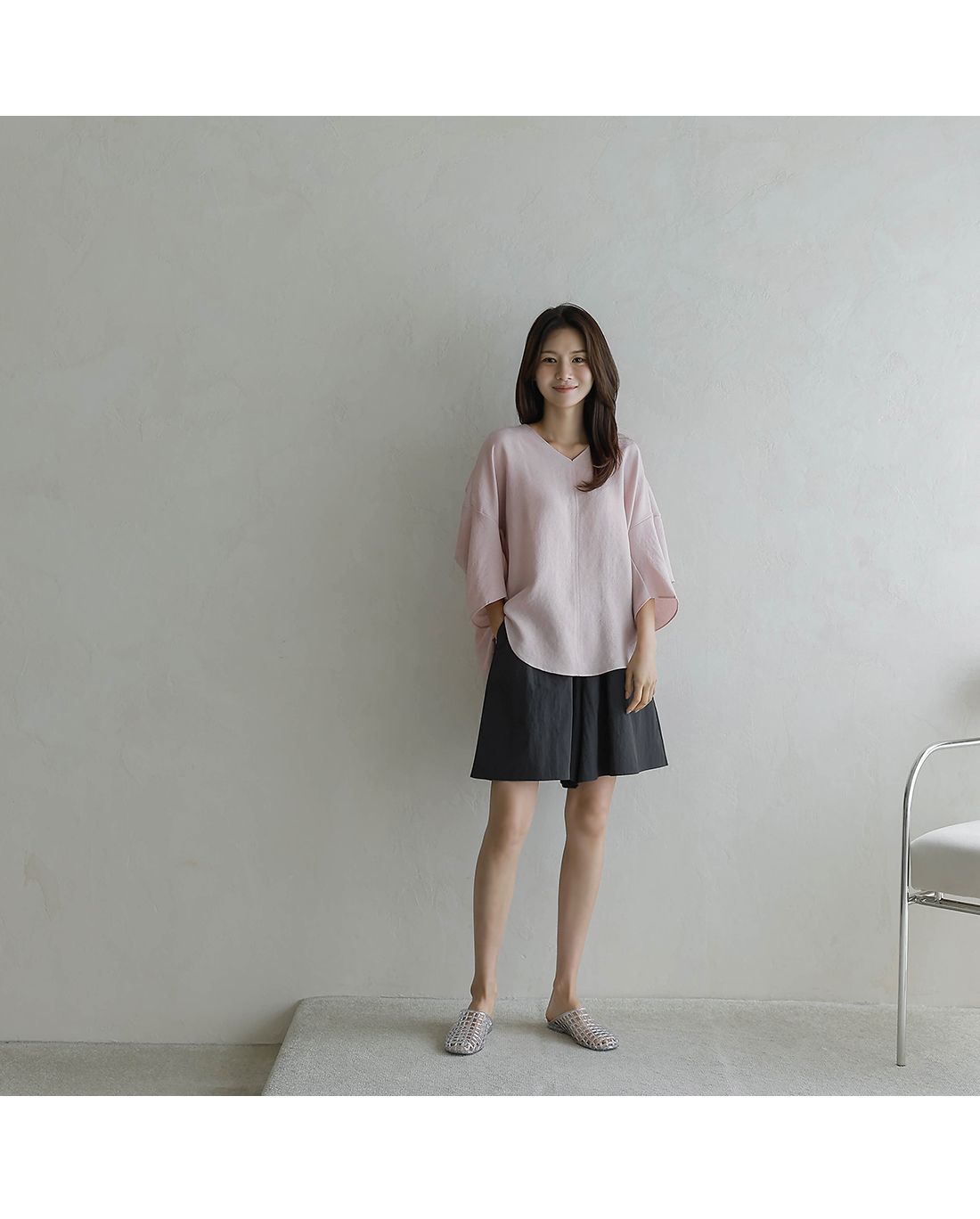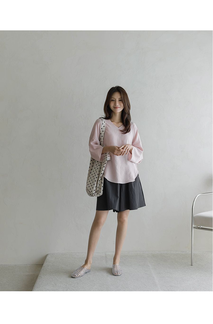 【C54890】韓國BLG 圓弧飛鼠袖上衣-寬鬆長版素面好氣色V領七分寬袖