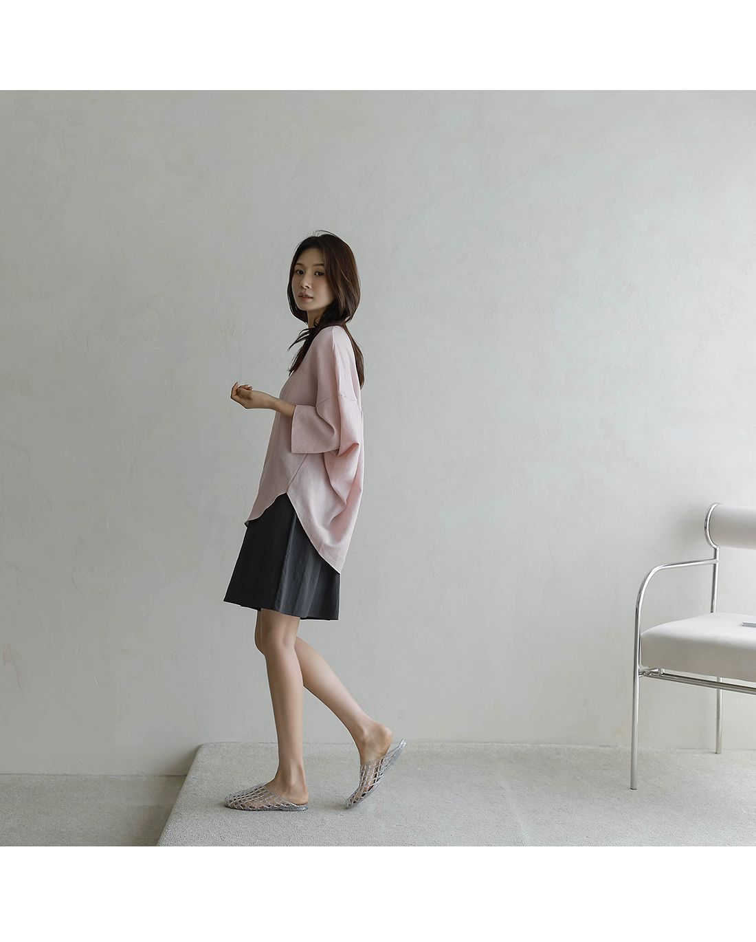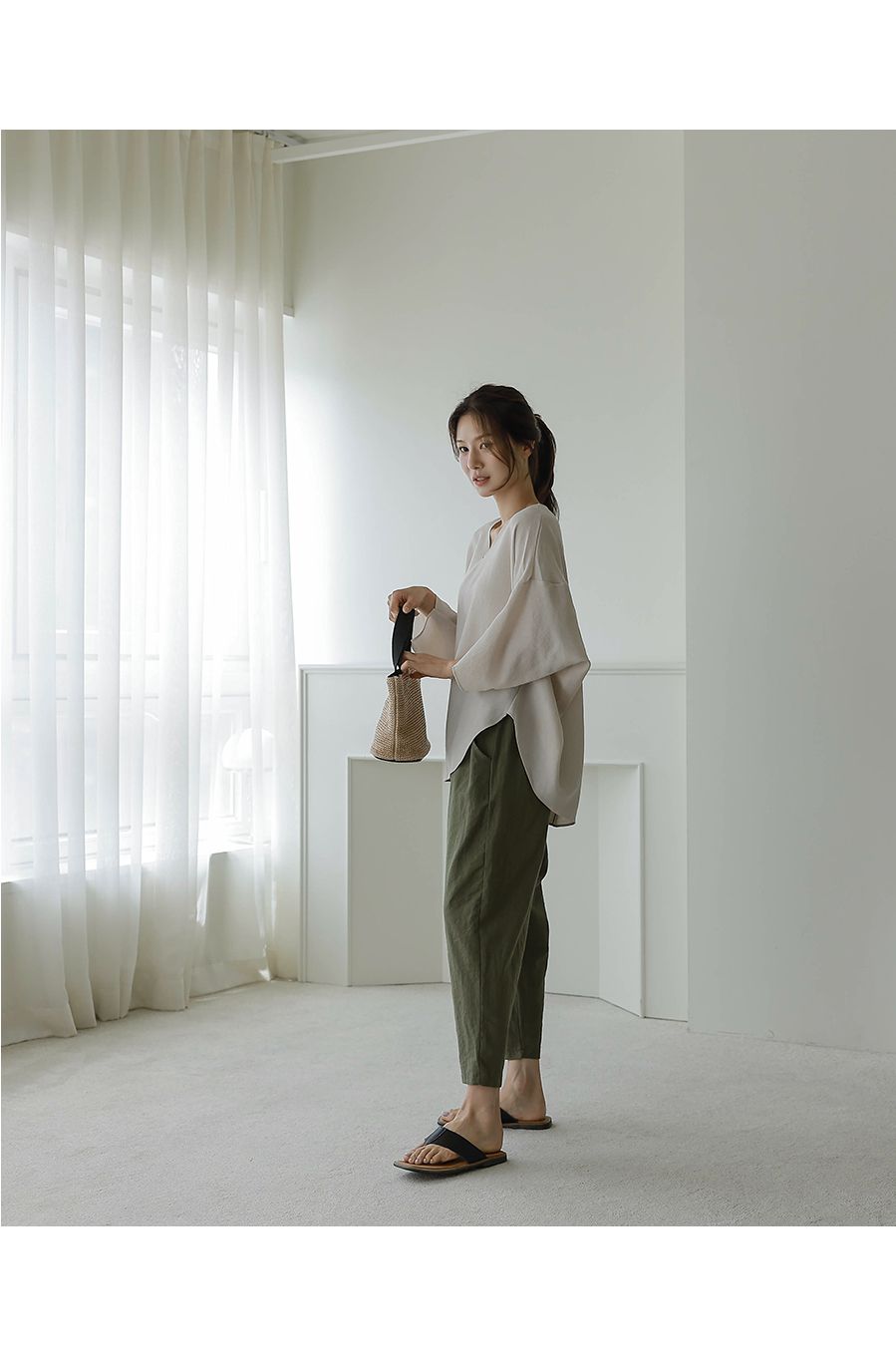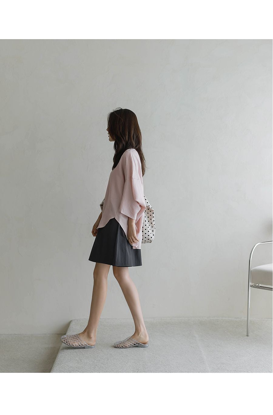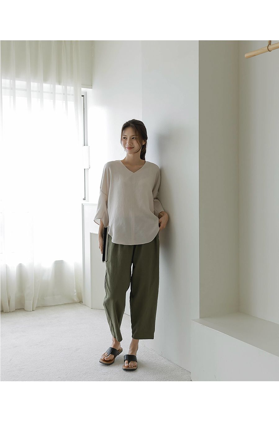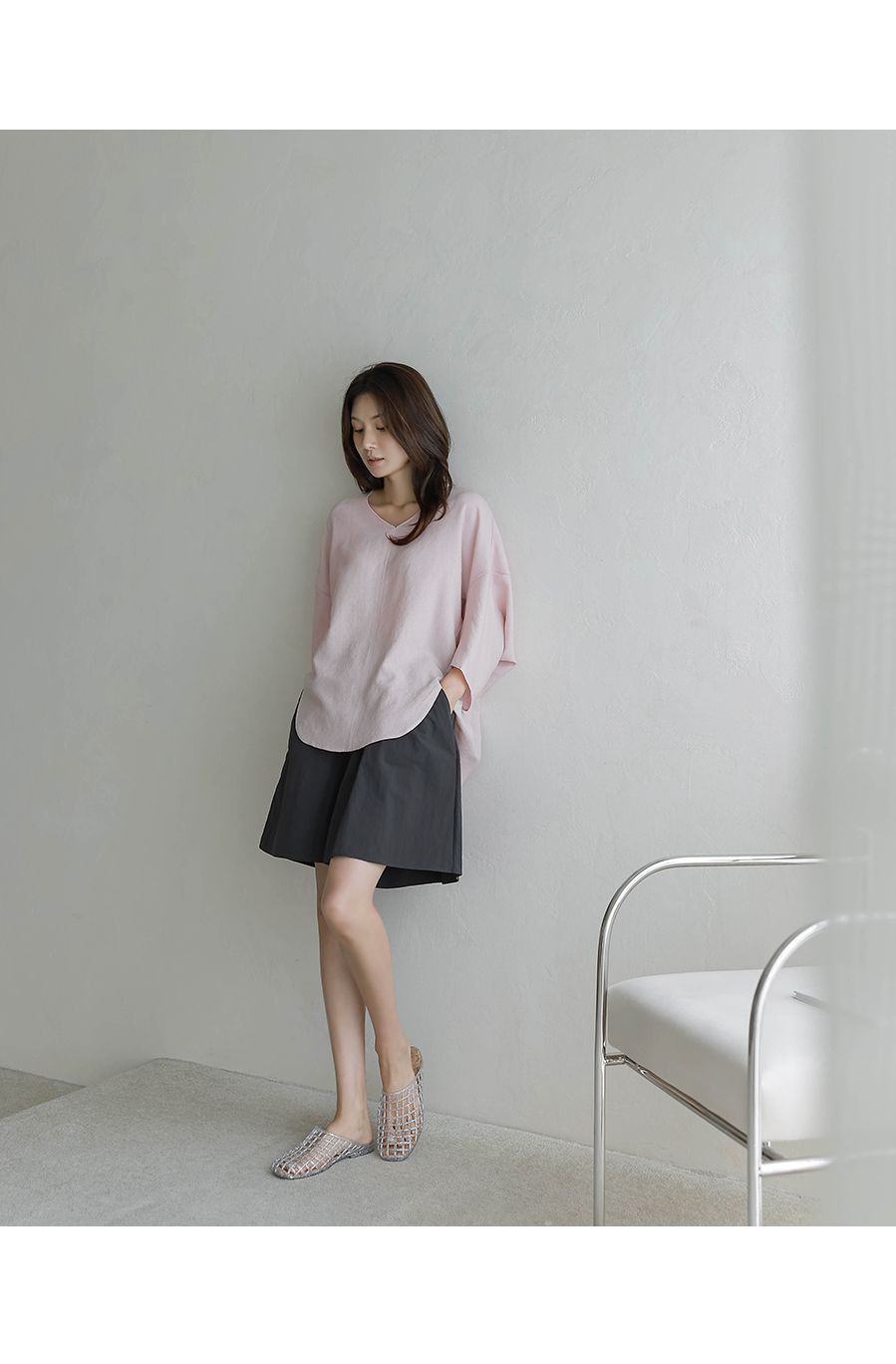 【C54890】韓國BLG 圓弧飛鼠袖上衣-寬鬆長版素面好氣色V領七分寬袖