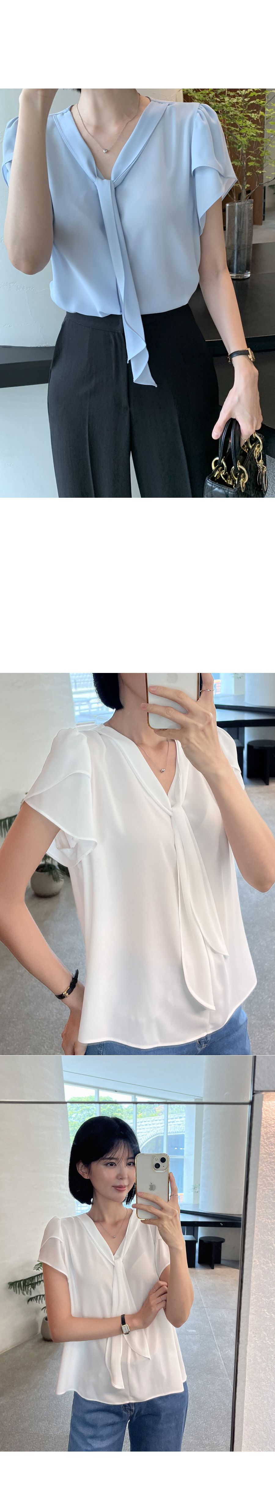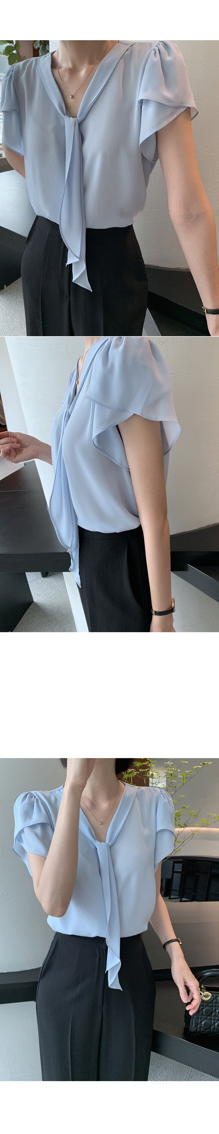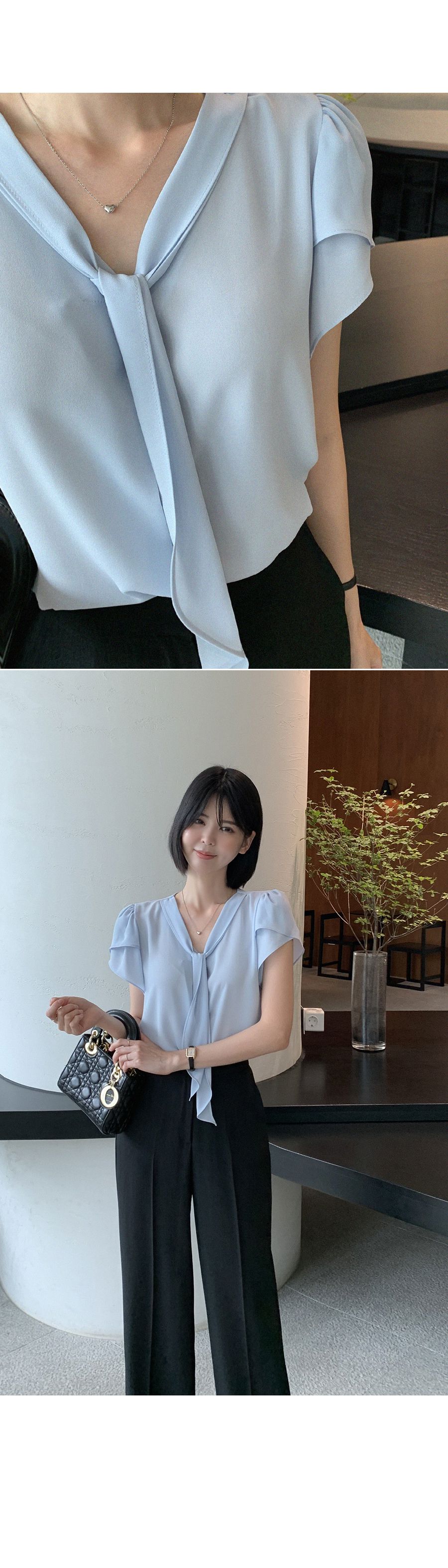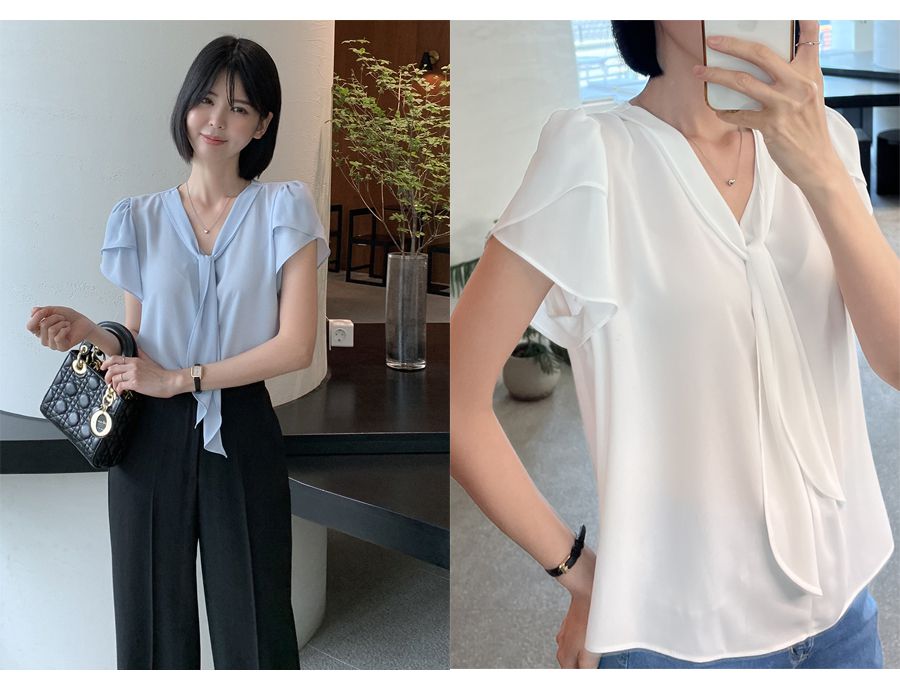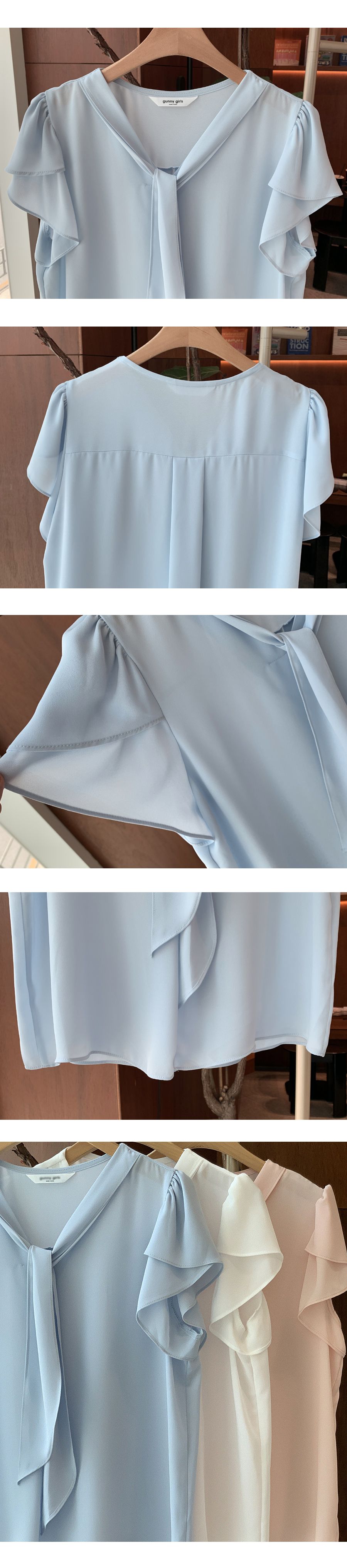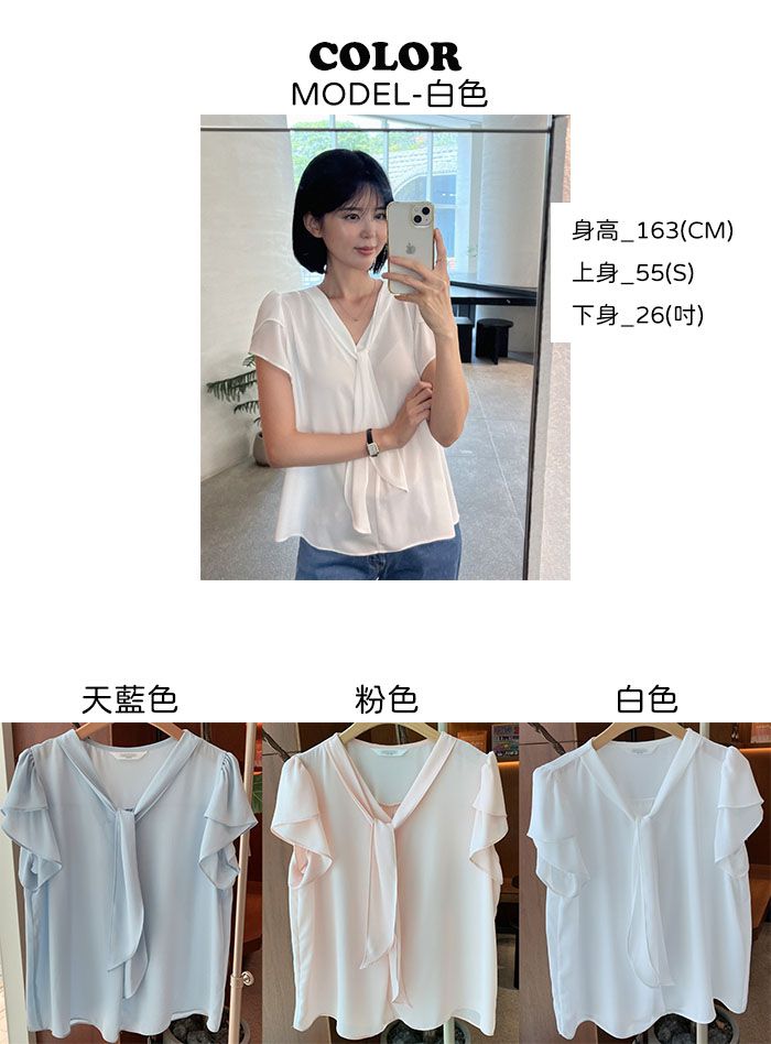 綁帶V領/織帶領結/花瓣袖/荷葉袖/後背打褶 - 休閒OL上班族簡約百搭素面領結雪紡衫雪紡上衣短袖上衣天藍色粉色白色