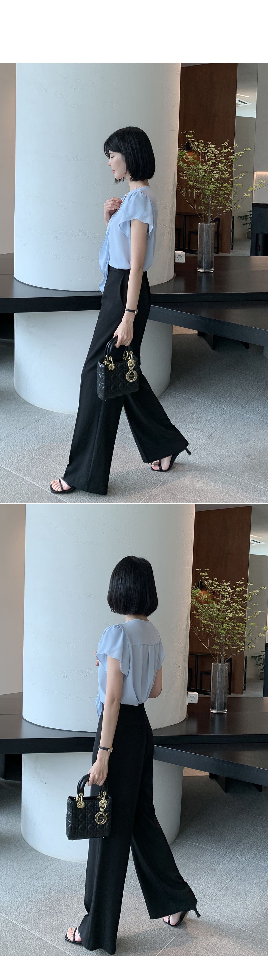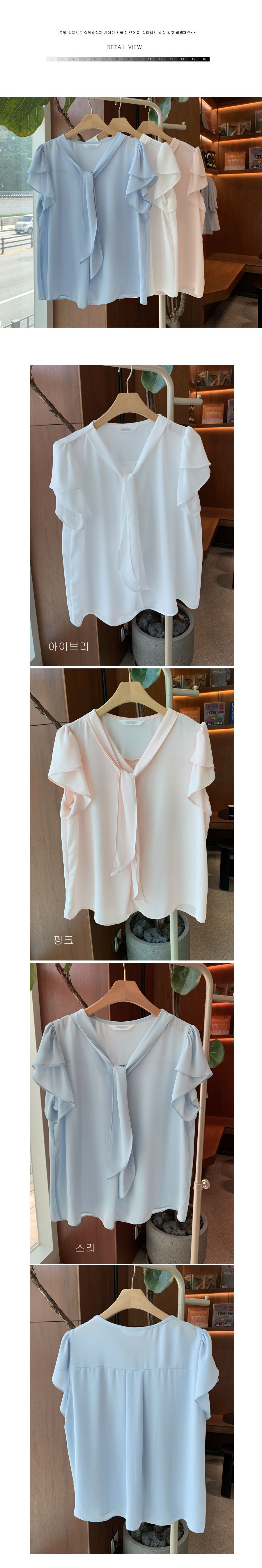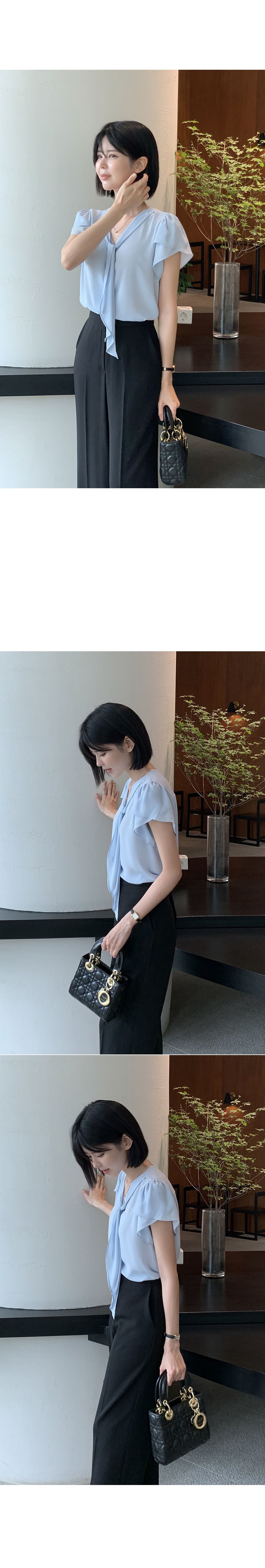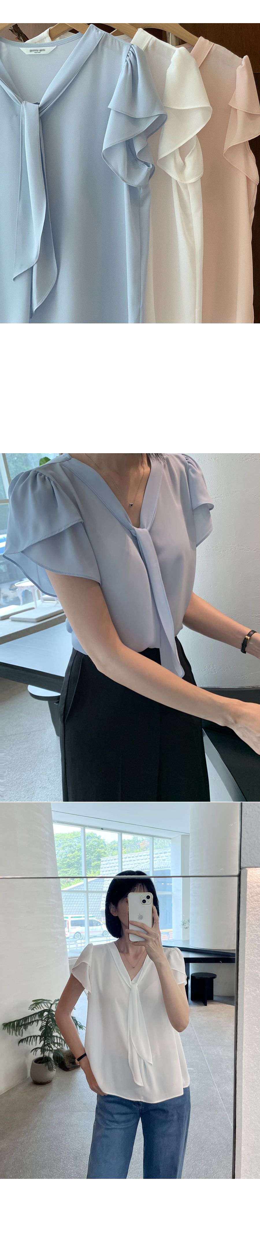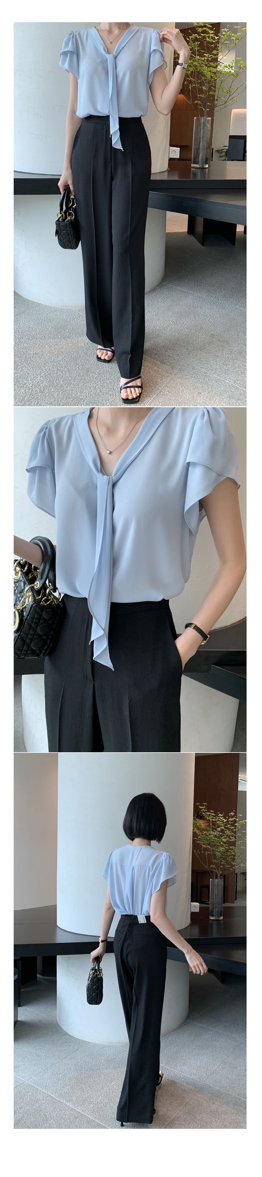 綁帶V領/織帶領結/花瓣袖/荷葉袖/後背打褶 - 休閒OL上班族簡約百搭素面領結雪紡衫雪紡上衣短袖上衣天藍色粉色白色