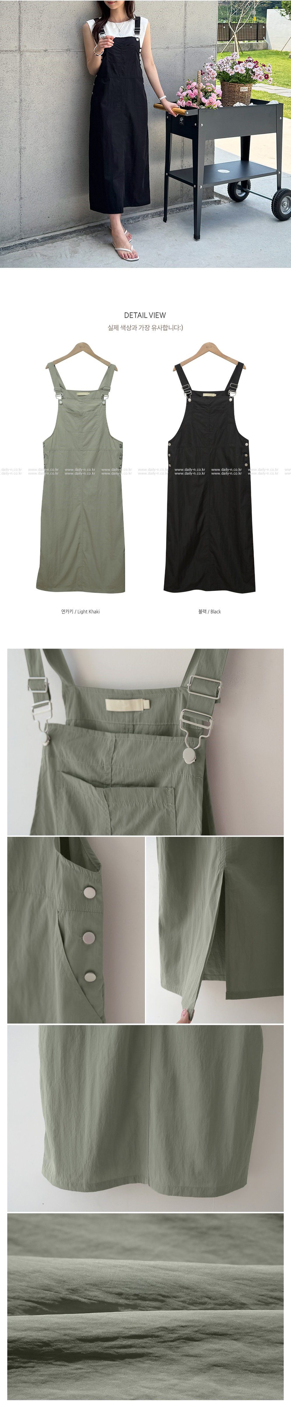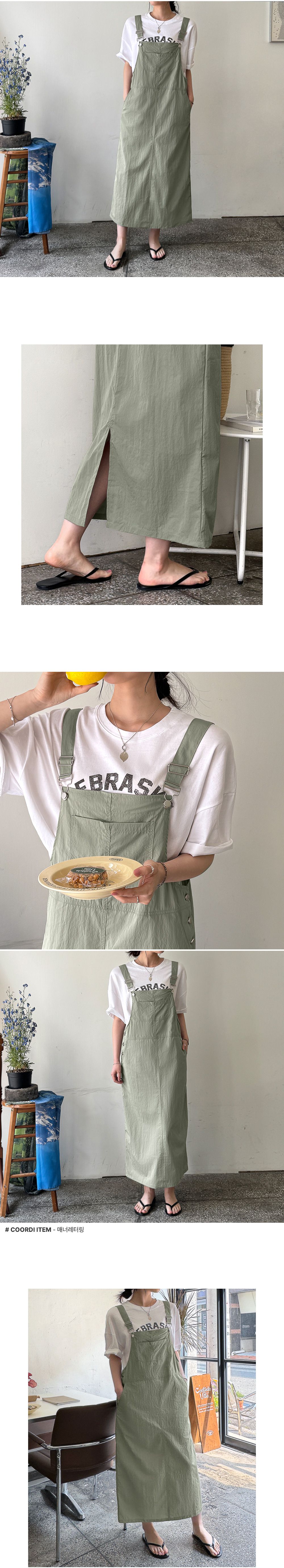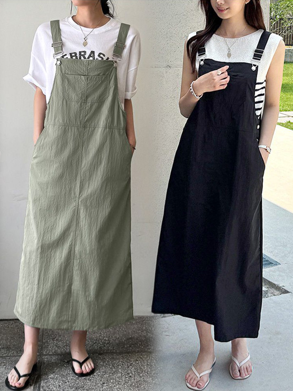 調整肩帶長度不鬆垮/後開衩活動更舒適/排釦設計方便穿脫又時尚-休閒居家簡約百搭側排釦素面大口袋可調節式後開衩直筒無袖吊帶裙洋裝卡其綠色黑色