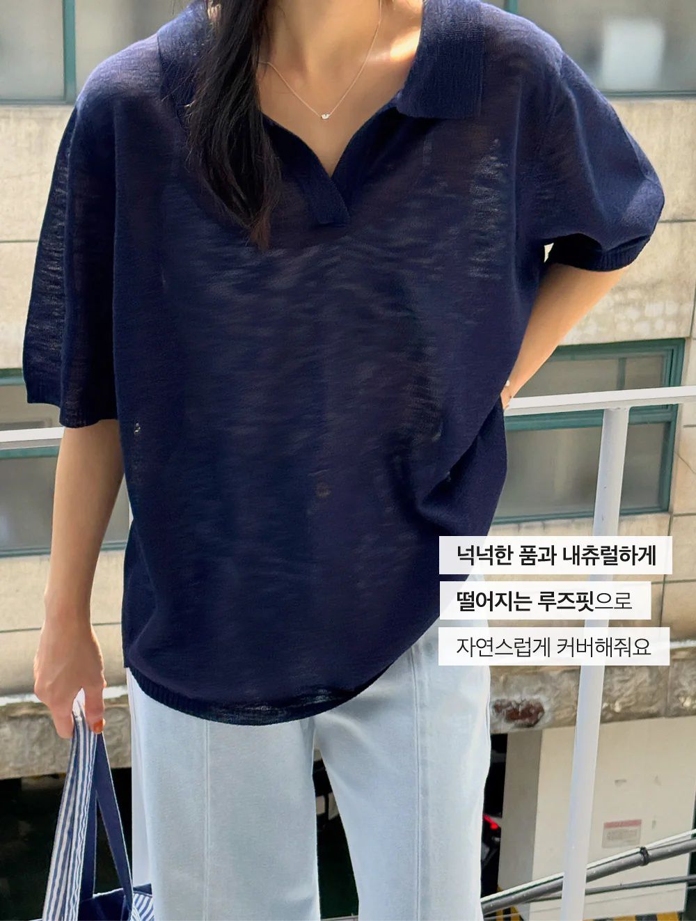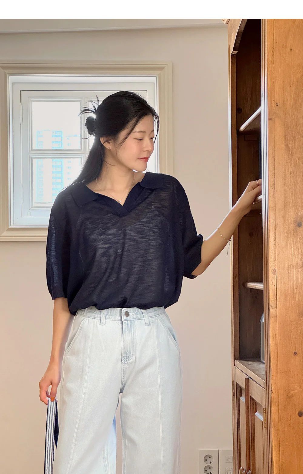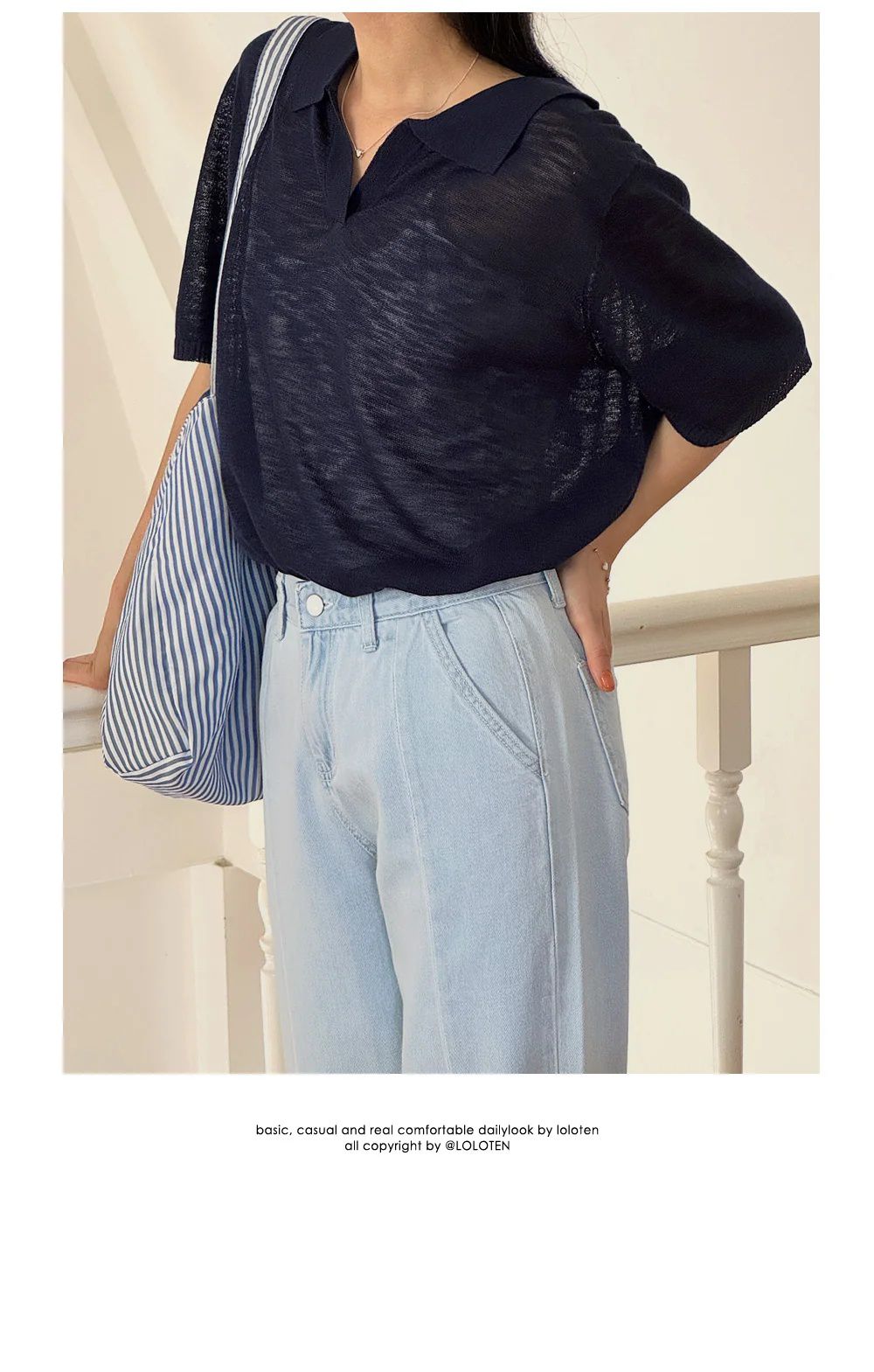 【C54917】韓國LOL 透膚針織衫-V領寬鬆長版素面五分寬袖上衣