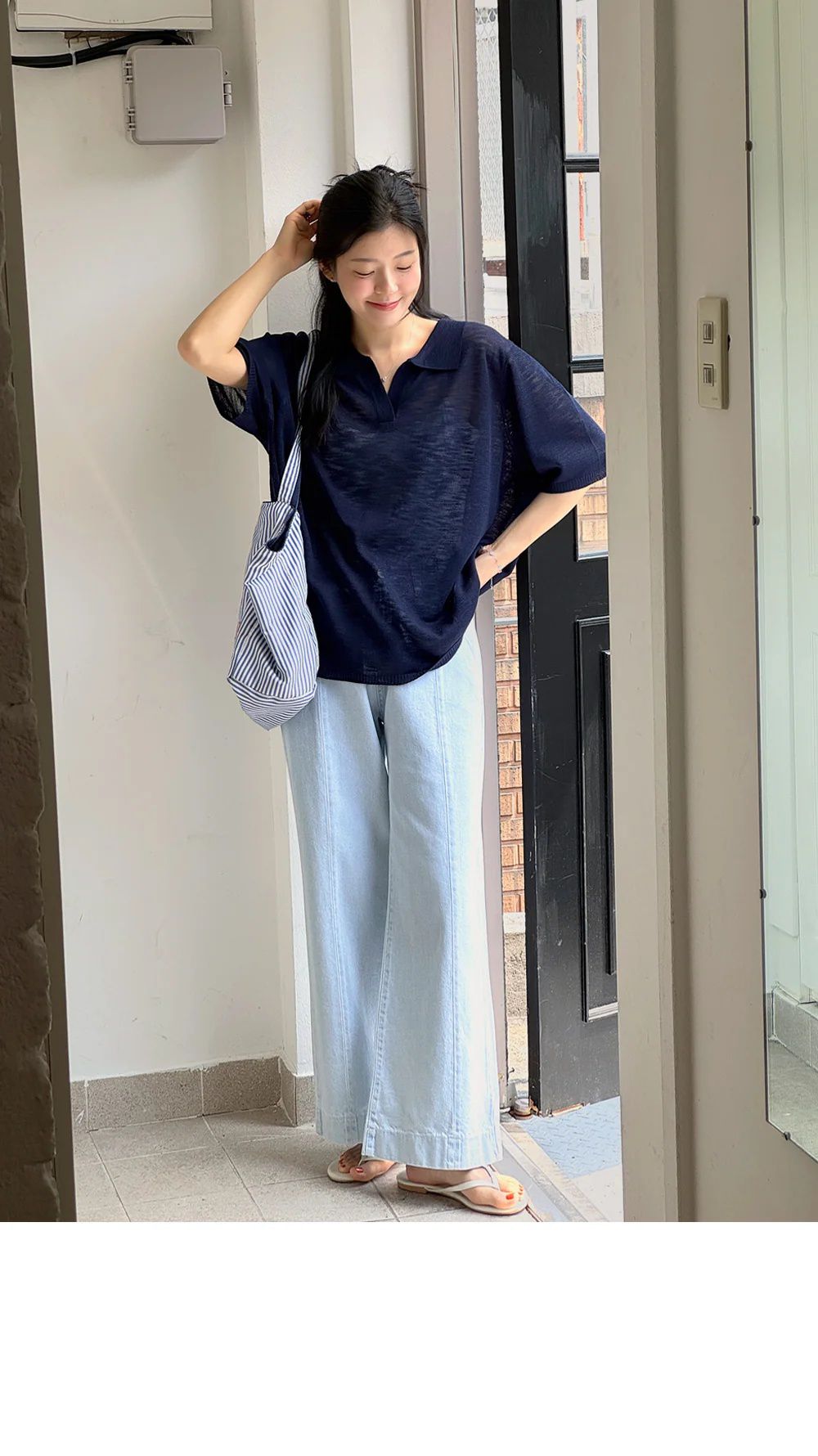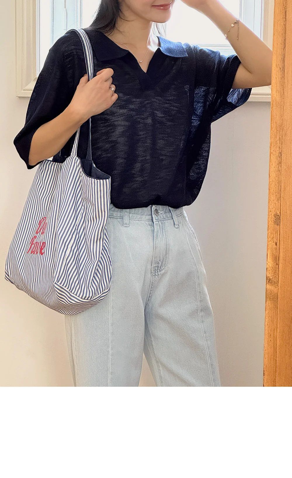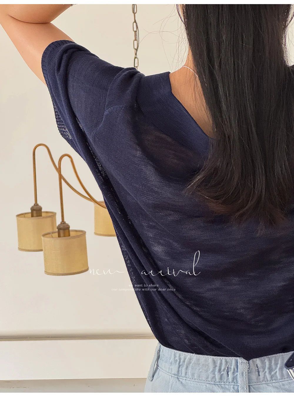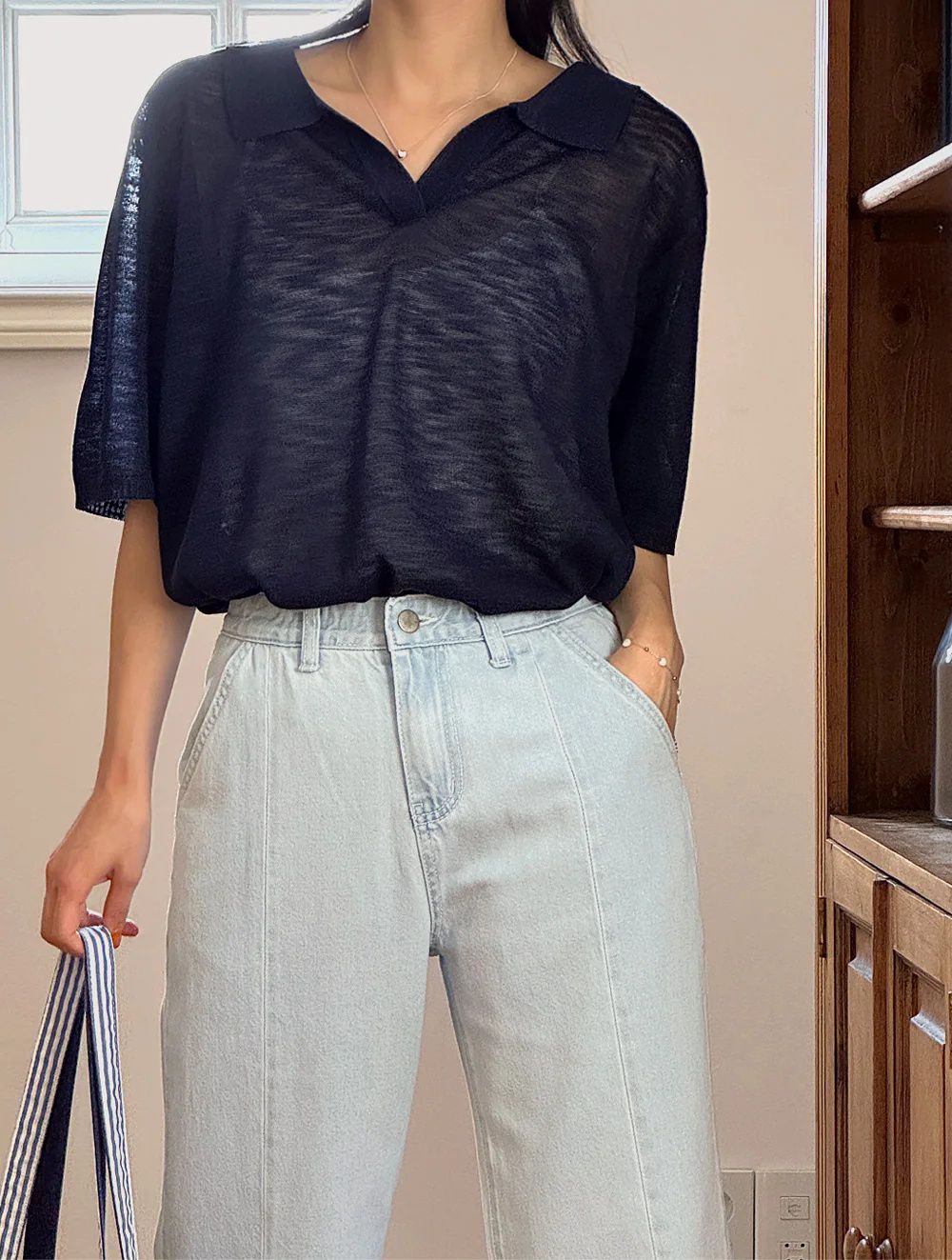 【C54917】韓國LOL 透膚針織衫-V領寬鬆長版素面五分寬袖上衣