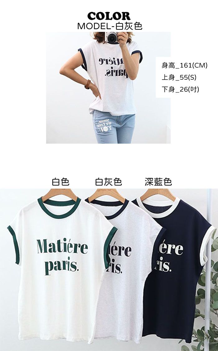 法語字母膠印富有異國風情/簡約基礎款/休閒好穿搭-休閒居家簡約百搭小蓋袖跳色滾邊巴黎膠印字母圓領連肩純棉短袖上衣T恤白色白灰色深藍色