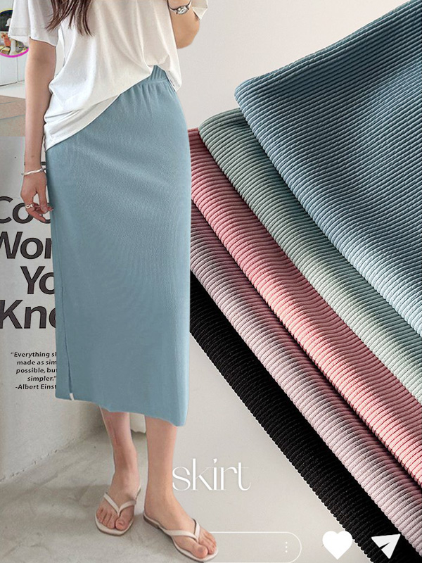 【C54932】韓國DLY 坑條素面窄裙-全腰鬆緊不收邊側開衩直筒裙子
