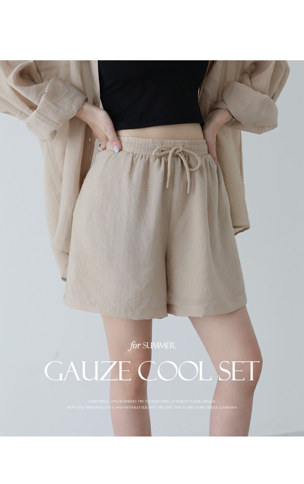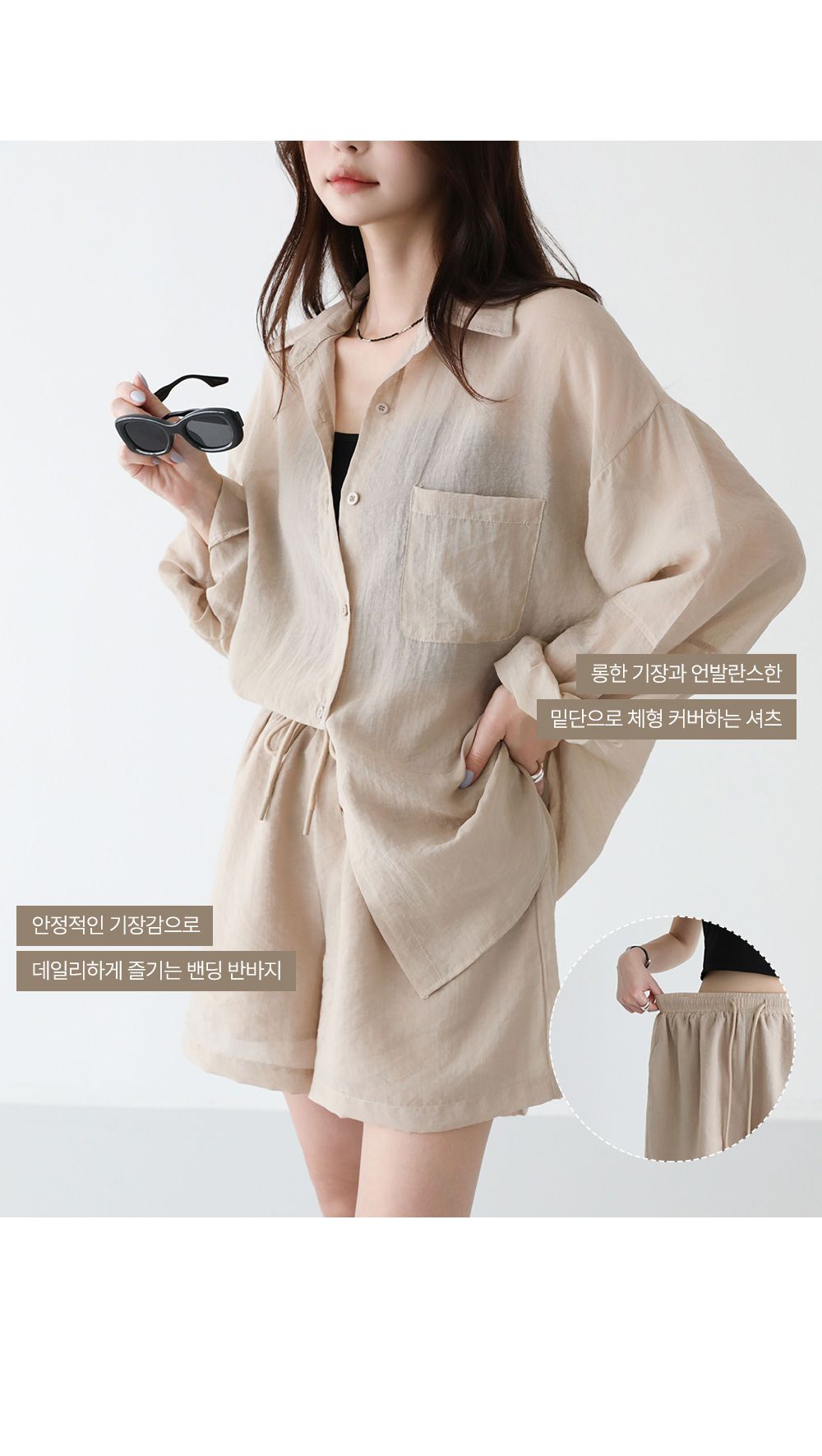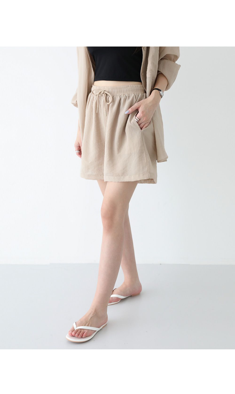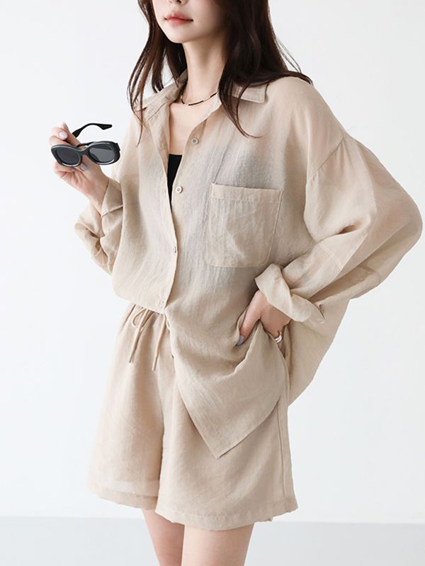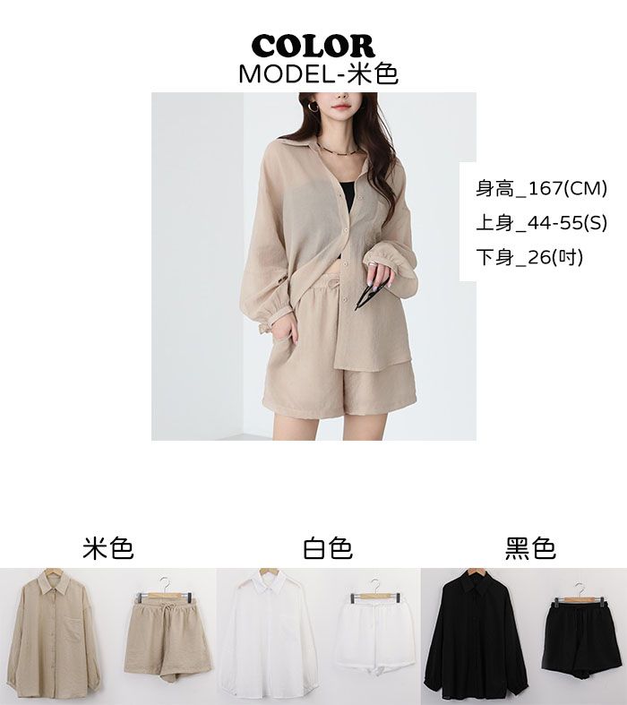 可拆開穿搭 高CP值/長版遮屁屁/A字褲修飾肉肉大腿-休閒居家簡約百搭素面排釦長版口袋長袖內襯襯衫上衣+抽繩短褲套裝米色白色黑色