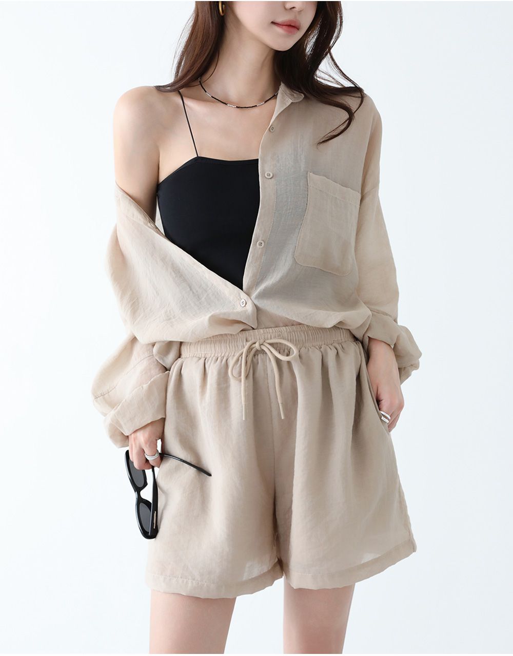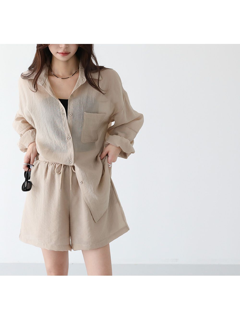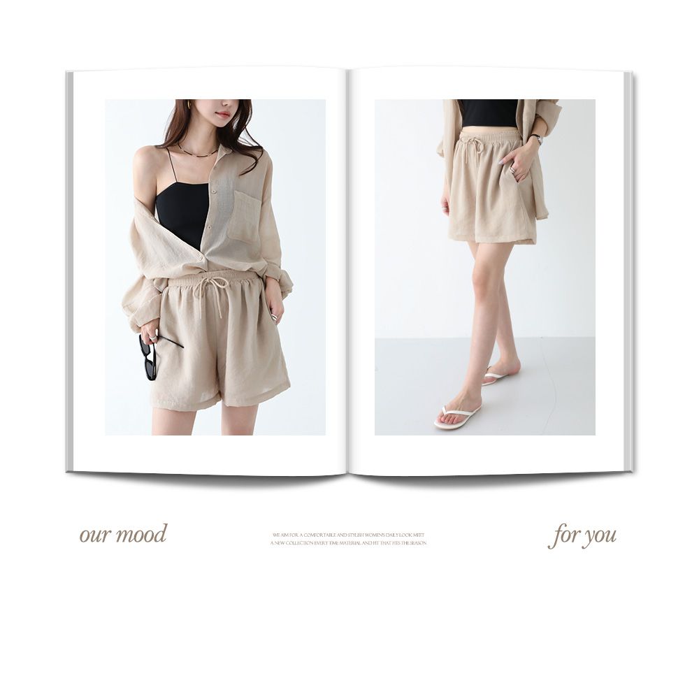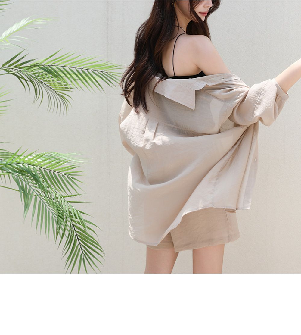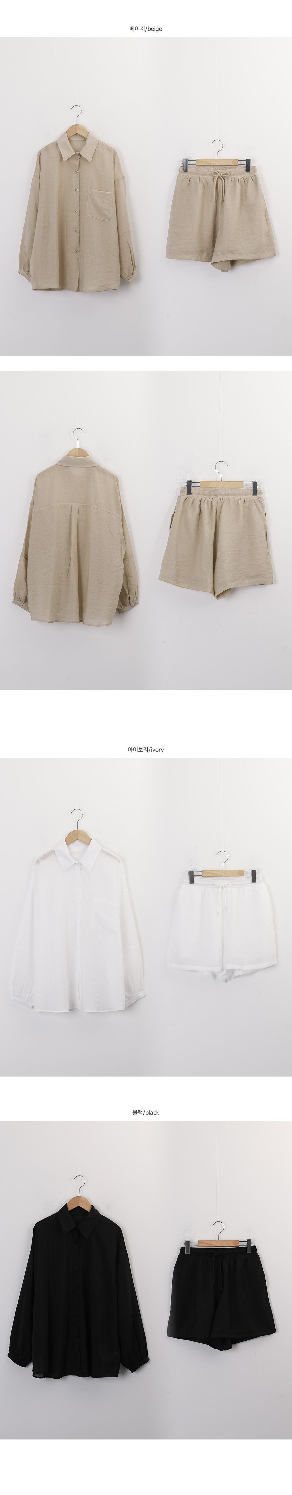 【C54977】韓國PPI 素面排釦套裝-長版口袋長袖襯衫上衣+抽繩短褲★★