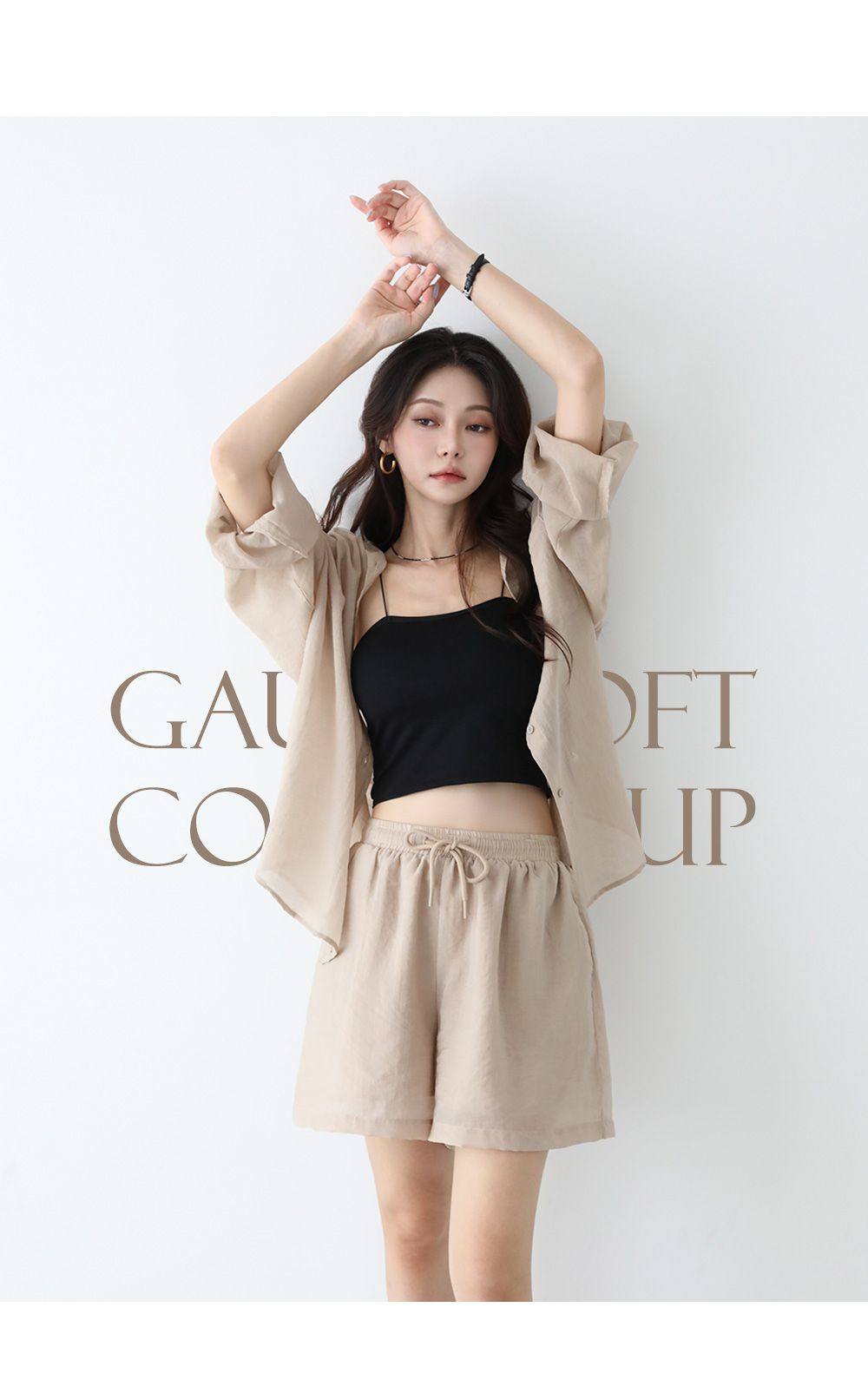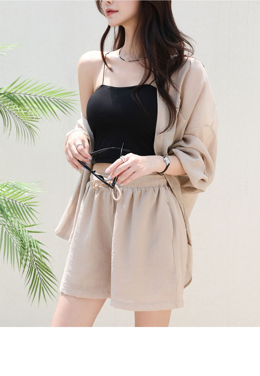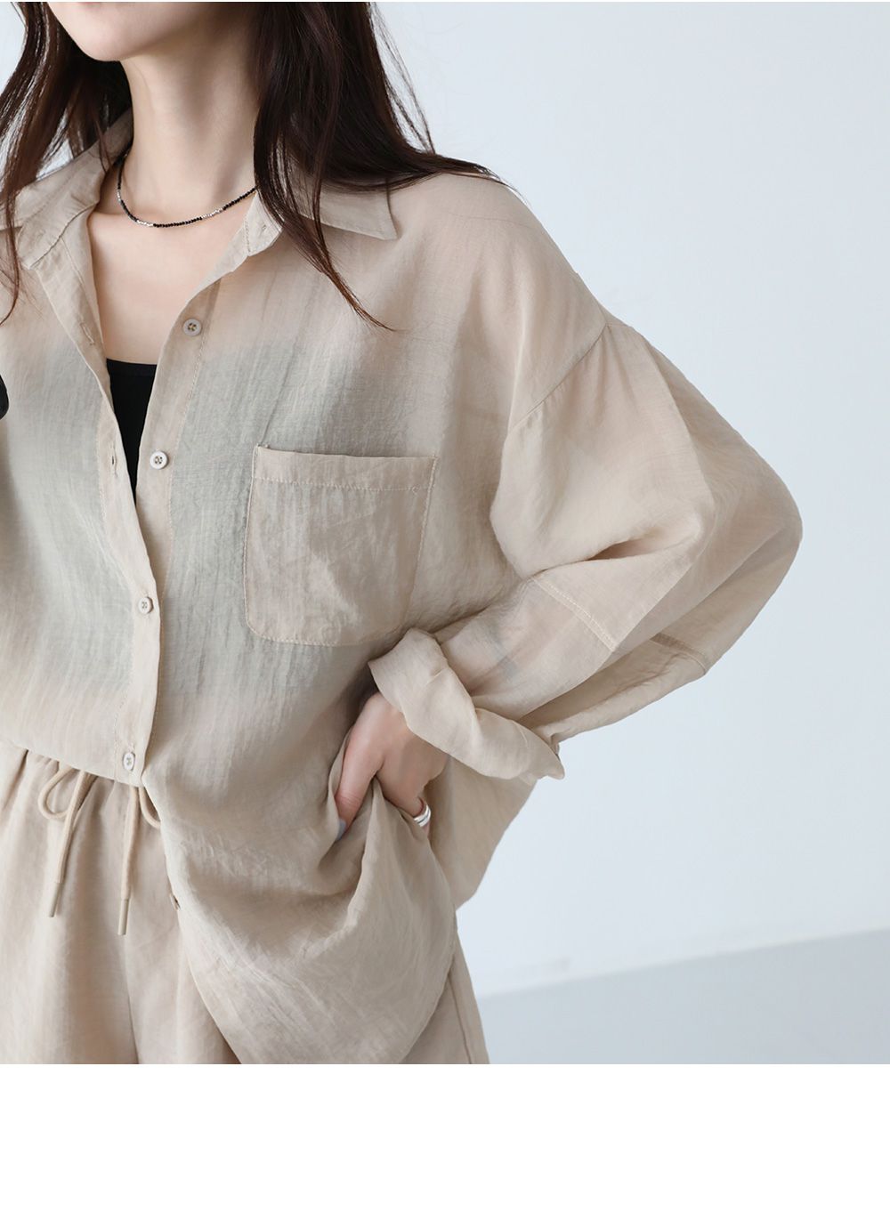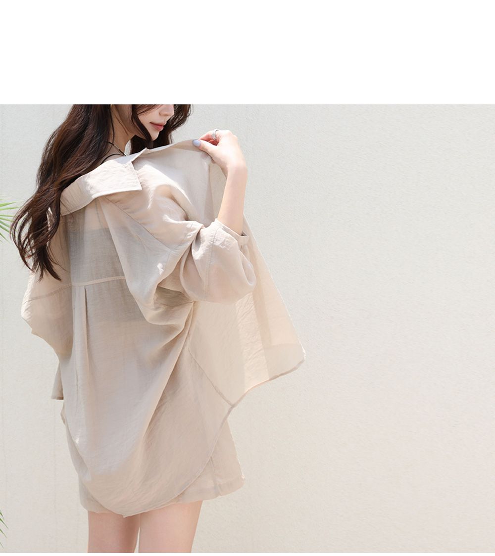 【C54977】韓國PPI 素面排釦套裝-長版口袋長袖襯衫上衣+抽繩短褲★★