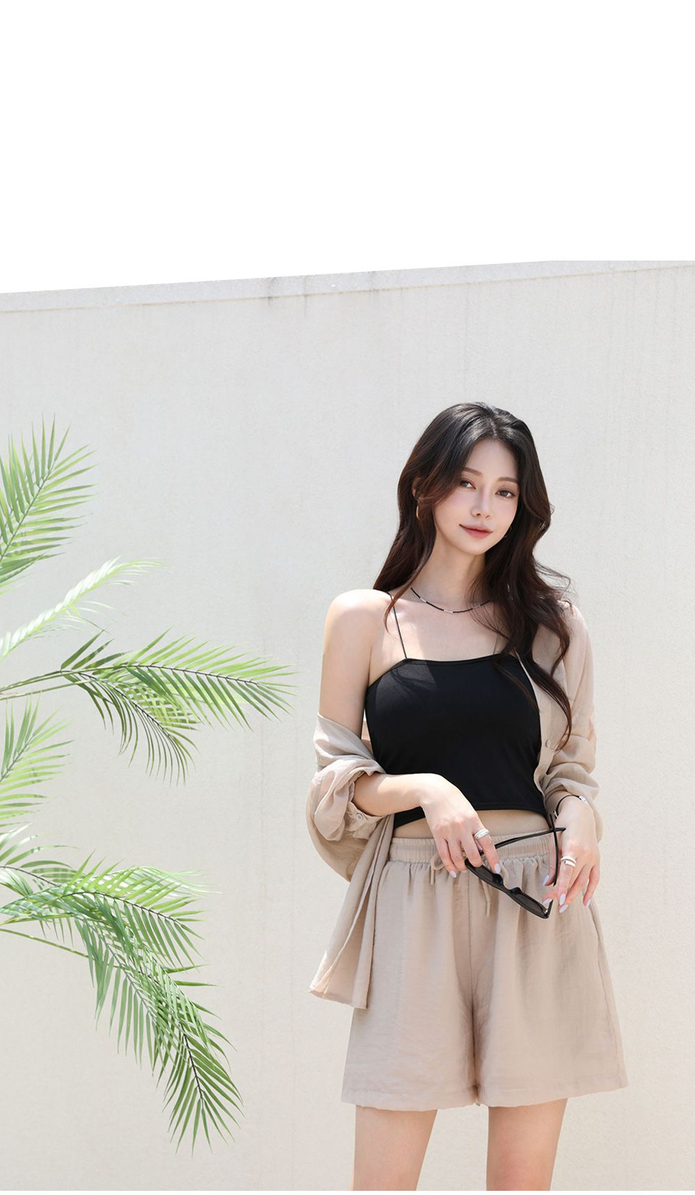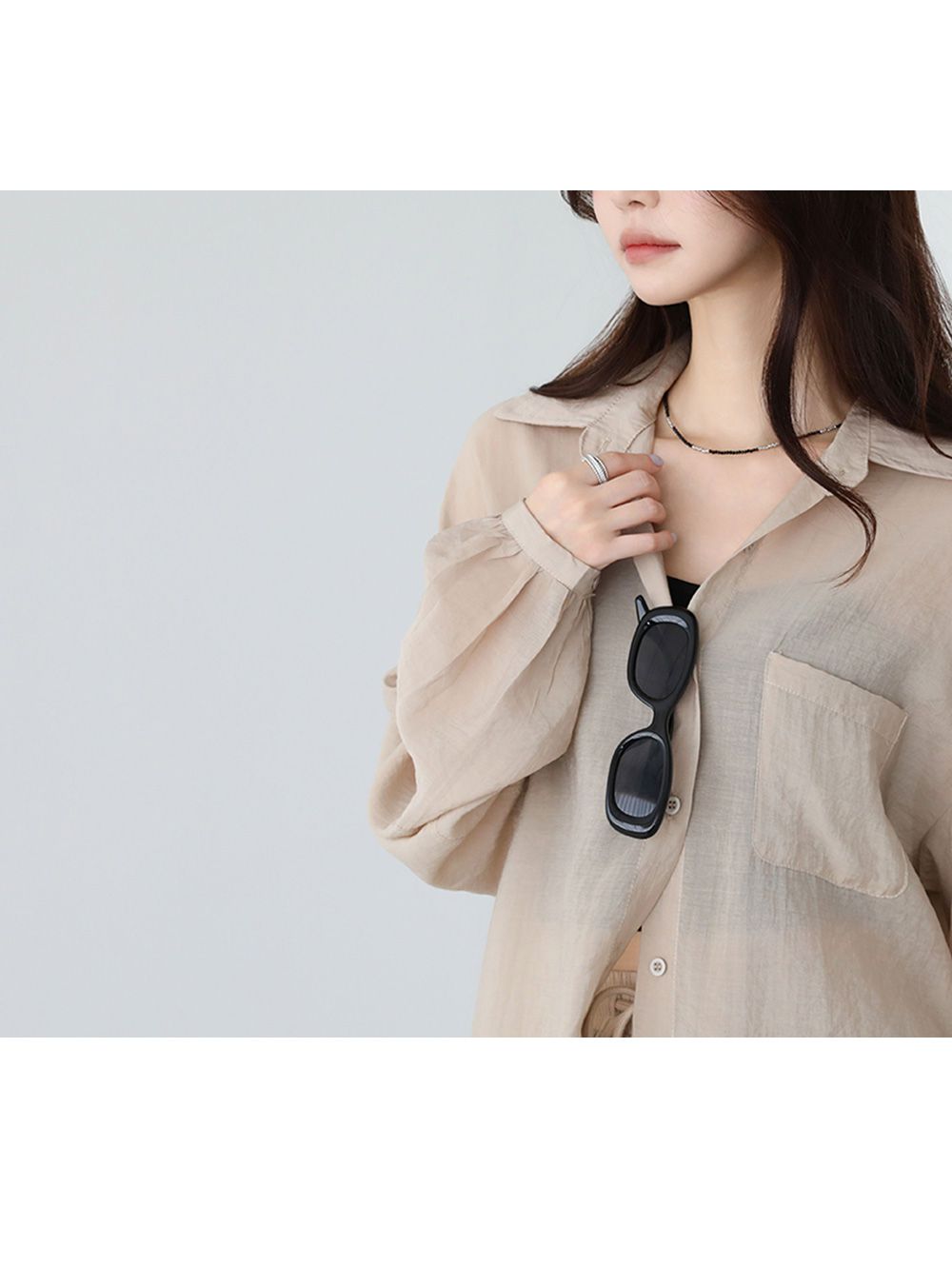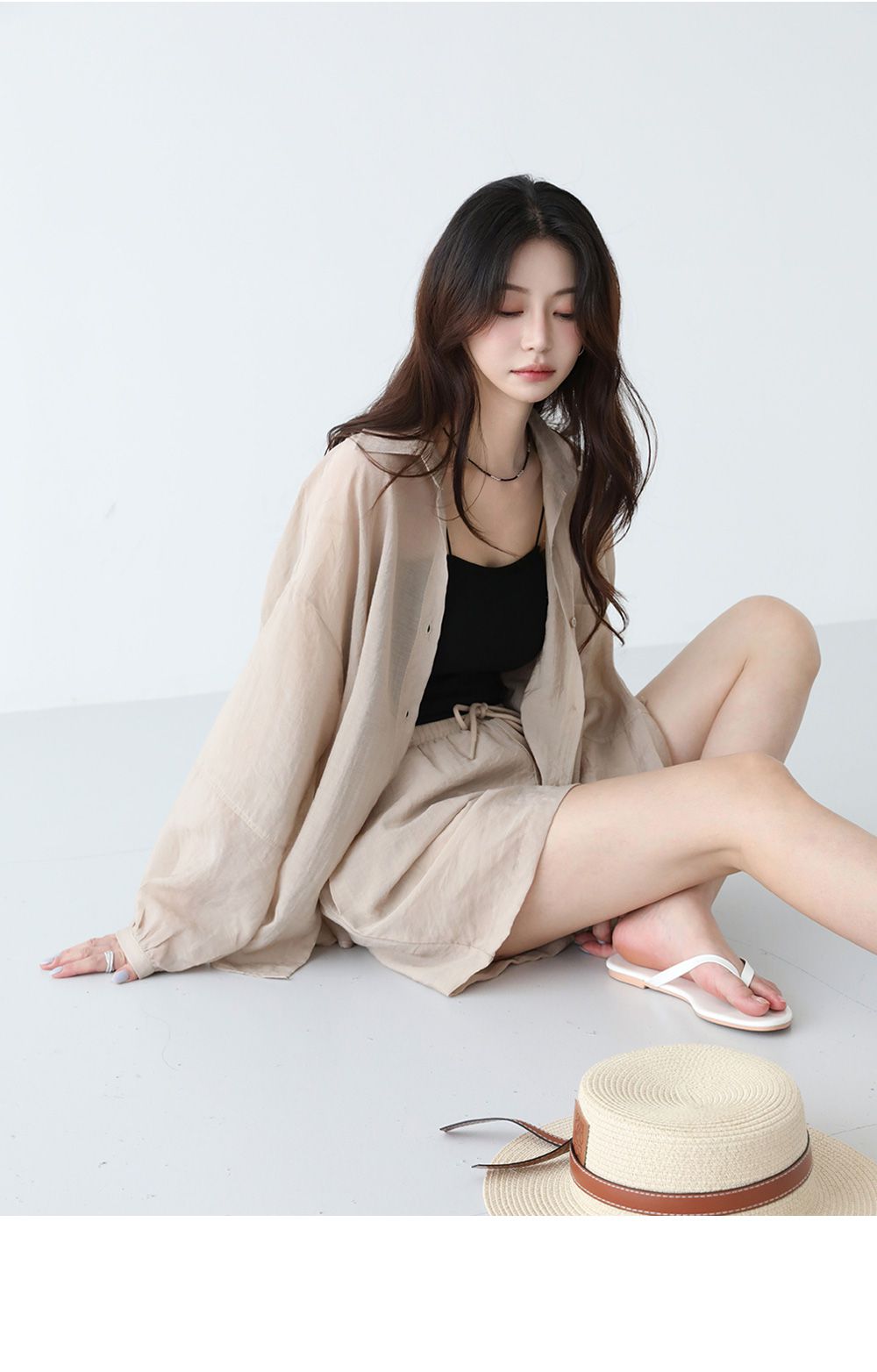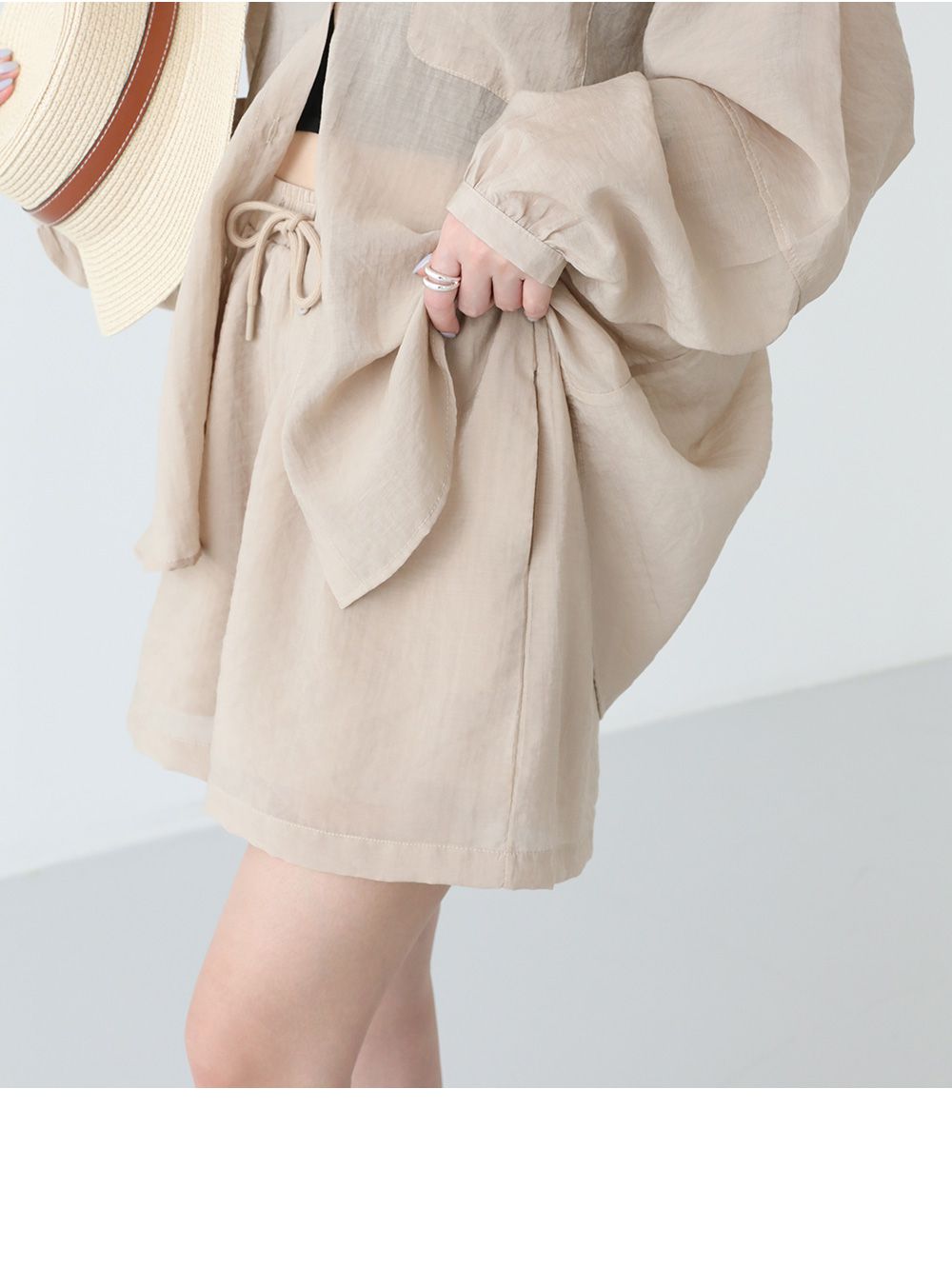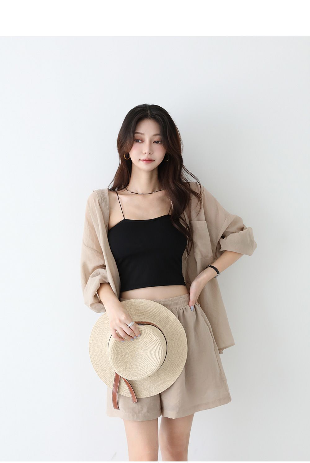【C54977】韓國PPI 素面排釦套裝-長版口袋長袖襯衫上衣+抽繩短褲★★