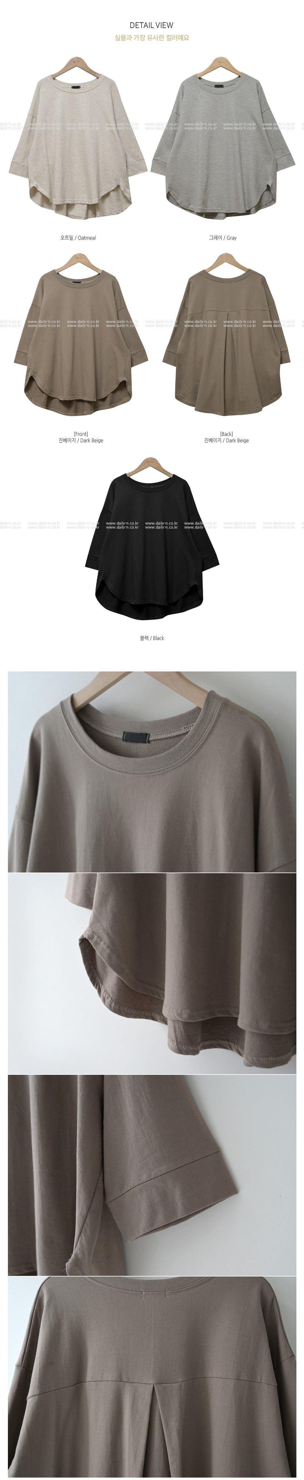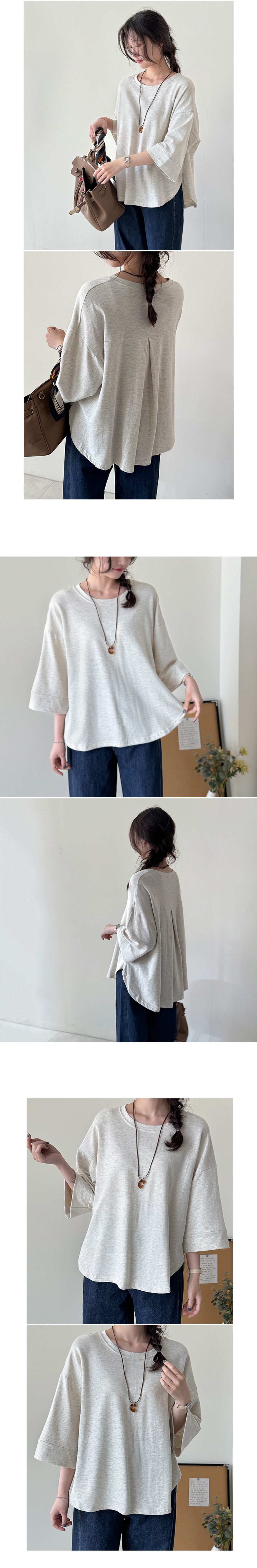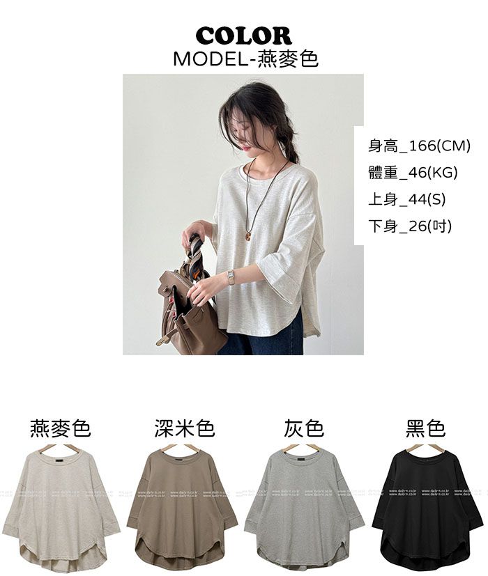 後背打褶/前短後長/圓弧後襬/圓領/落肩七分袖/寬袖/寬鬆傘狀 - 休閒居家簡約百搭素面傘狀七分袖上衣七分袖T恤寬袖T恤寬鬆大尺碼上衣燕麥色深米色灰色黑色
