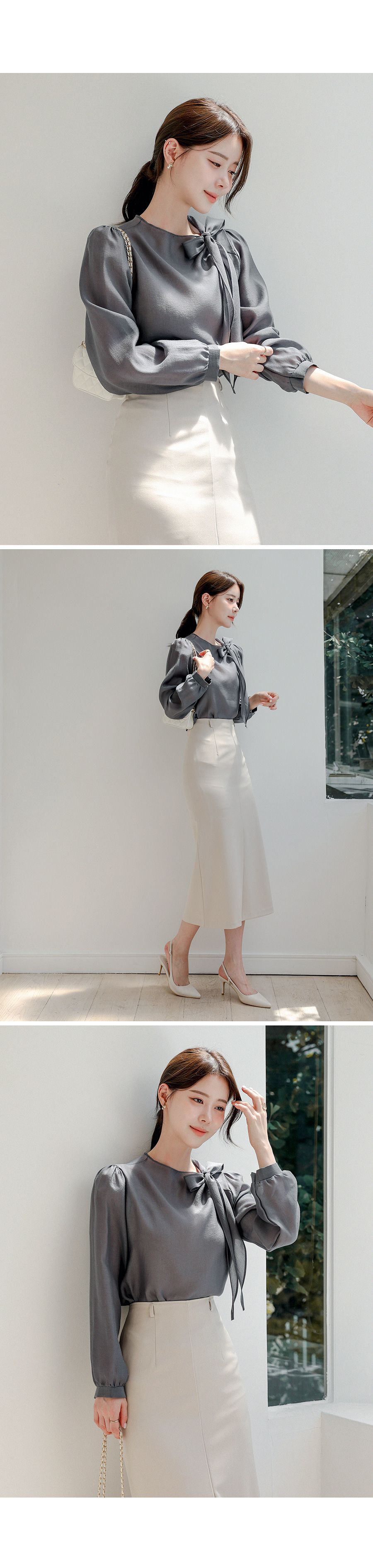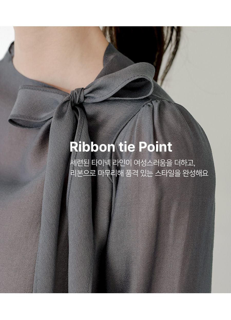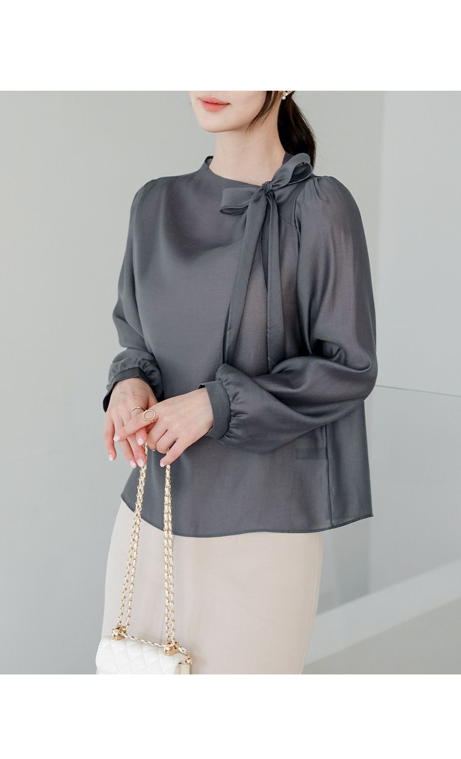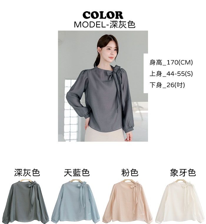 OL必備正式上衣/結蝶綁帶獨特不撞衫/混天絲面料-休閒居家簡約百搭光澤綁帶立領抓皺OL素面混天絲長袖雪紡衫上衣深灰色天藍色粉色象牙色
