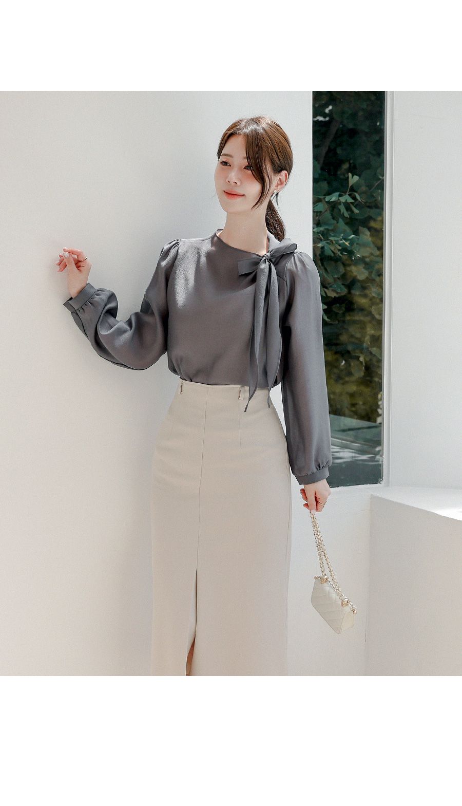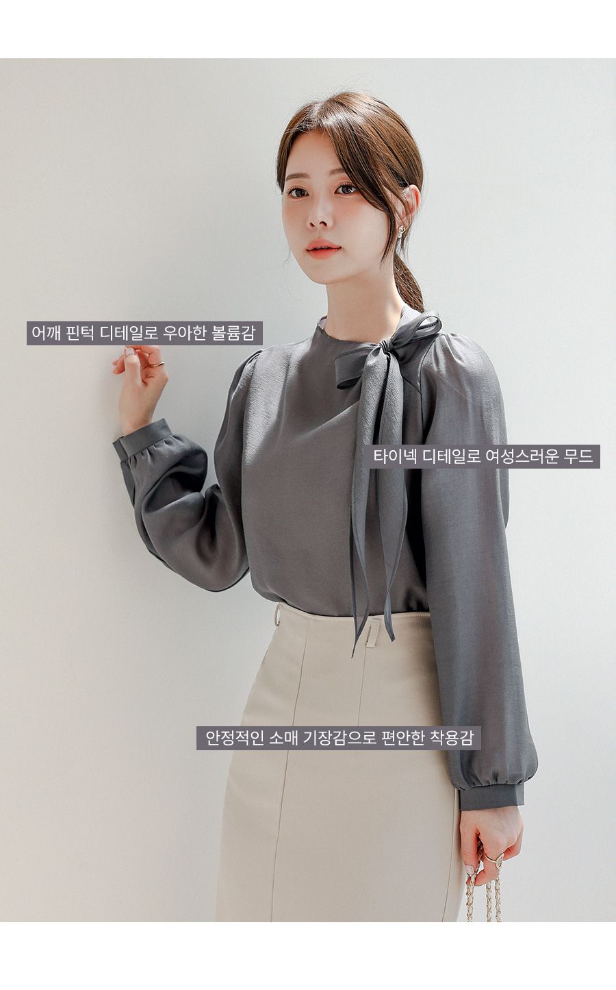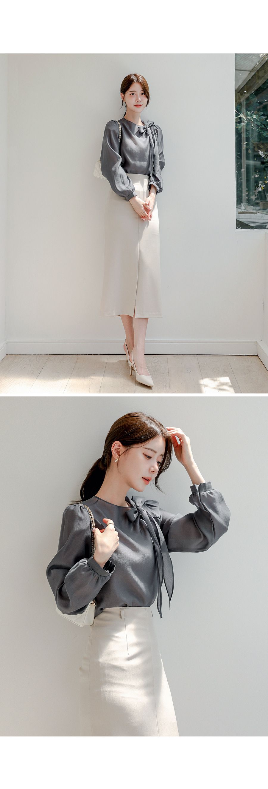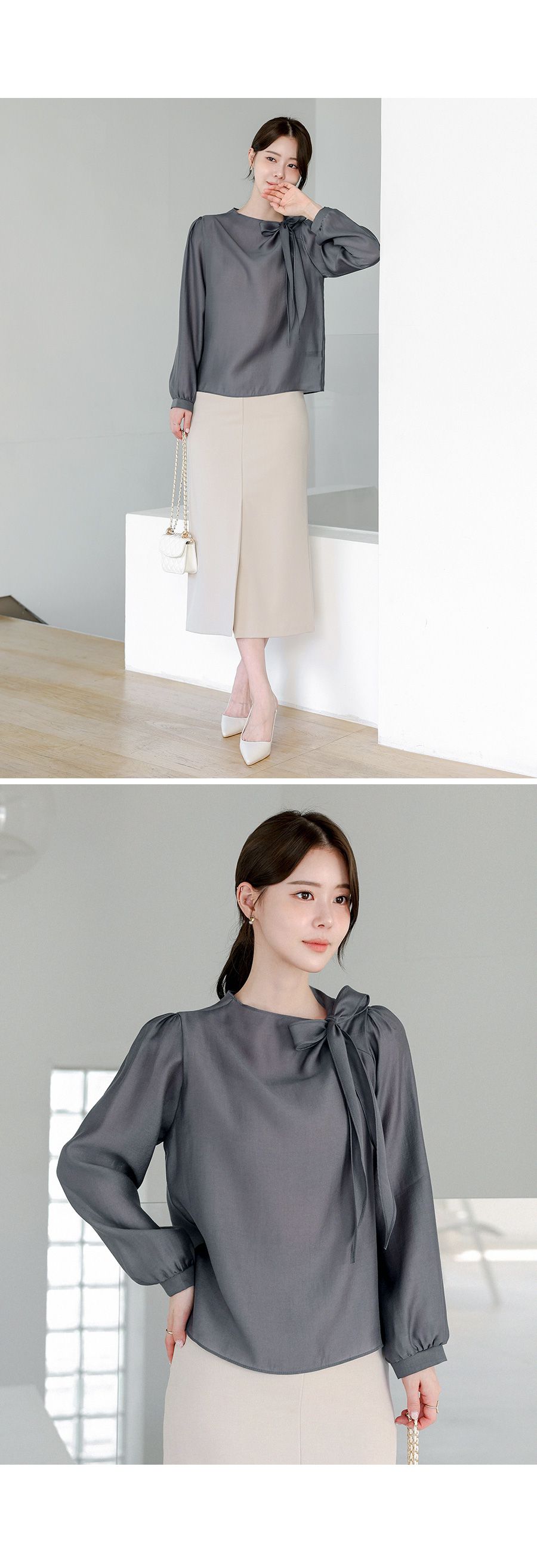 OL必備正式上衣/結蝶綁帶獨特不撞衫/混天絲面料-休閒居家簡約百搭光澤綁帶立領抓皺OL素面混天絲長袖雪紡衫上衣深灰色天藍色粉色象牙色