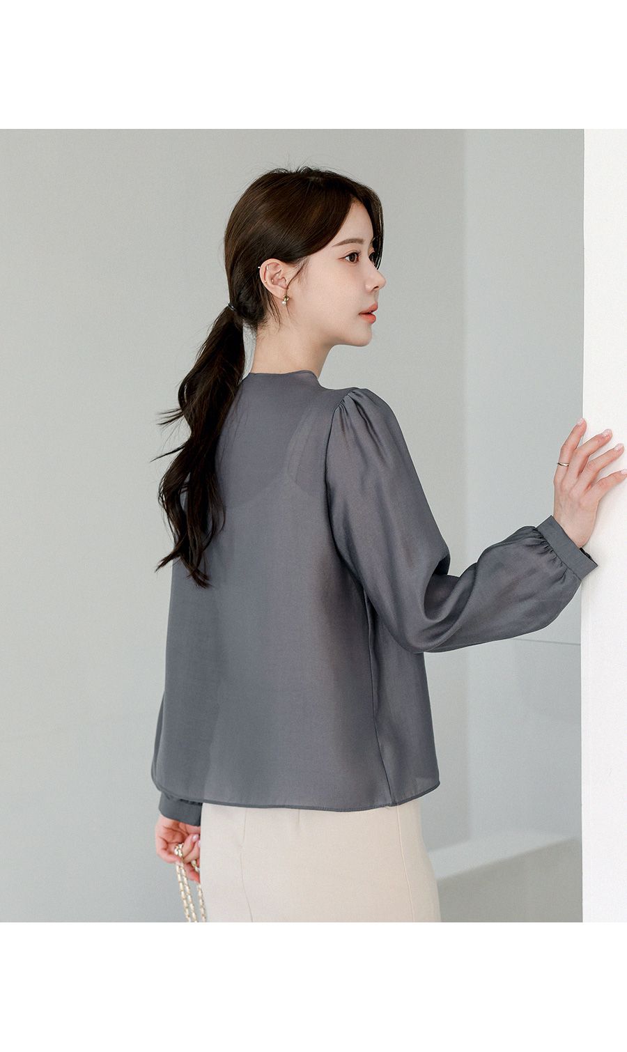 【C55271】韓國MNA 光澤綁帶上衣-立領抓皺OL素面混天絲長袖雪紡衫