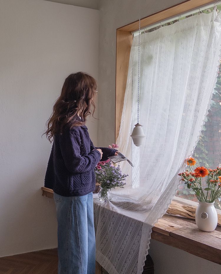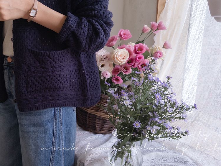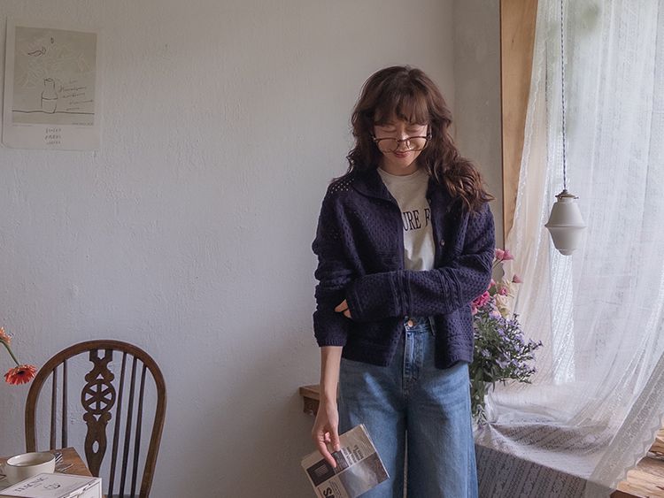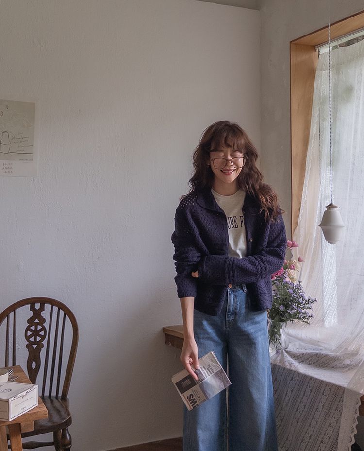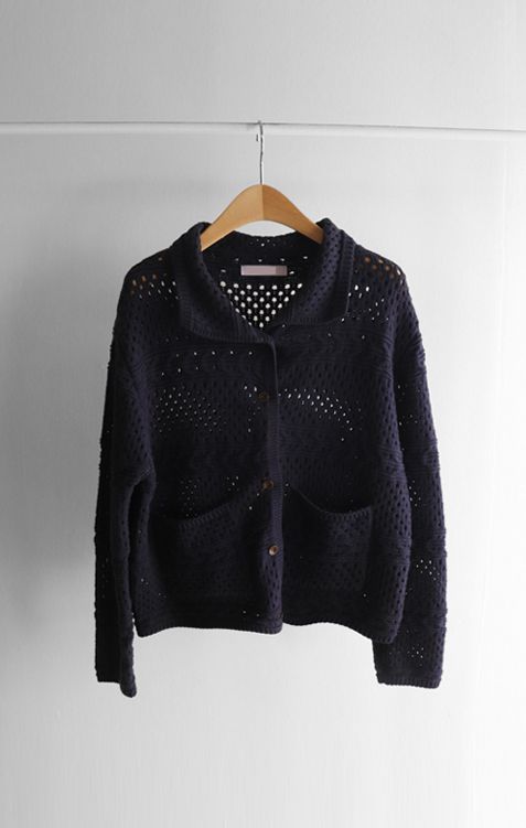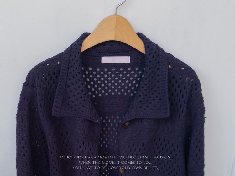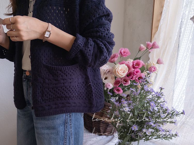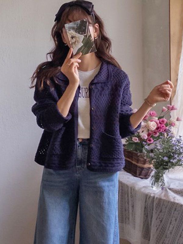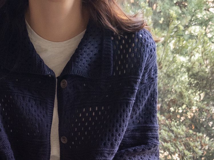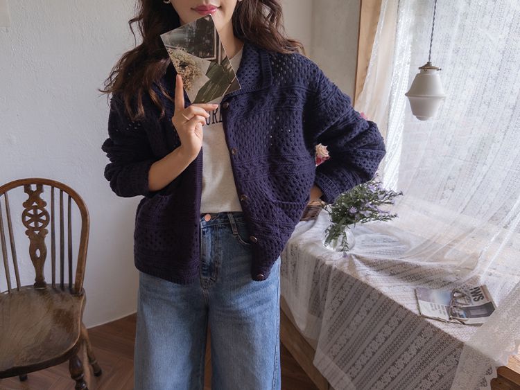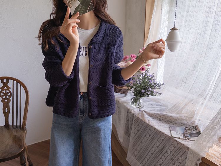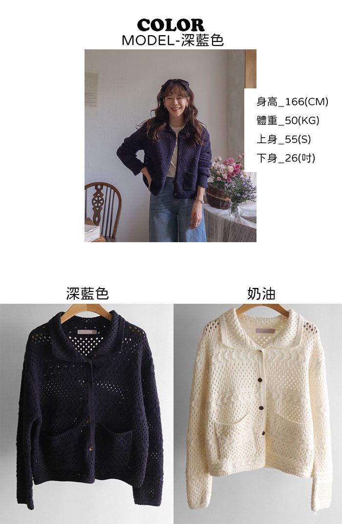 粗鉤針編織/洞洞裝/雙口袋/翻領/開襟排釦/復古棕鈕釦 - 休閒婚禮簡約百搭素面洞洞針織外套長袖針織外套深藍色奶油色