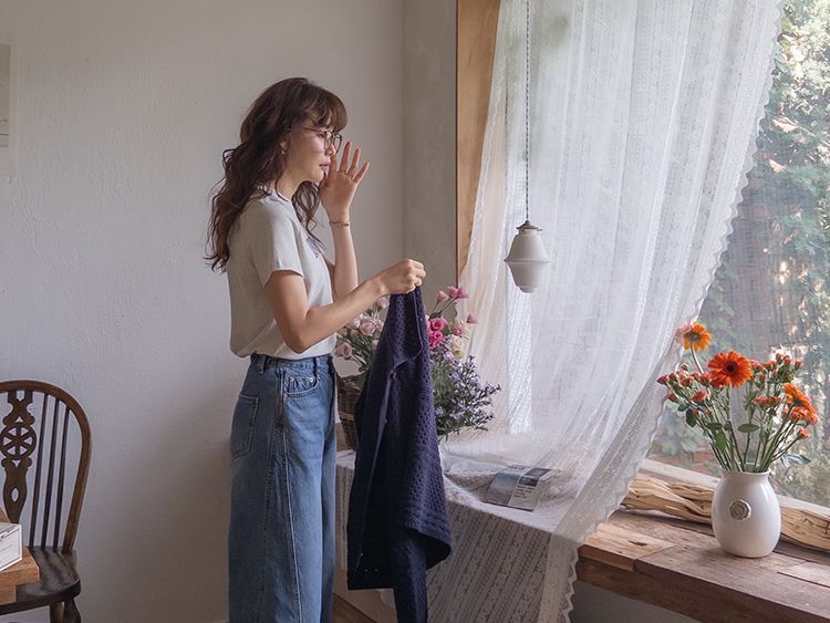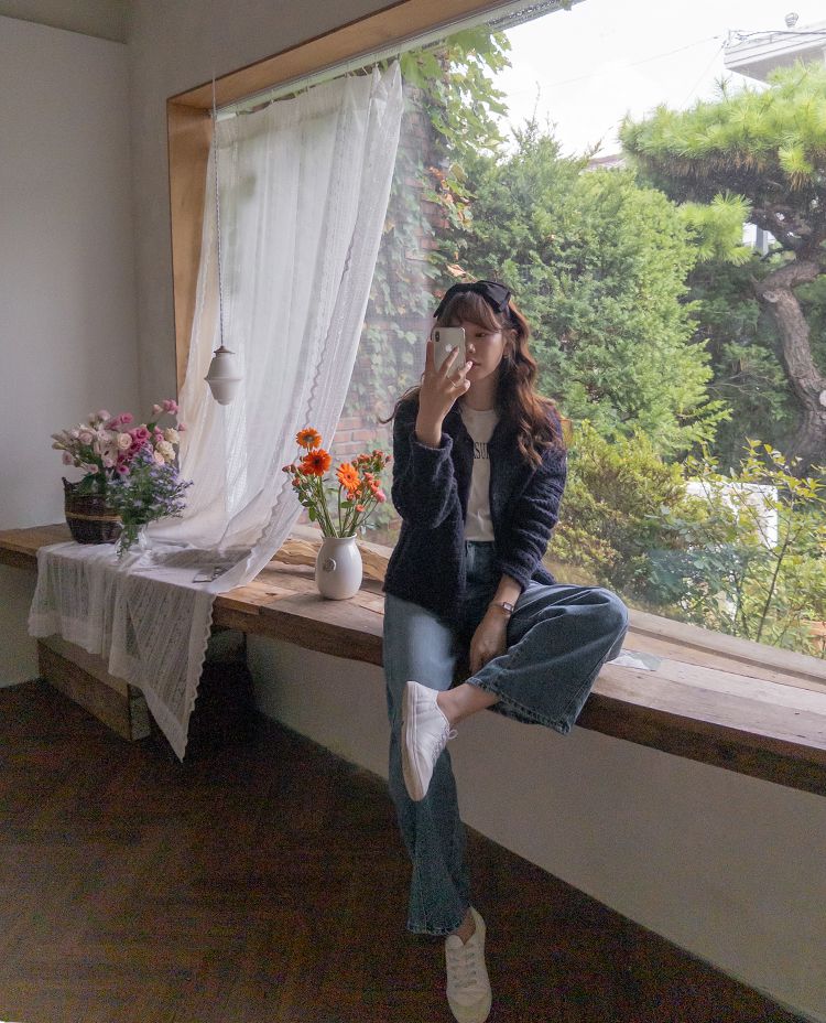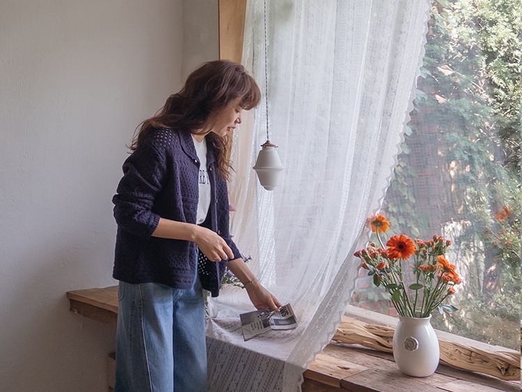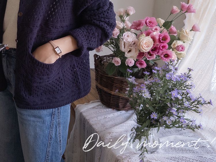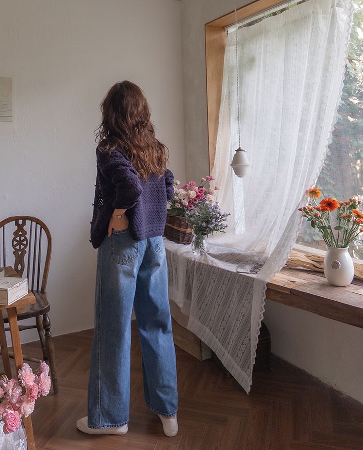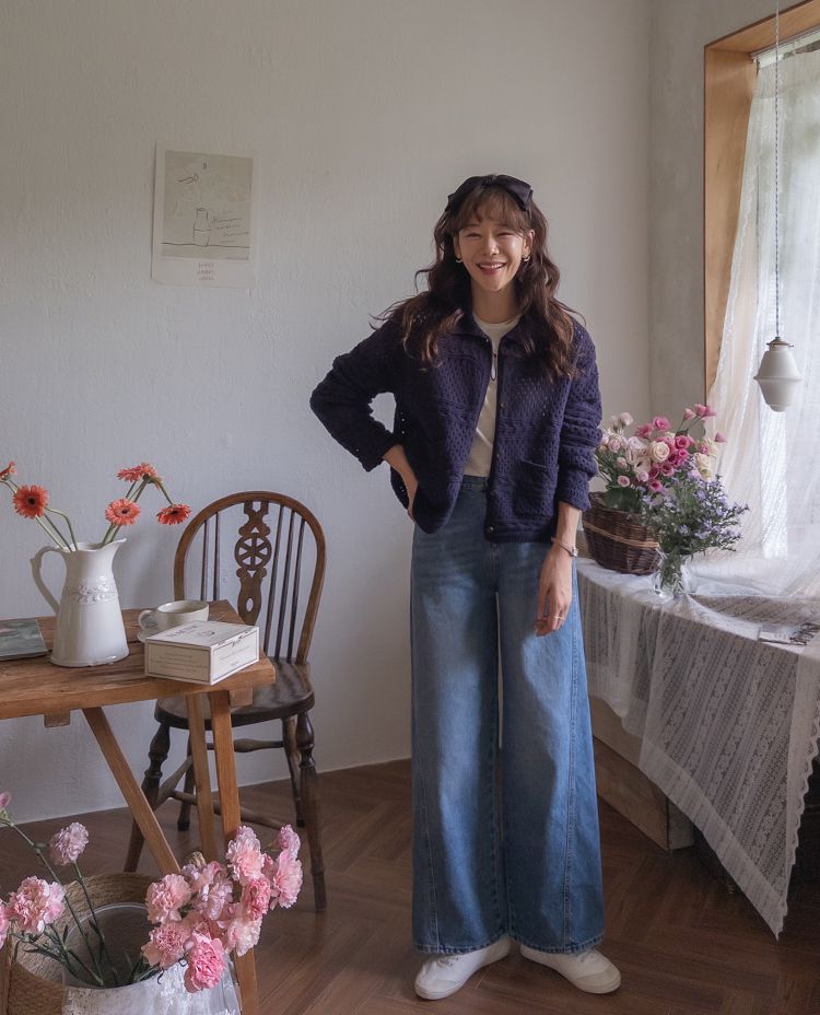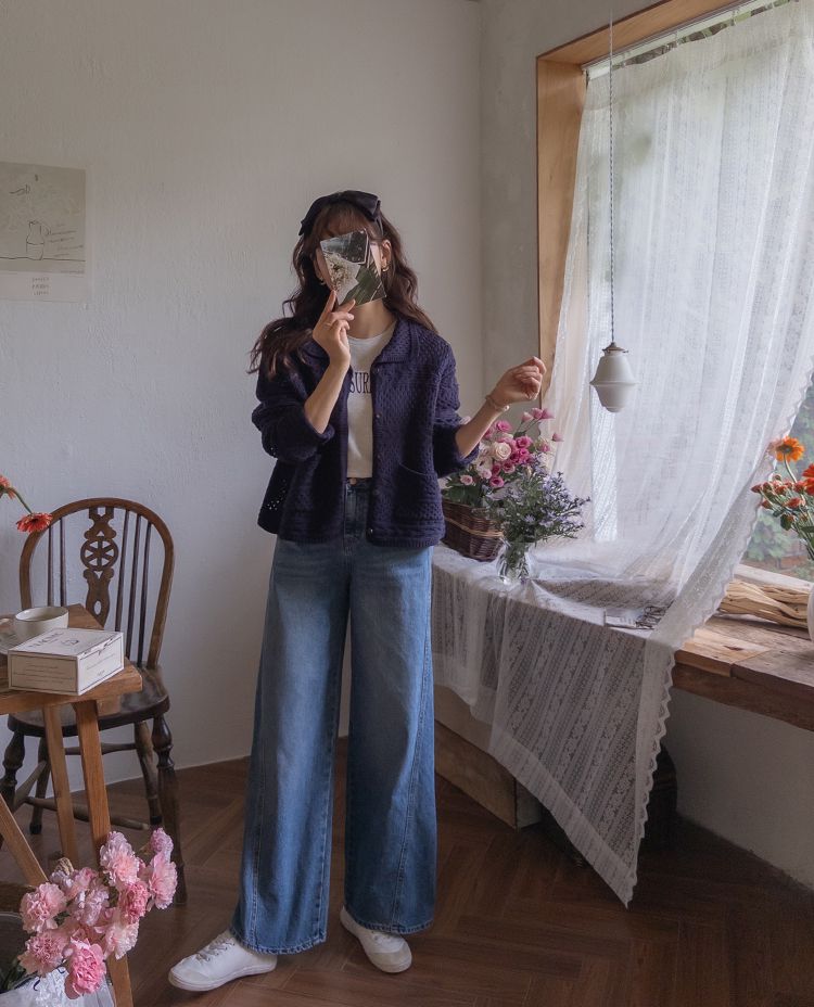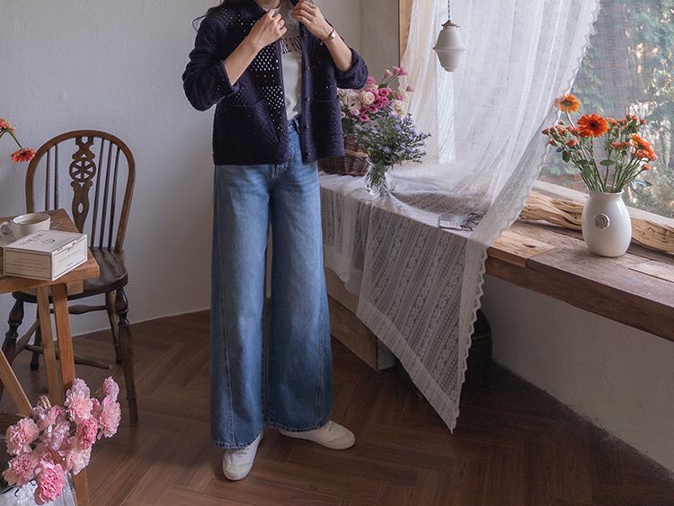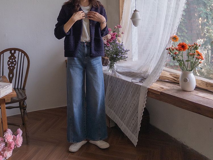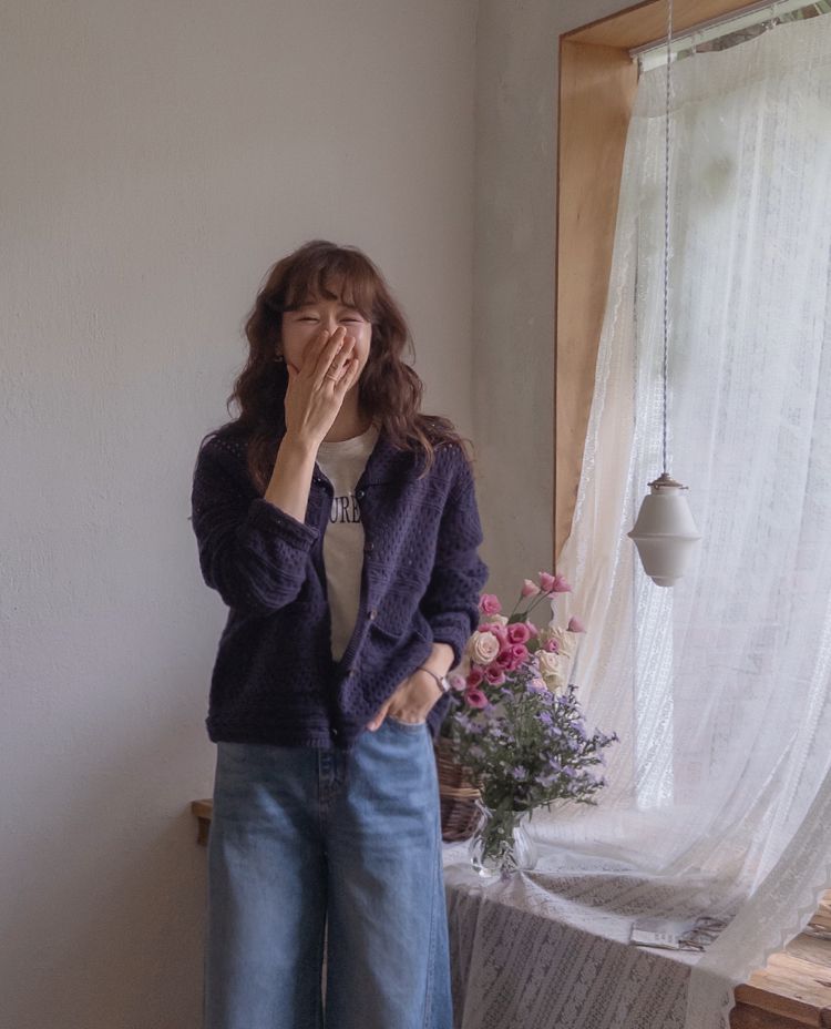粗鉤針編織/洞洞裝/雙口袋/翻領/開襟排釦/復古棕鈕釦 - 休閒婚禮簡約百搭素面洞洞針織外套長袖針織外套深藍色奶油色