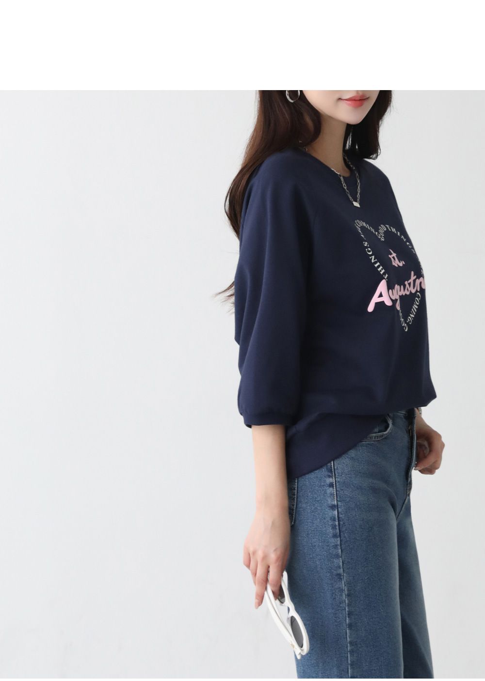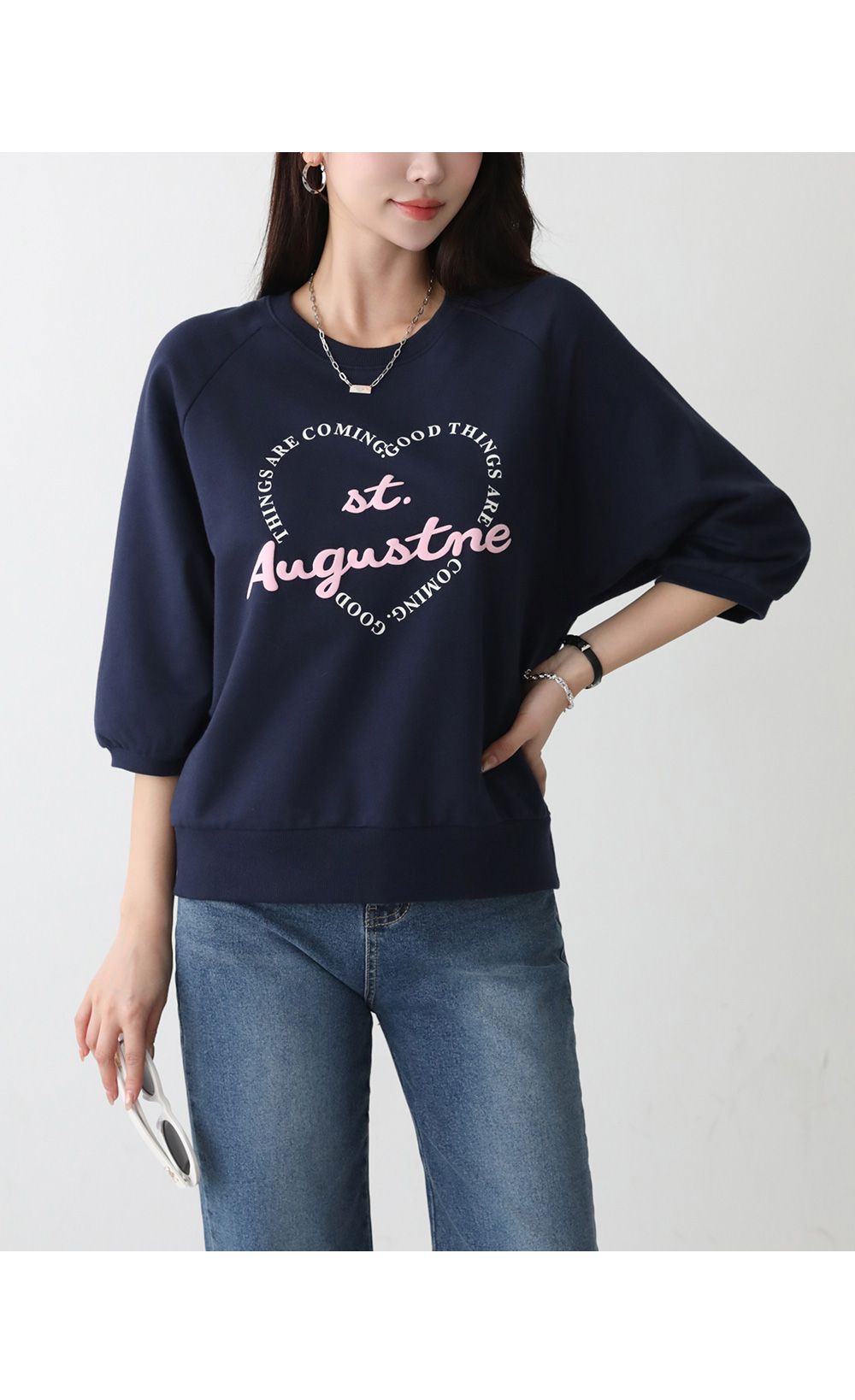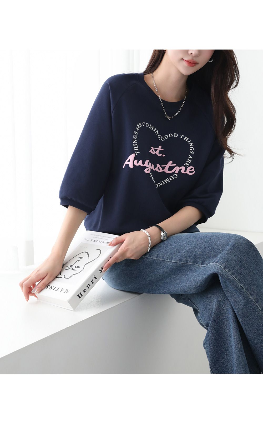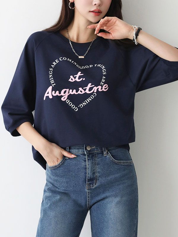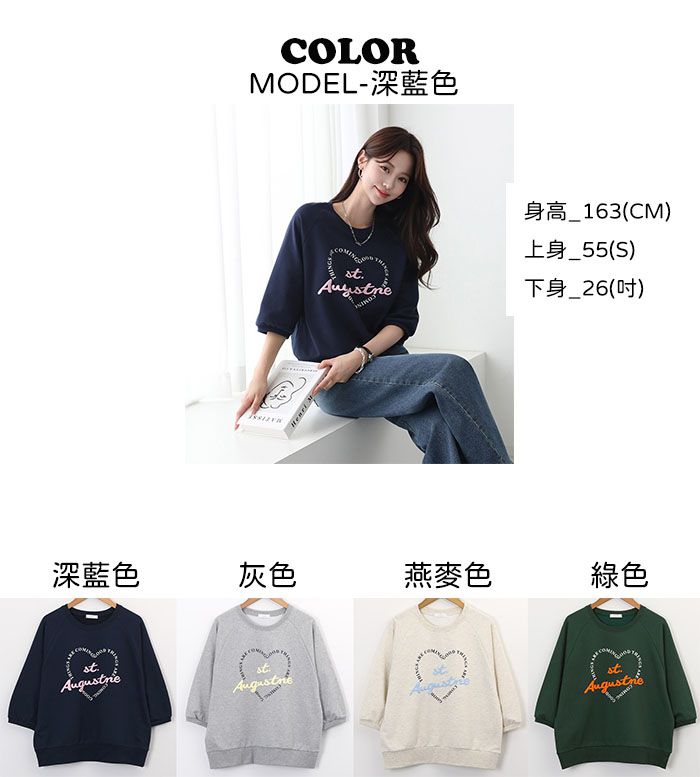 膠印字母/立體泡棉字母/圓領/連肩袖/寬袖 - 休閒居家英文字母上衣字母T恤愛心印花愛心字母T恤七分袖上衣印花上衣深藍色燕麥色綠色
