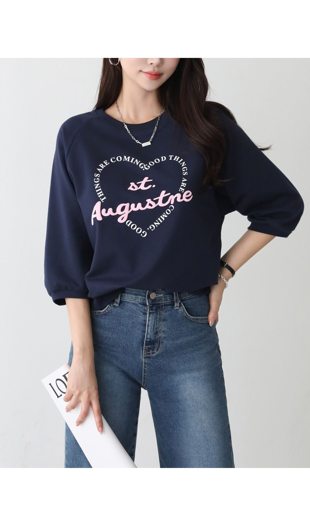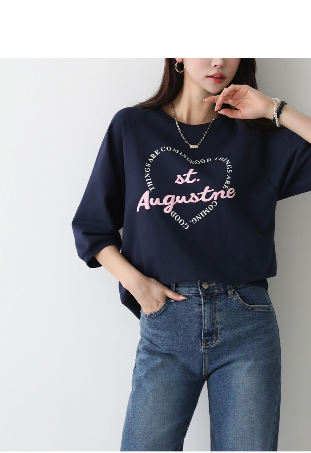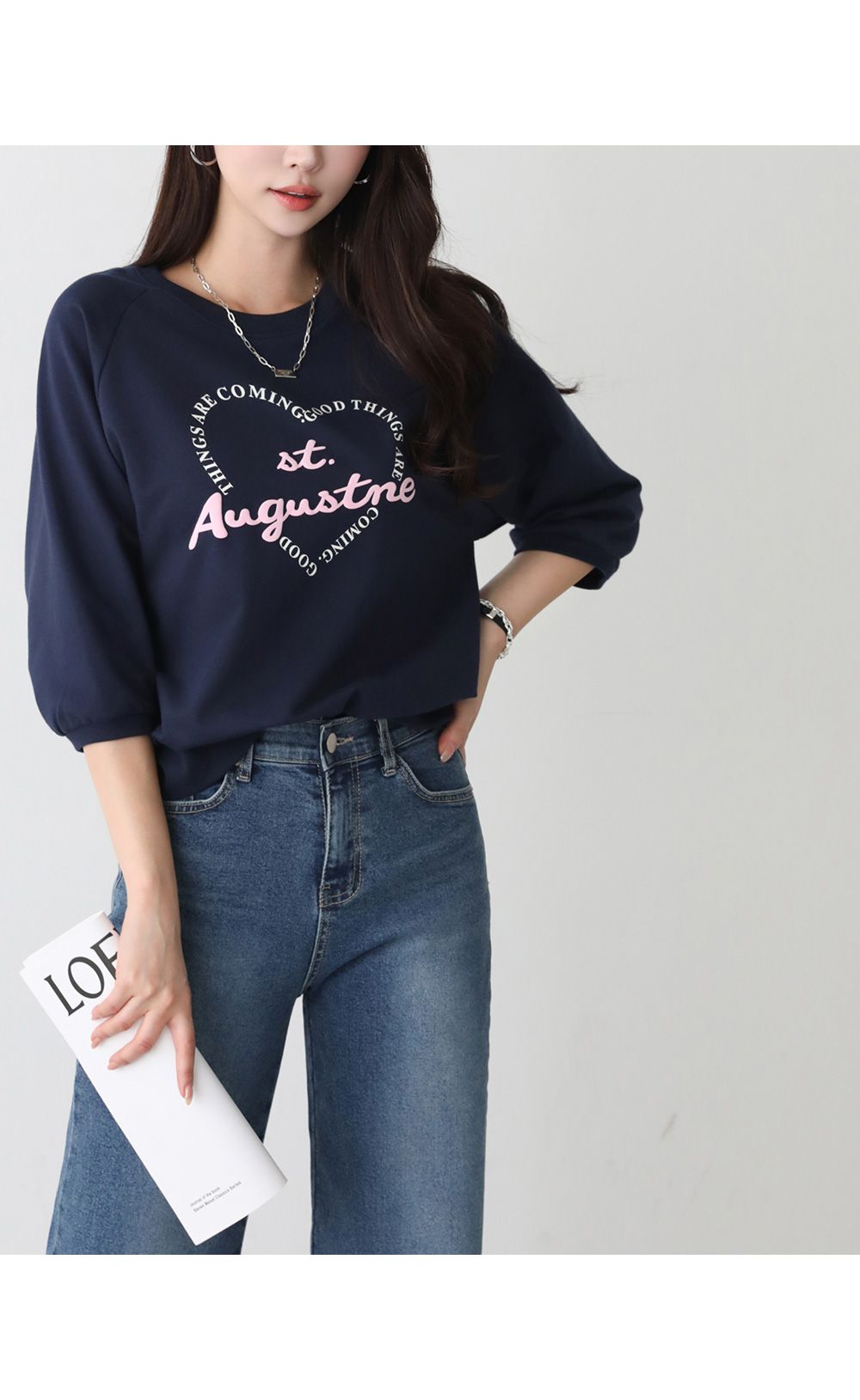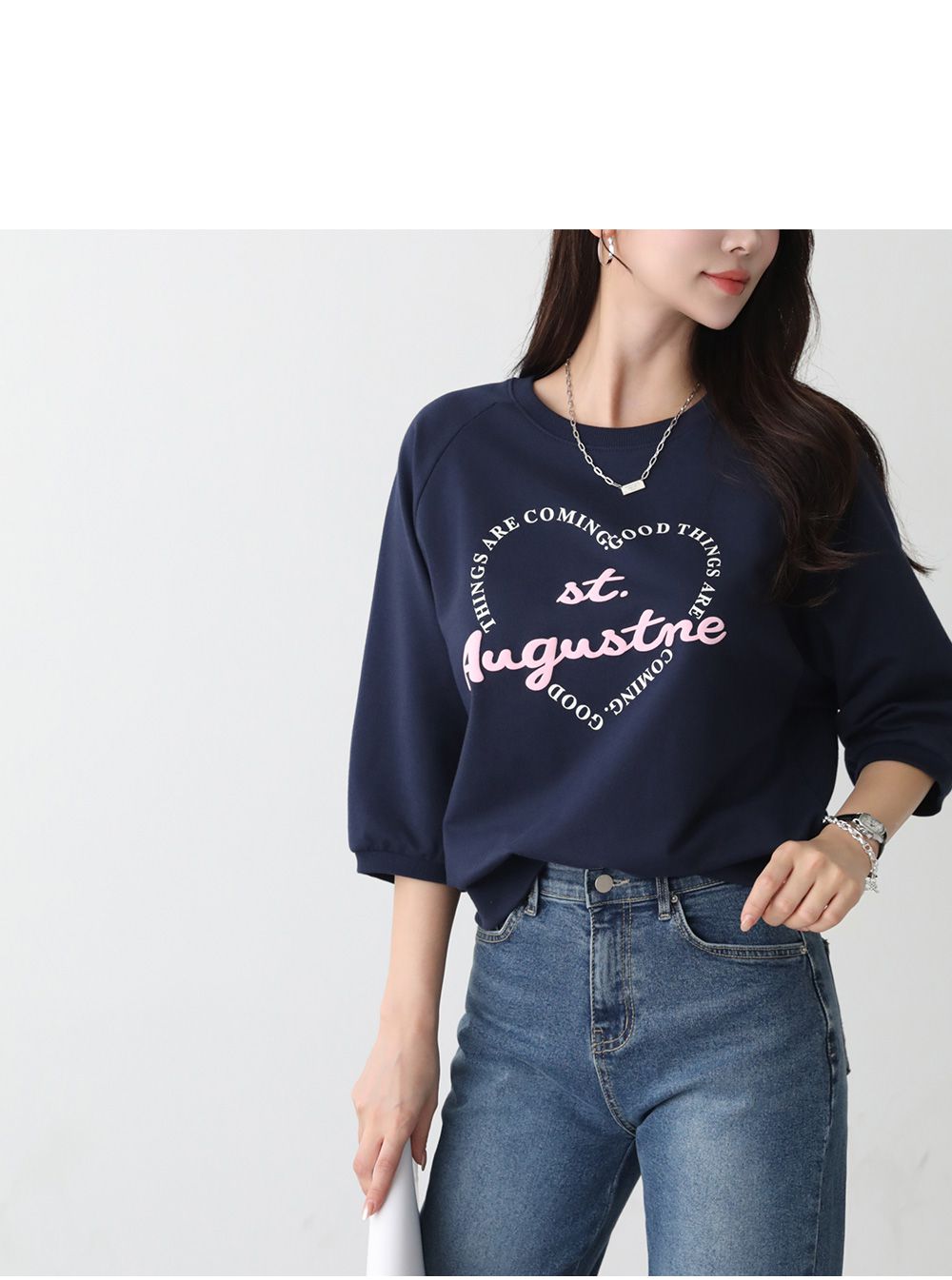 膠印字母/立體泡棉字母/圓領/連肩袖/寬袖 - 休閒居家英文字母上衣字母T恤愛心印花愛心字母T恤七分袖上衣印花上衣深藍色燕麥色綠色