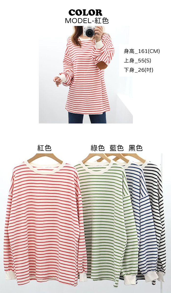 【C55395】韓國MIS 寬鬆條紋上衣-補丁袖好氣色圓領長版長袖大學T★★