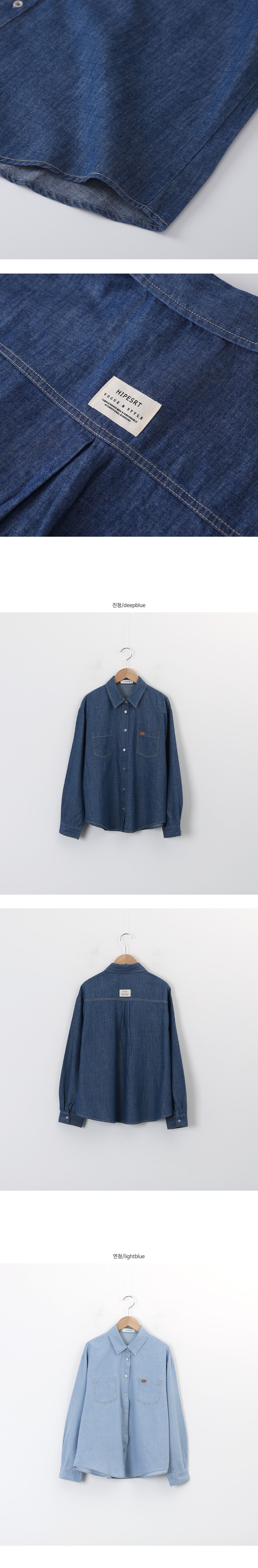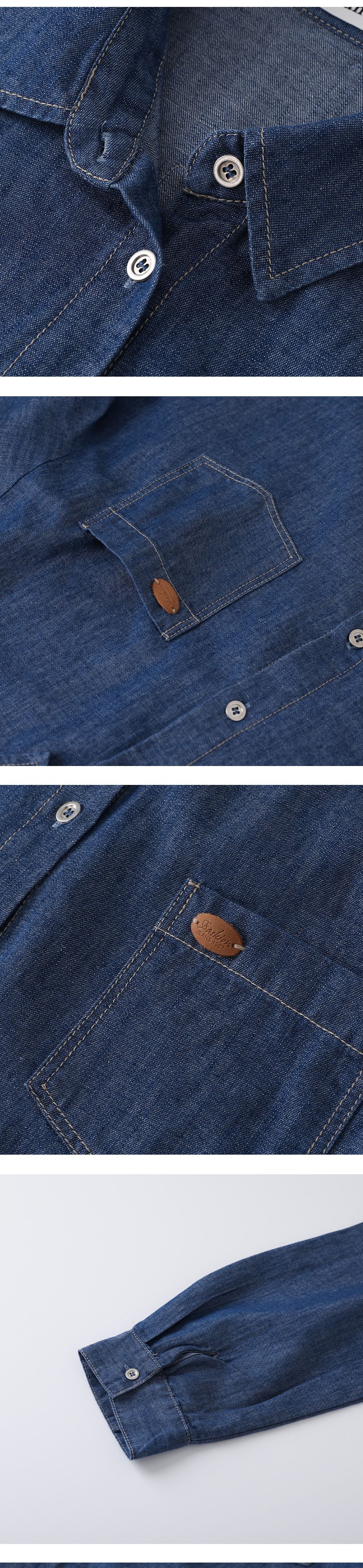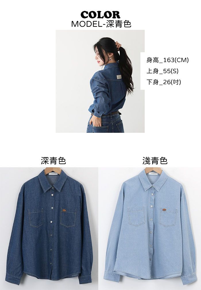 金屬鈕釦/開襟排釦/雙口袋襯衫/皮革標籤/字母布標/後背打褶/弧形下襬 - 休閒居家英文字母上衣皮標牛仔襯衫上衣長袖襯衫長袖上衣深青色淺青色
