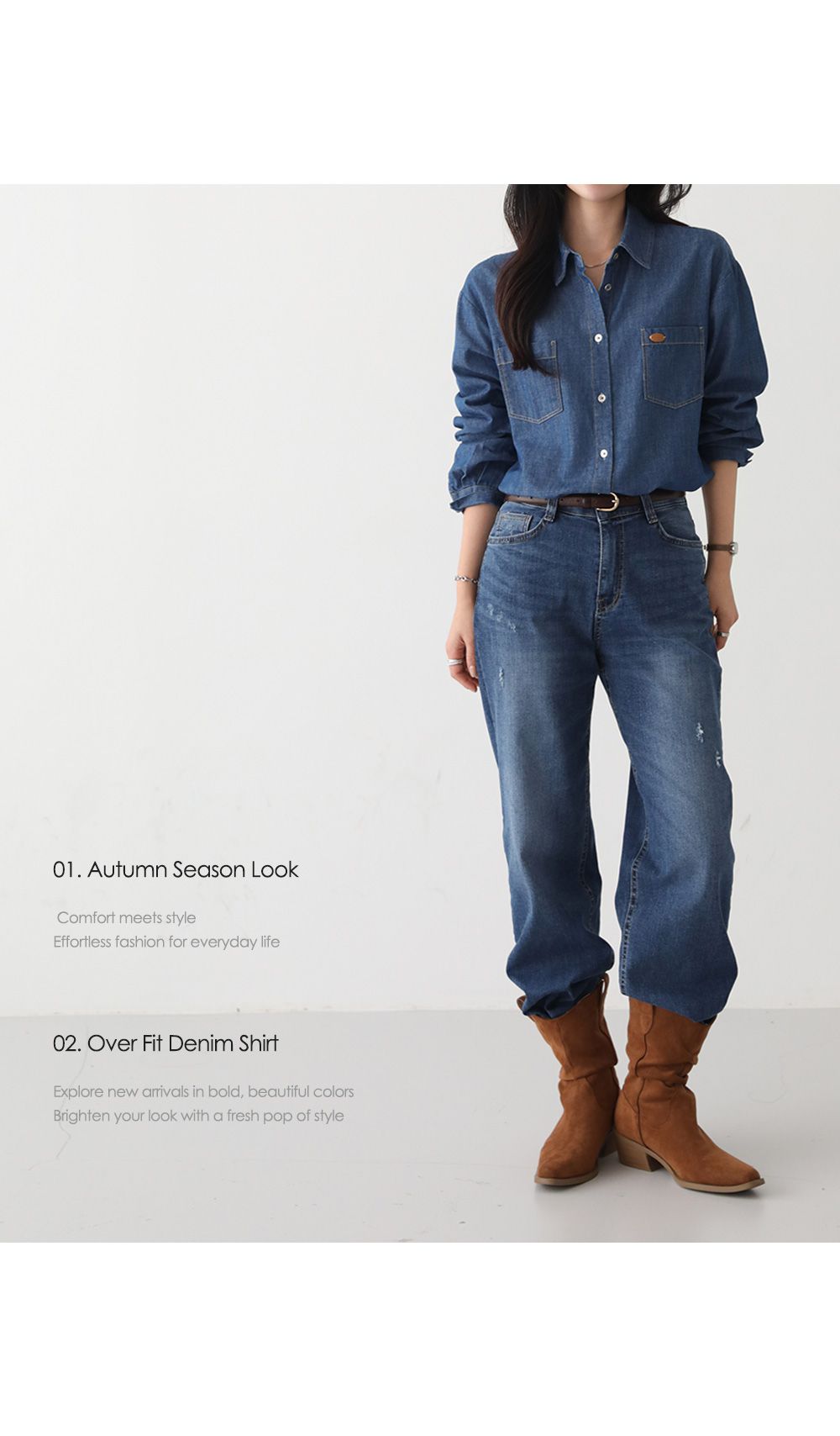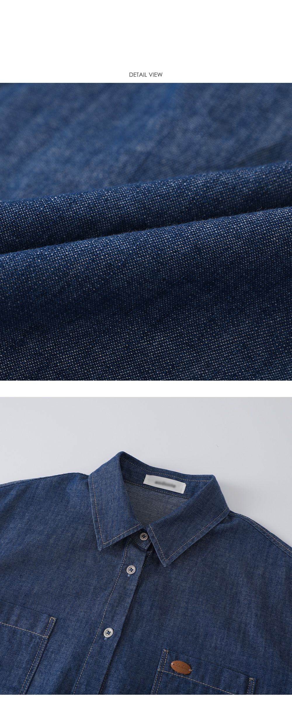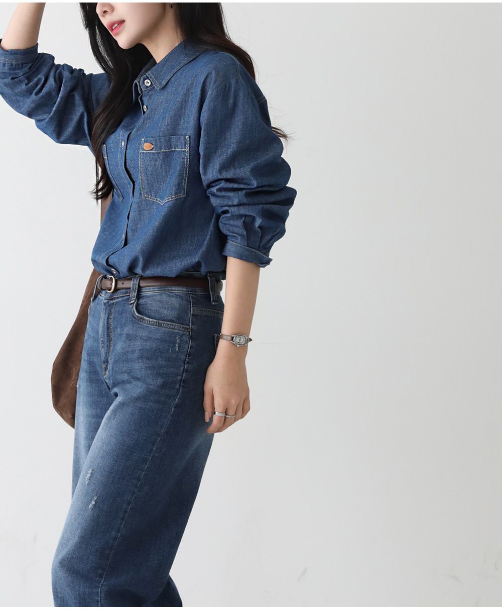 金屬鈕釦/開襟排釦/雙口袋襯衫/皮革標籤/字母布標/後背打褶/弧形下襬 - 休閒居家英文字母上衣皮標牛仔襯衫上衣長袖襯衫長袖上衣深青色淺青色