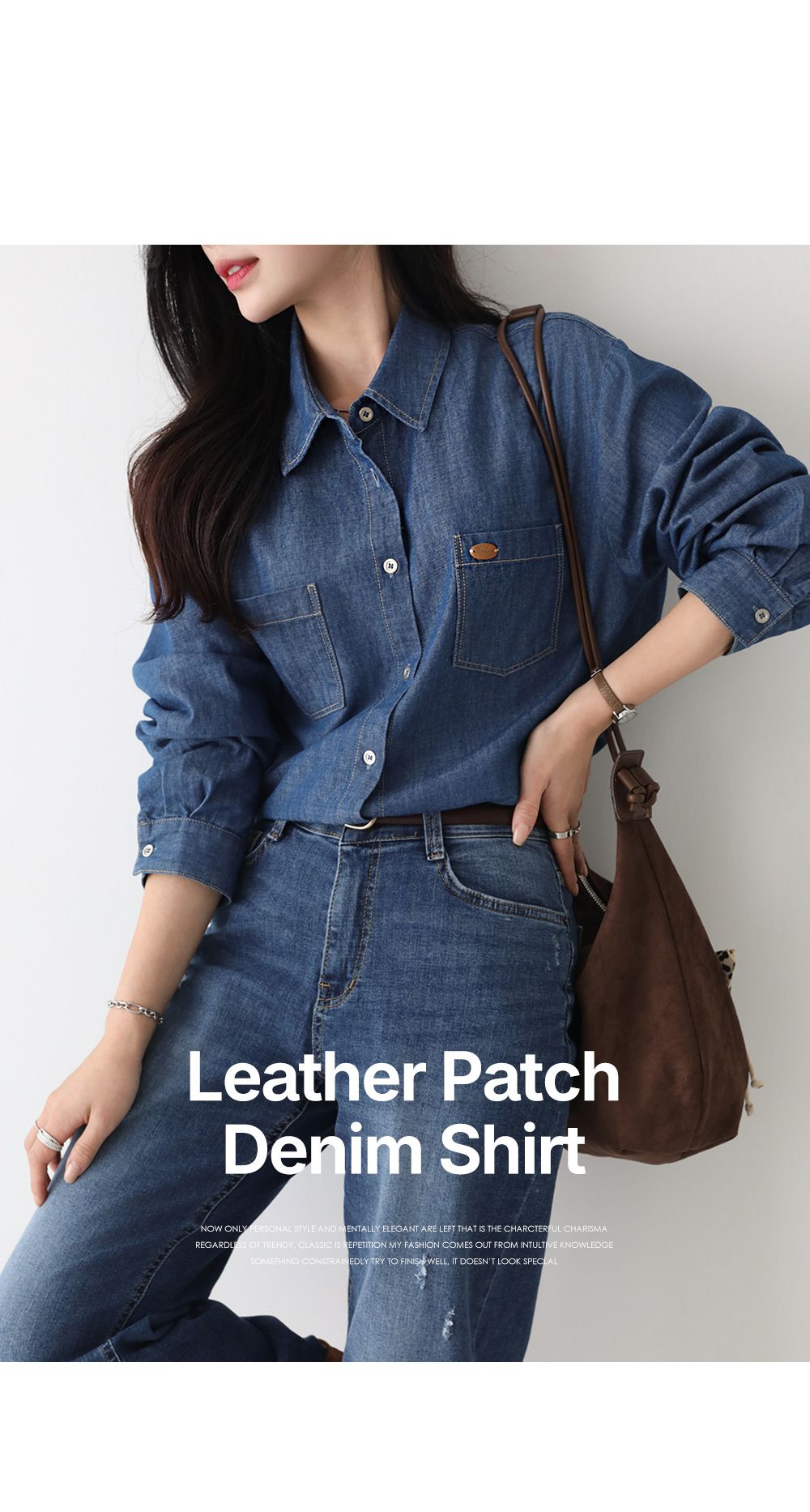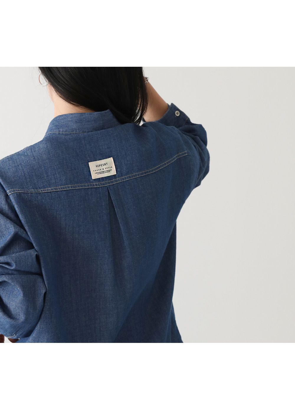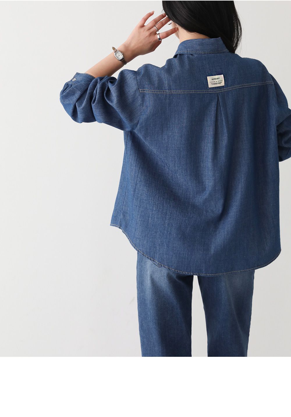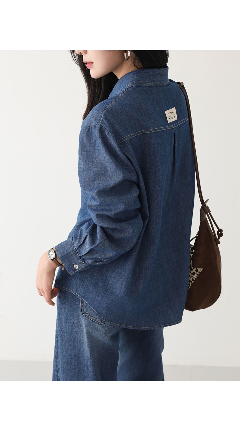 【C55448】韓國PPI 皮標牛仔襯衫-後字母布標弧形下襬雙口袋長袖上衣