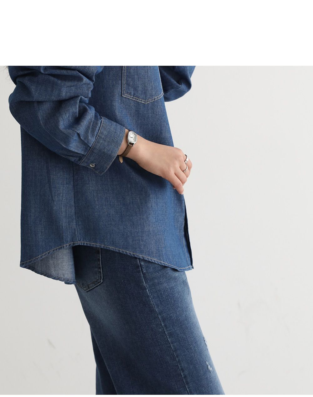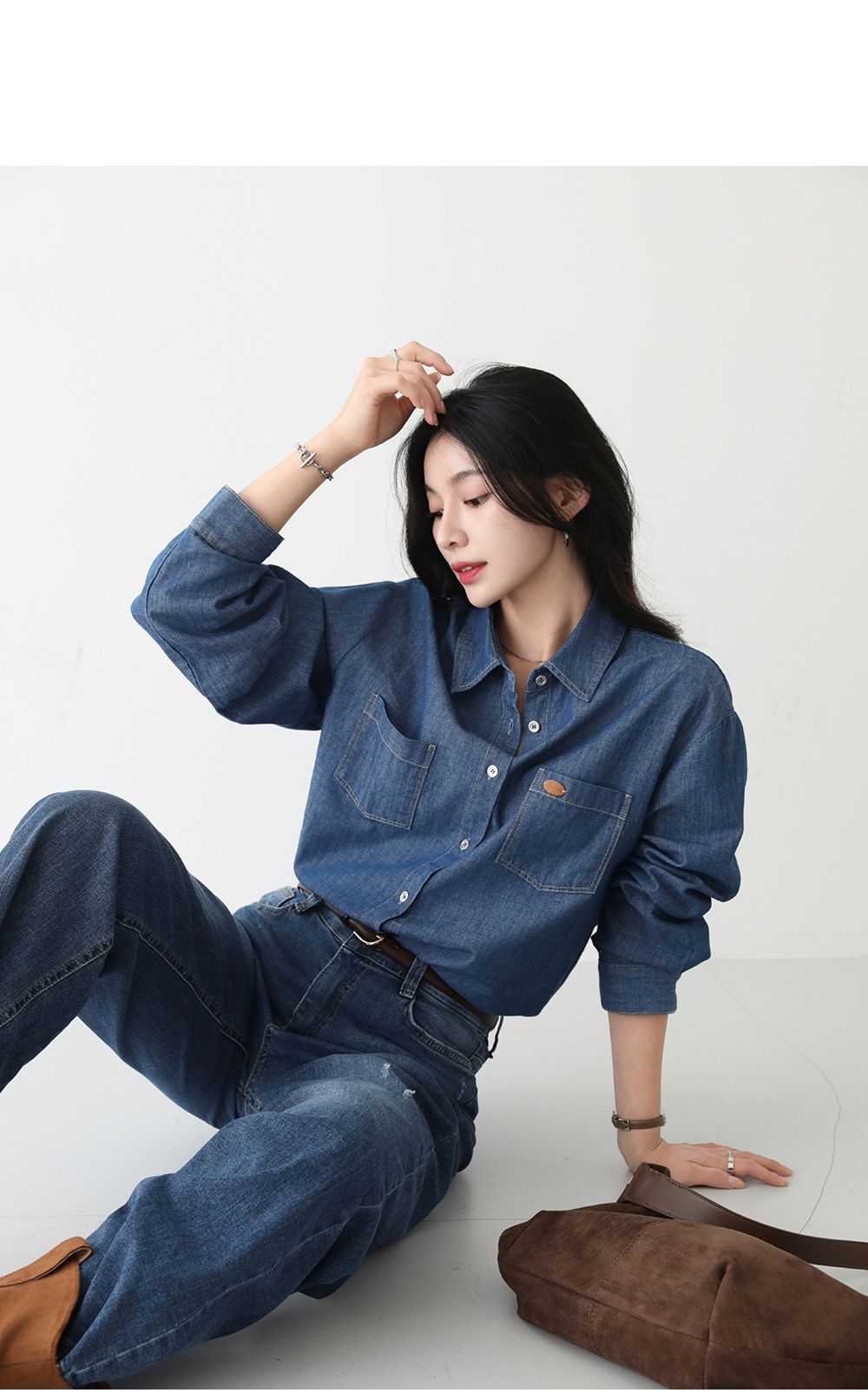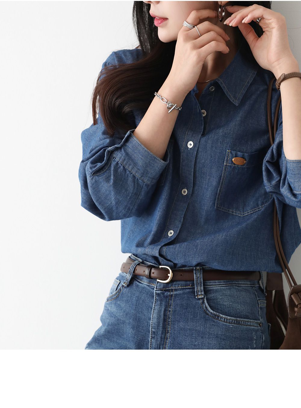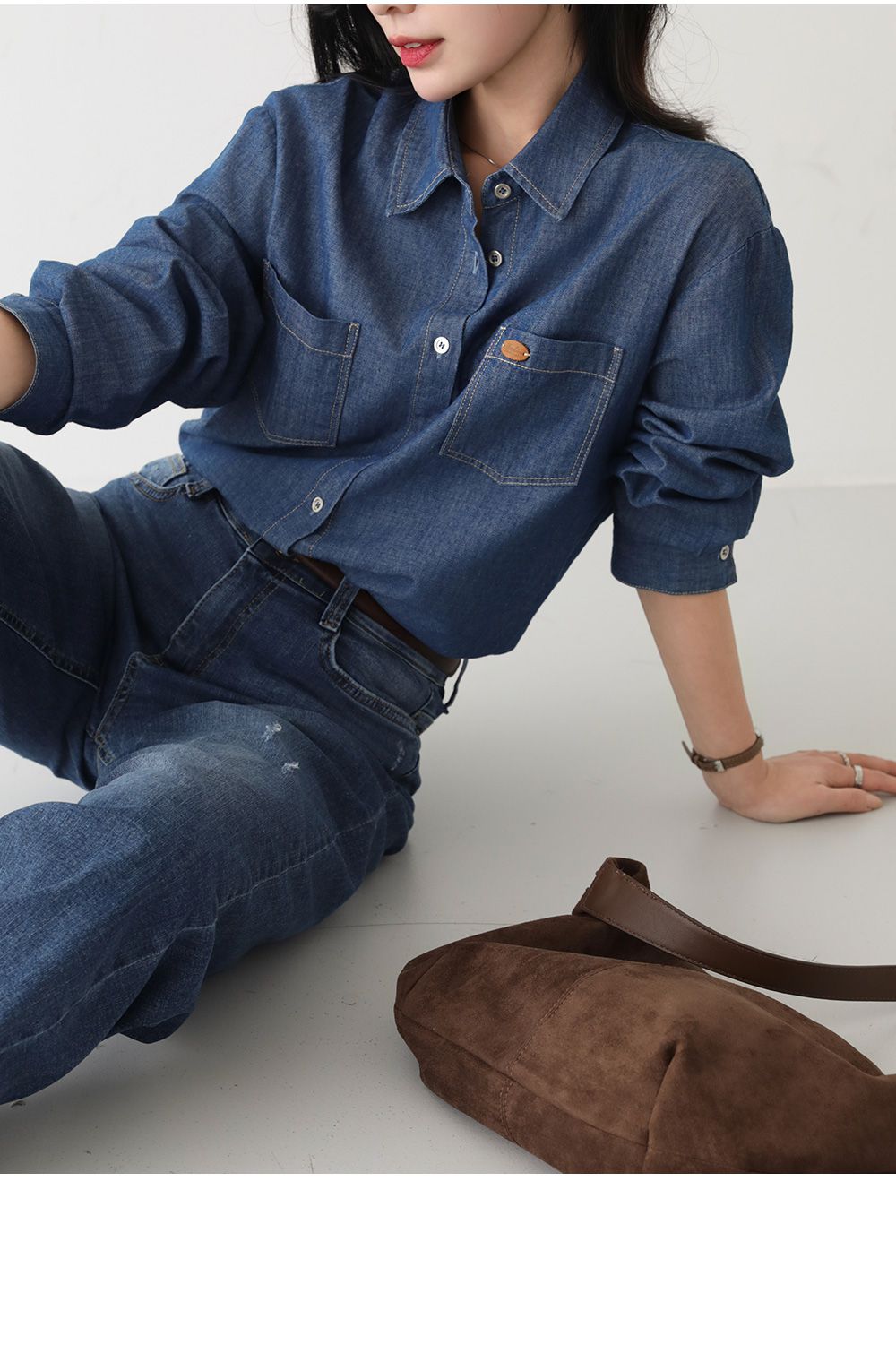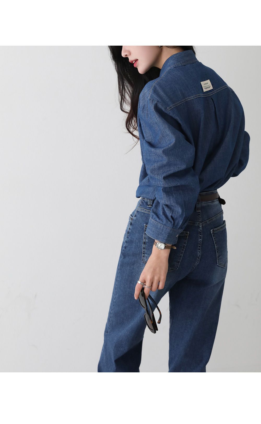 【C55448】韓國PPI 皮標牛仔襯衫-後字母布標弧形下襬雙口袋長袖上衣