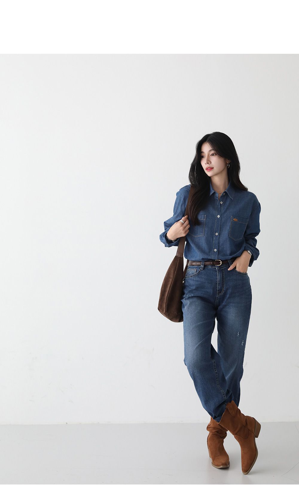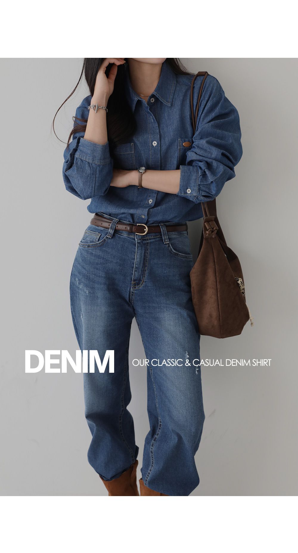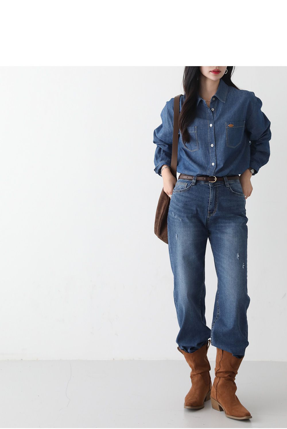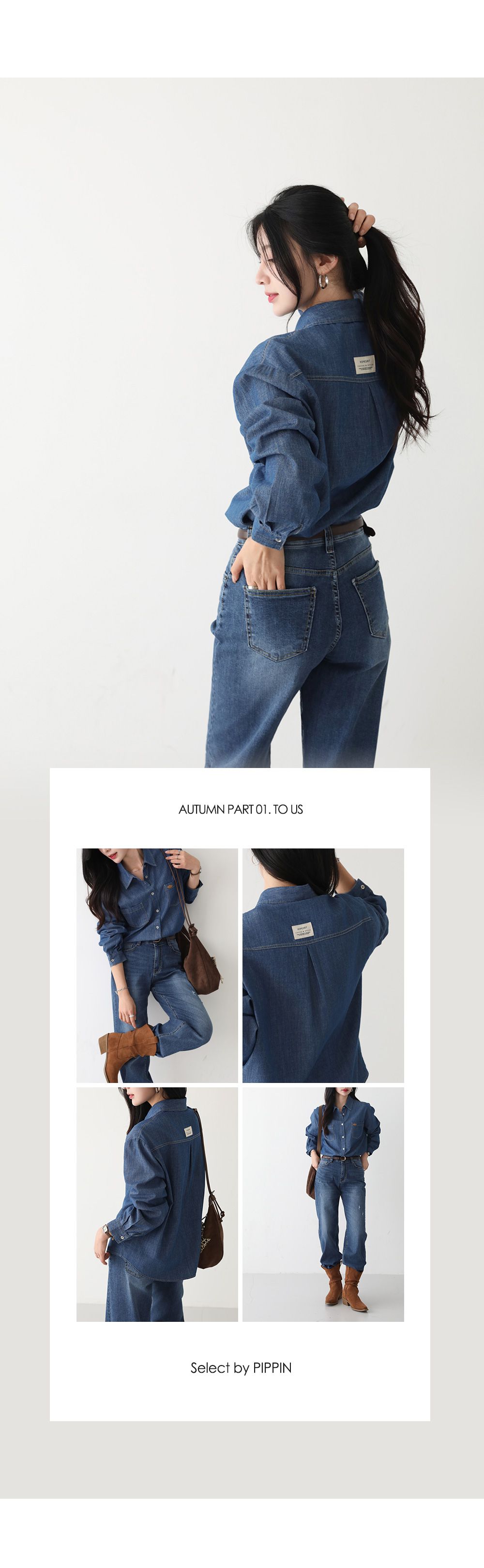 【C55448】韓國PPI 皮標牛仔襯衫-後字母布標弧形下襬雙口袋長袖上衣