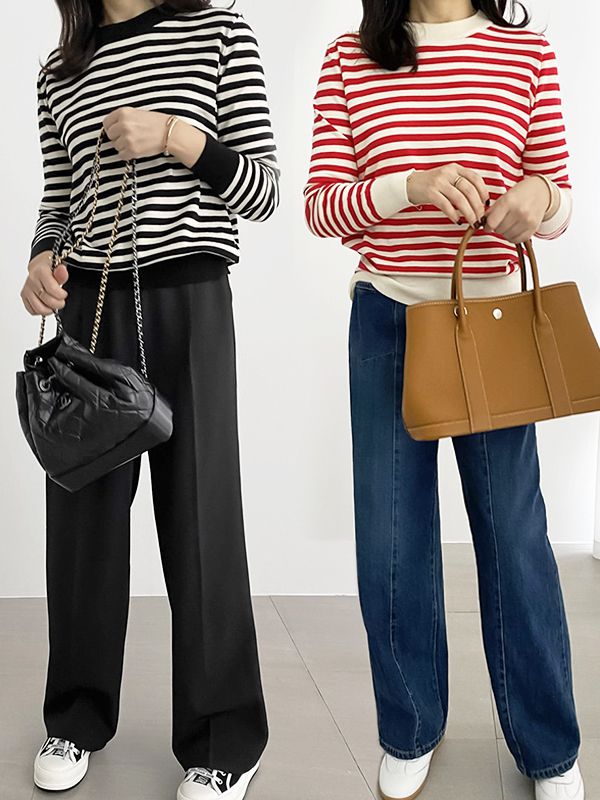 加寬滾邊圓領/橫條紋/保暖混羊毛面料 - 休閒居家渡假配色條紋上衣加寬圓領針織衫針織上衣經典橫條紋混羊毛好氣色長袖上衣黑色奶油色紅色