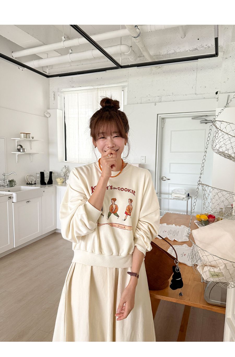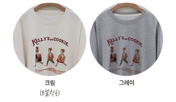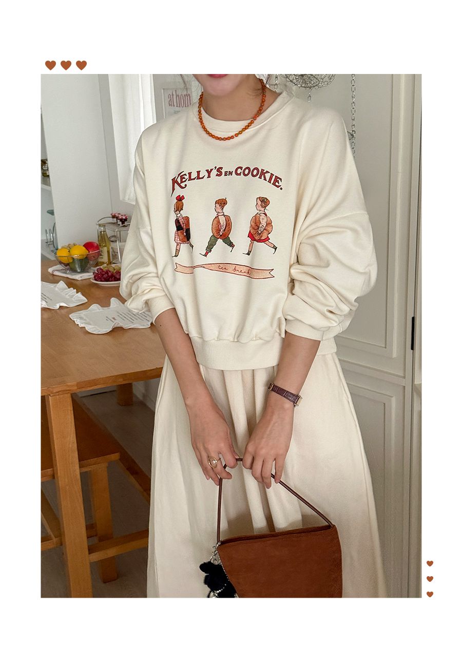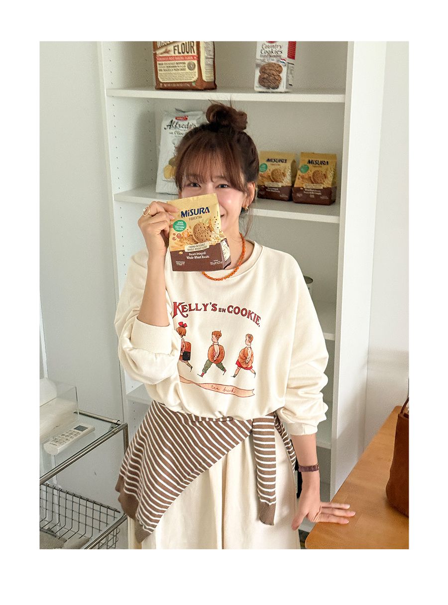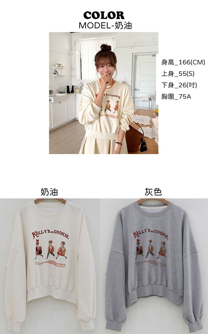 純棉面料好透氣/復古童趣印花超吸睛/百元單品高CP值-餅乾小夥伴圓領寬鬆短版童趣印花長袖大學T上衣奶油色灰色