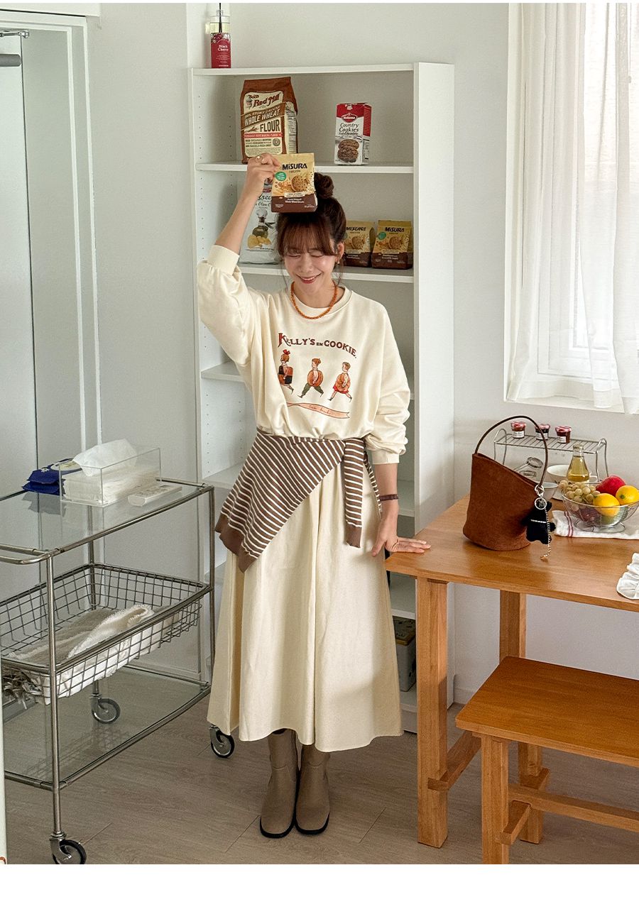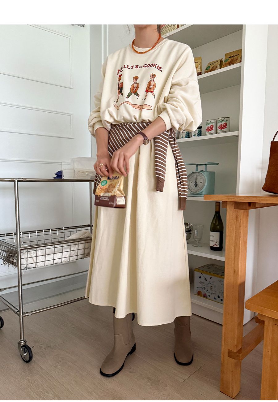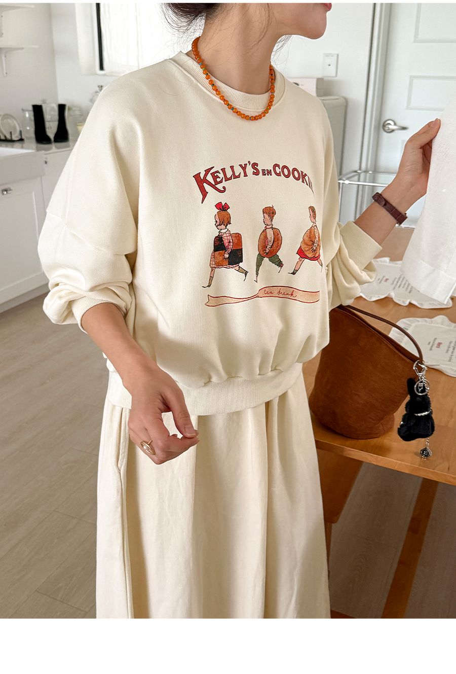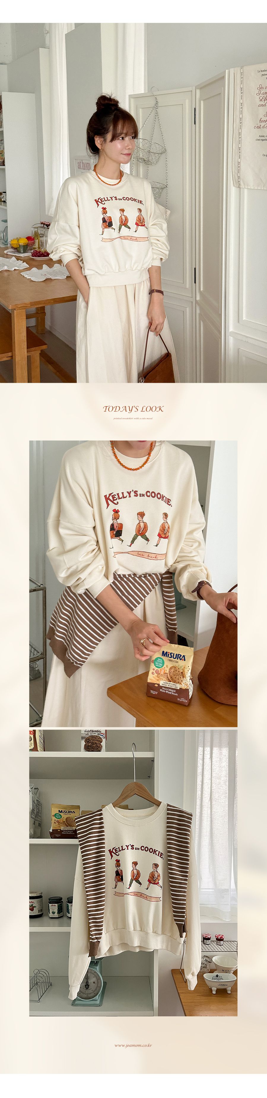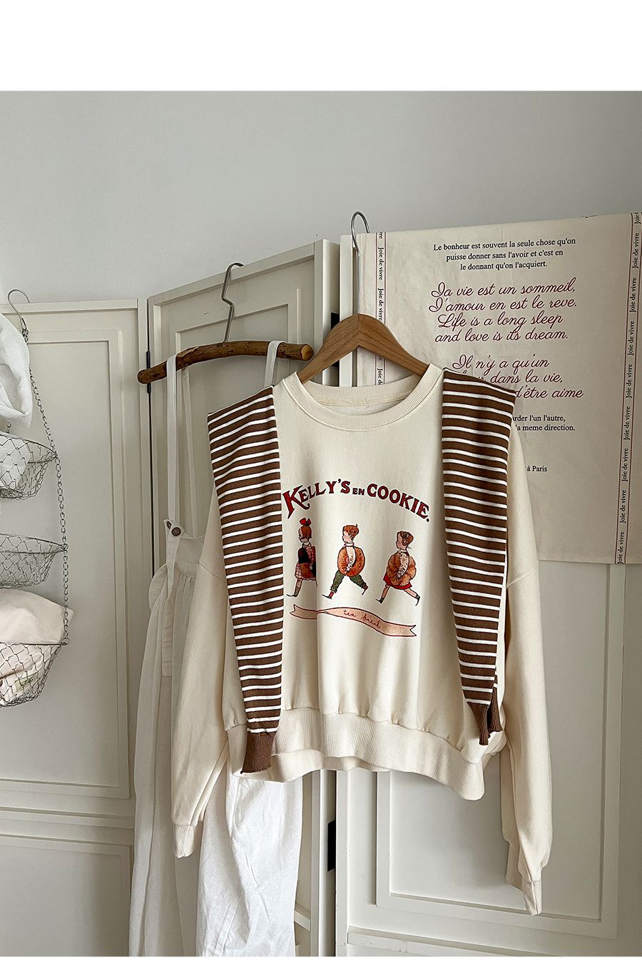純棉面料好透氣/復古童趣印花超吸睛/百元單品高CP值-餅乾小夥伴圓領寬鬆短版童趣印花長袖大學T上衣奶油色灰色