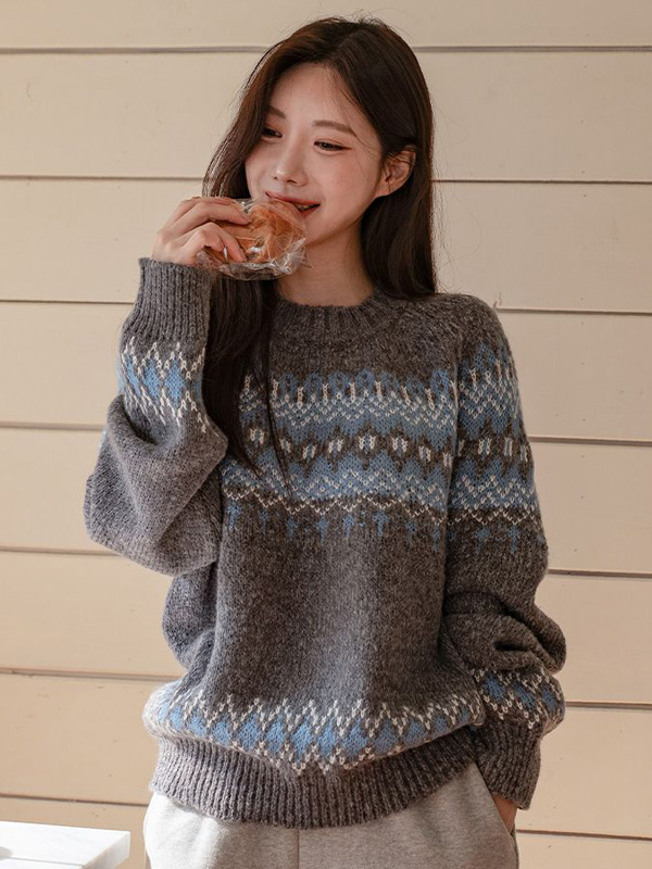 【C55792】韓國CAN 北歐風針織衫-圖騰印花圓領寬鬆蓬鬆連肩長袖上衣_影片★★