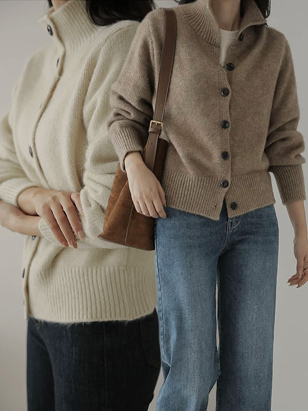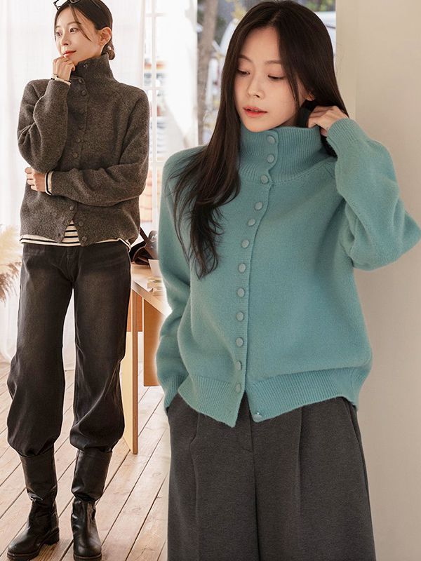 【C55807】韓國CAN 高領排釦開襟衫-素面立領布釦長袖針織上衣外套_影片★★