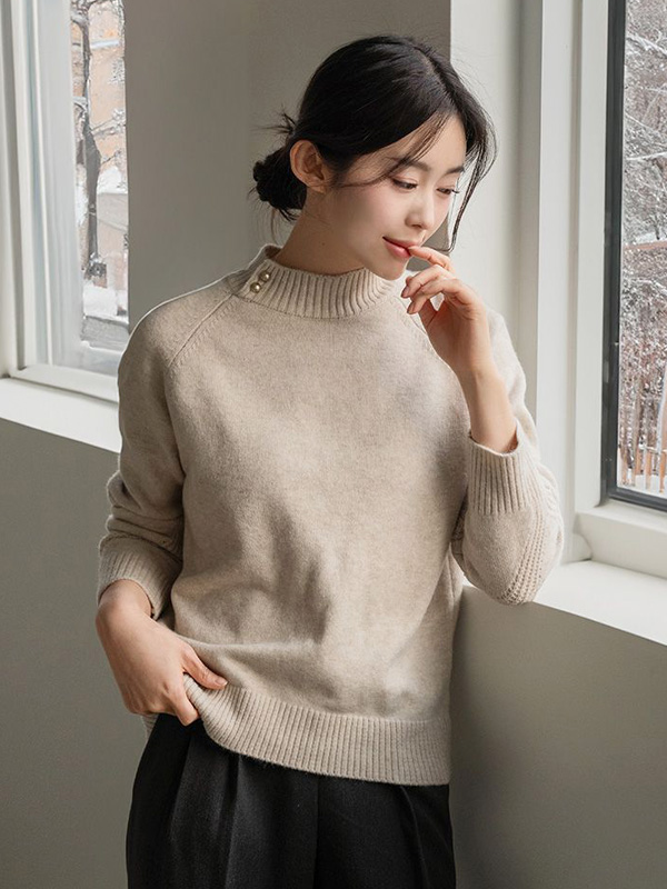 【C55881】韓國CAN 金釦立領針織衫-素面鈕釦造型連肩袖長袖上衣★★