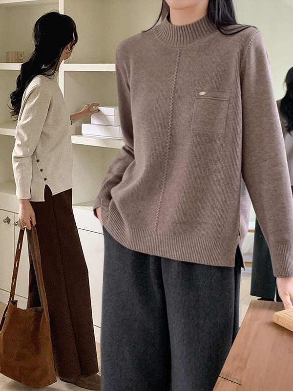 【C55890】韓國MCD 排釦腰針織衫-素面立領假口袋側開衩長袖上衣★★