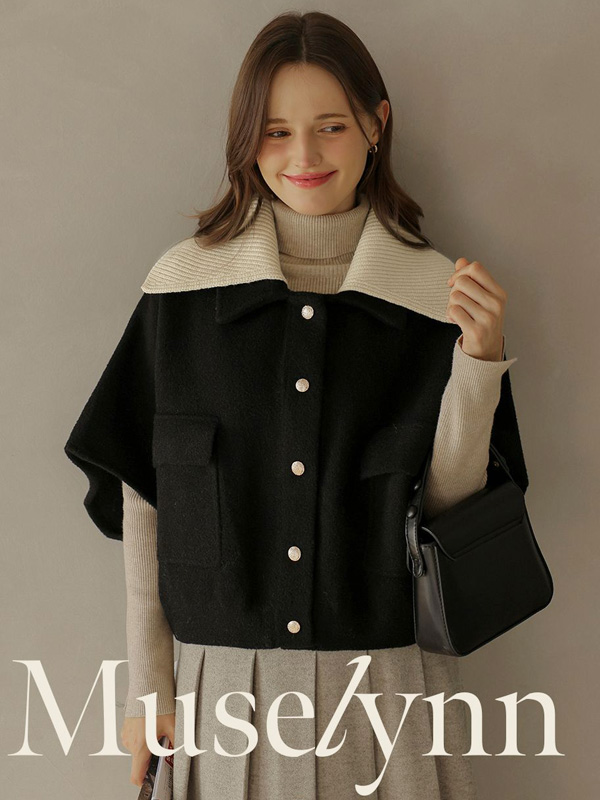 【C55892】韓國MID 假兩件斗篷外套-素面撞色翻領飛鼠五分袖針織大衣★★