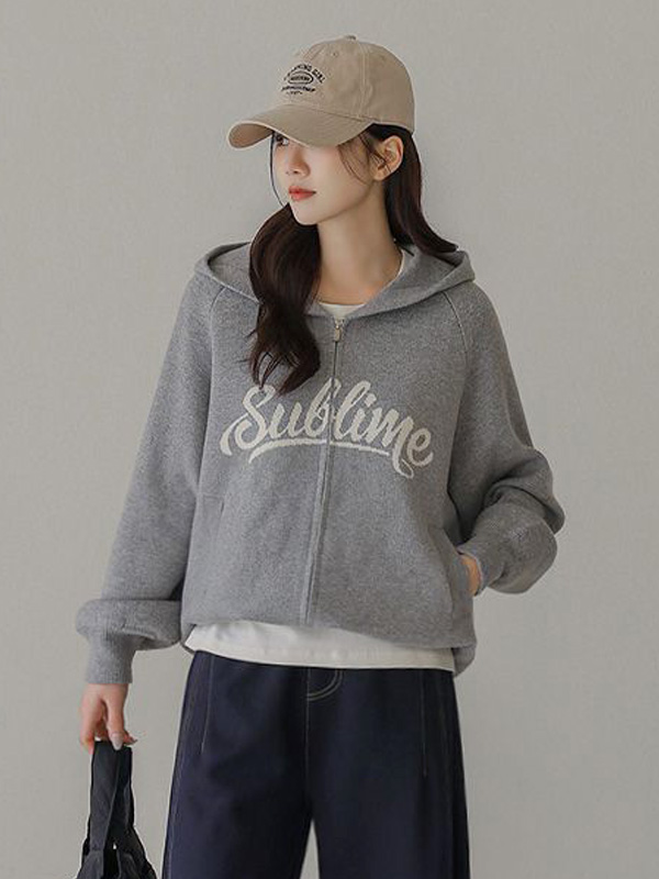 【C55898】韓國CFX 字母連帽外套-草寫英文抽繩收腰長袖拉鍊針織外套★★