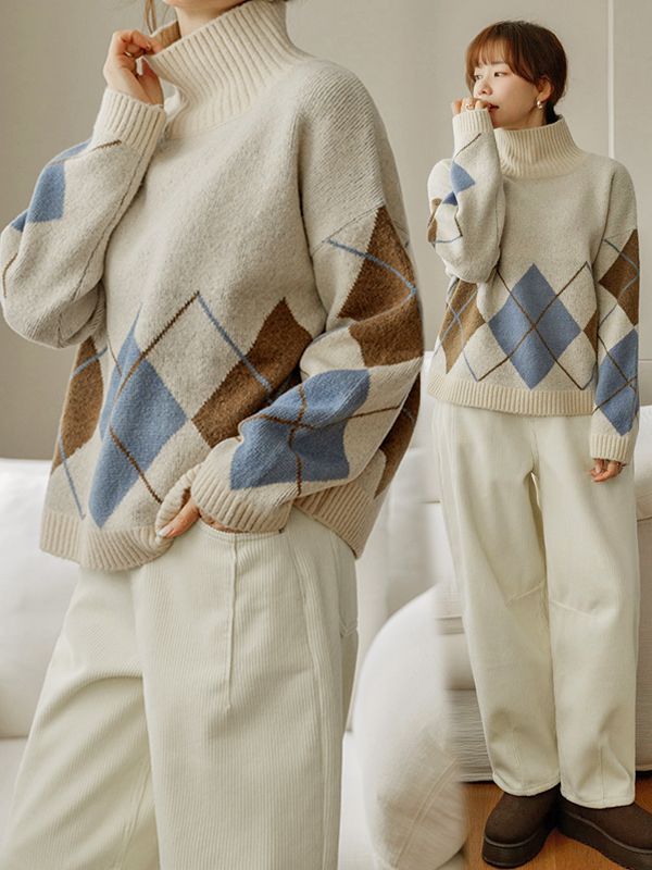【C55900】韓國JAM 菱格針織衫-高領雙色大格紋落肩長袖上衣★★