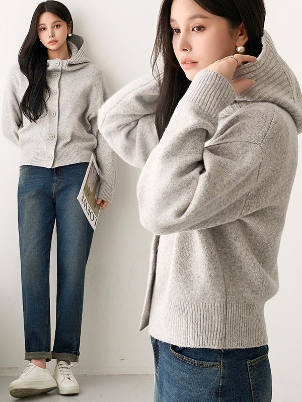 【C55902】韓國PPI 連帽針織外套-素面排釦立領混羊毛寬鬆短版長袖★★