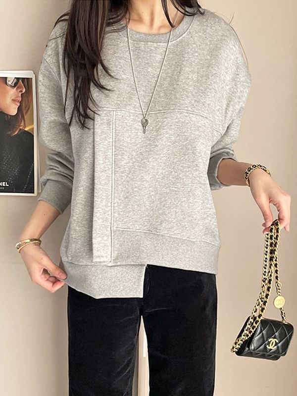【C55903】韓國MNR 不規則切割上衣-素面內刷毛圓領寬鬆長袖大學T★★