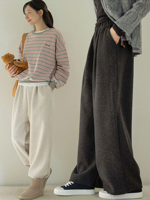 【C55919】韓國MCD 厚磅刷毛寬褲-全腰鬆緊雙口袋內絨毛直筒長褲★★